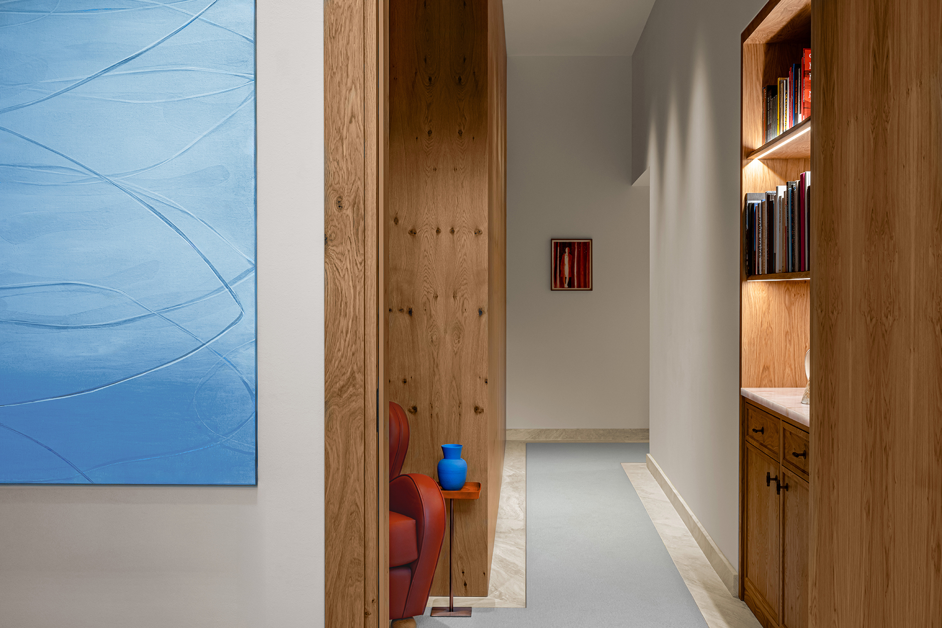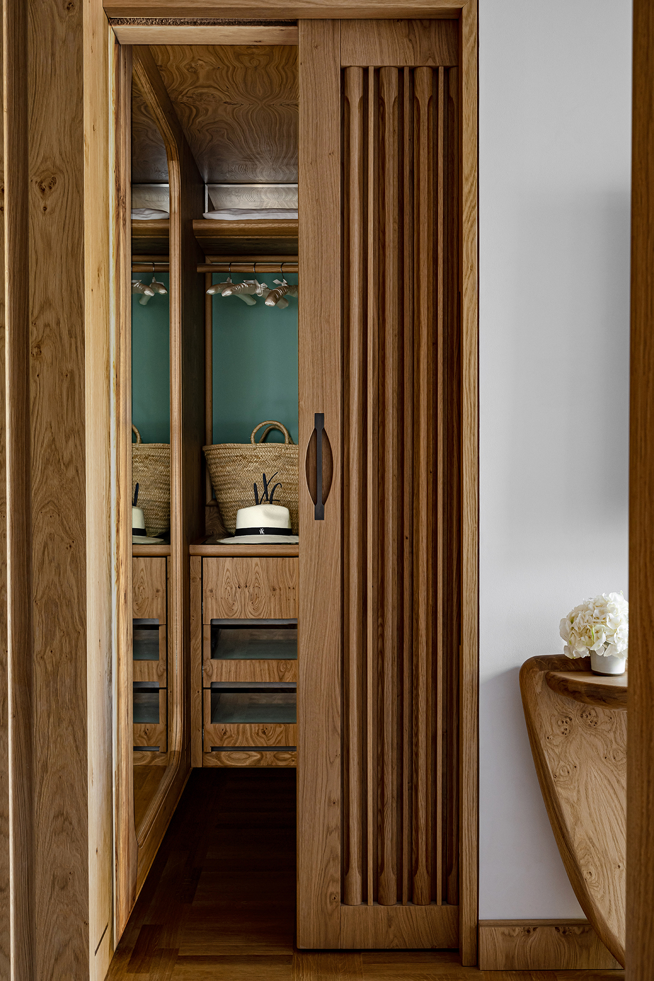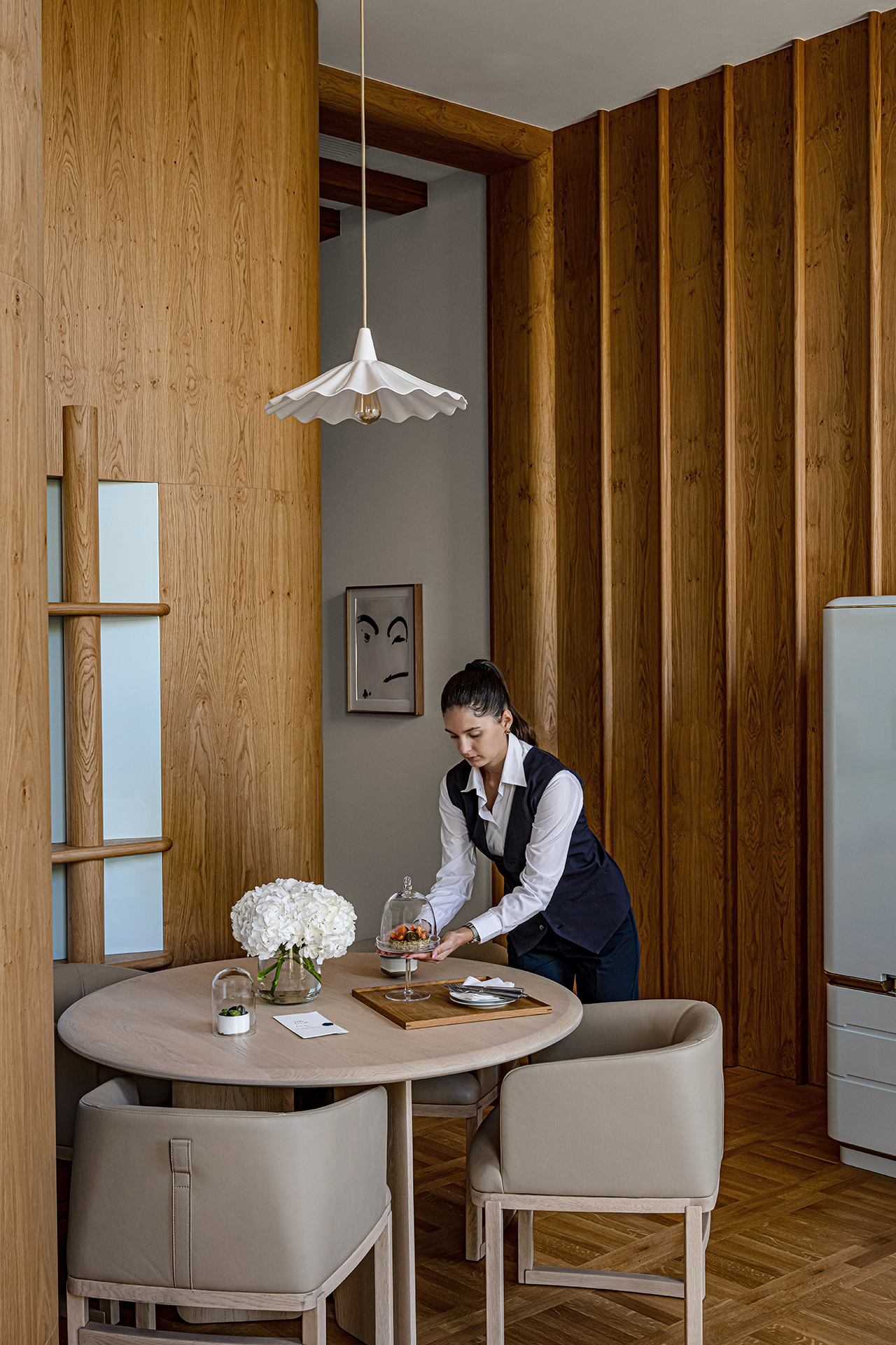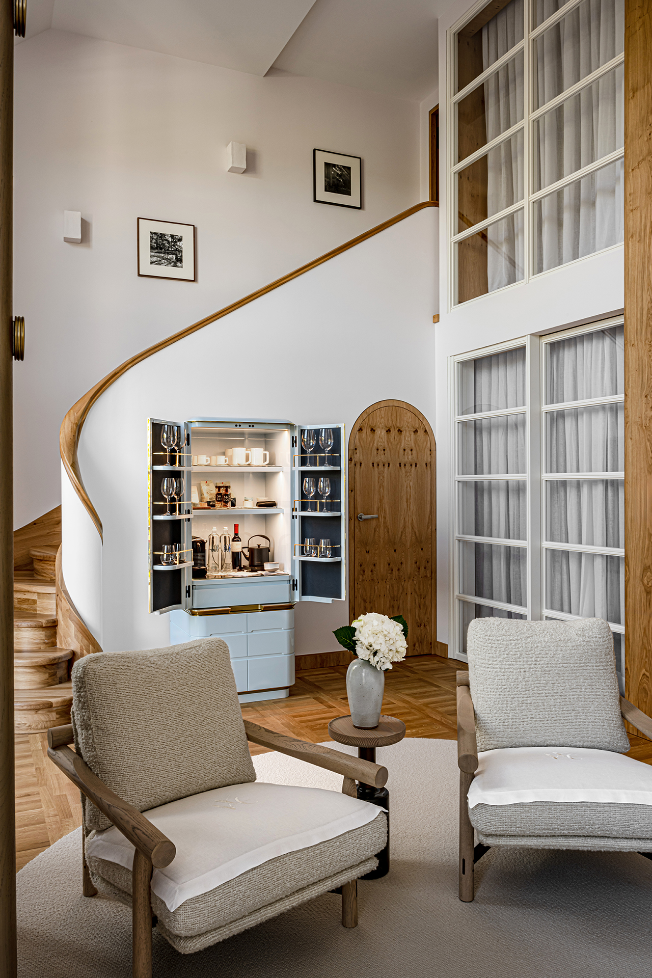 Celý interiér sjednocuje dýha dub očkový přírodní, použitá nejen na nábytku, ale také na obložení stěn a dalších prvcích. Její jedinečná kresba vnáší do prostoru hloubku, hřejivou eleganci a organický charakter. Precizně navazující plochy tvoří harmonický celek nesoucí podpis řemeslného mistrovství, zatímco přírodní materiály podtrhují autenticitu a nadčasovou kvalitu.