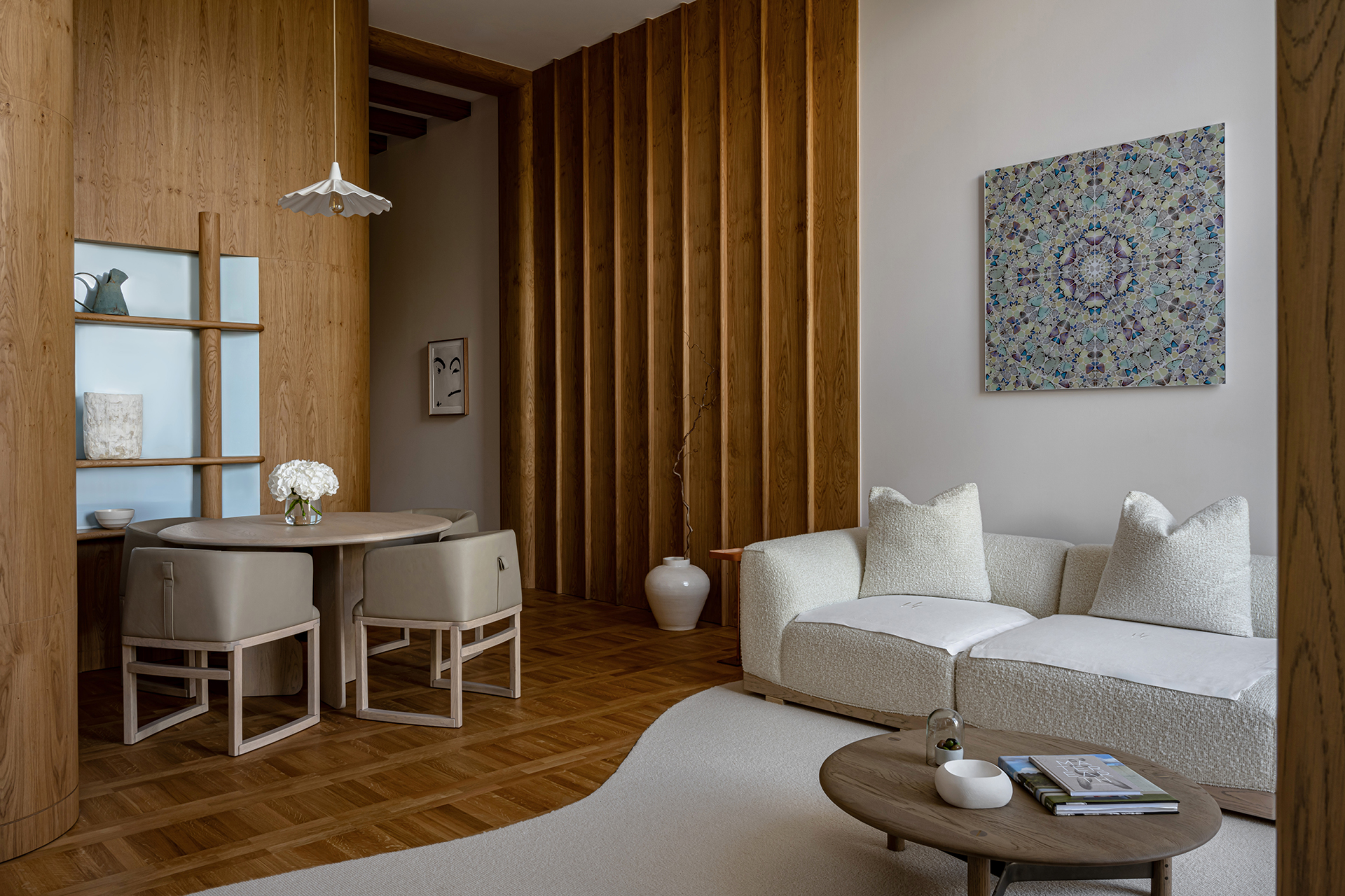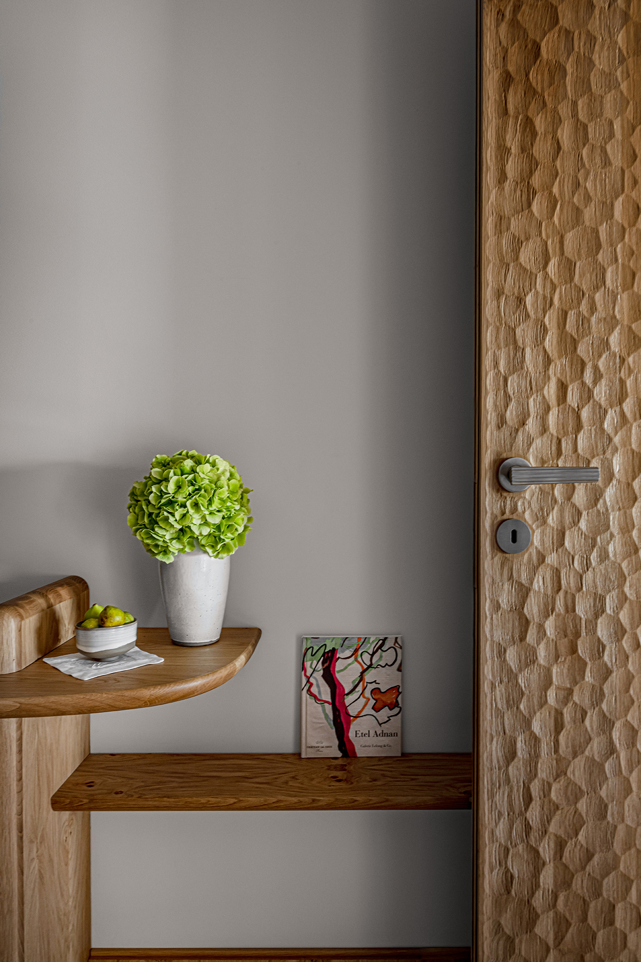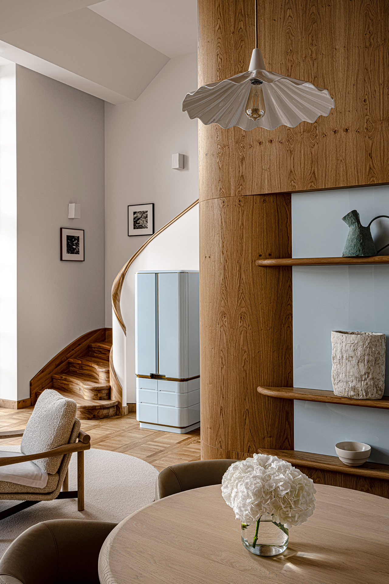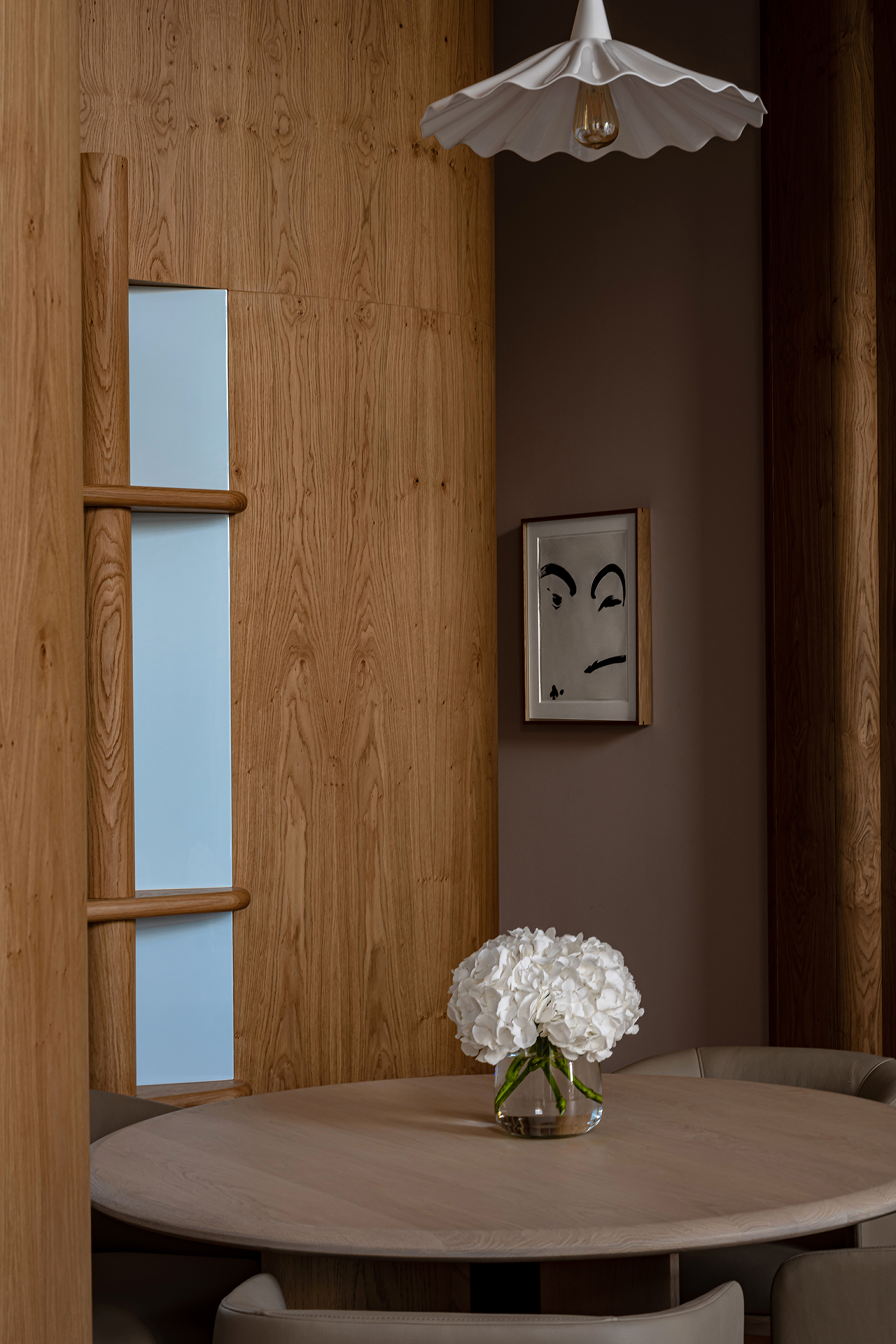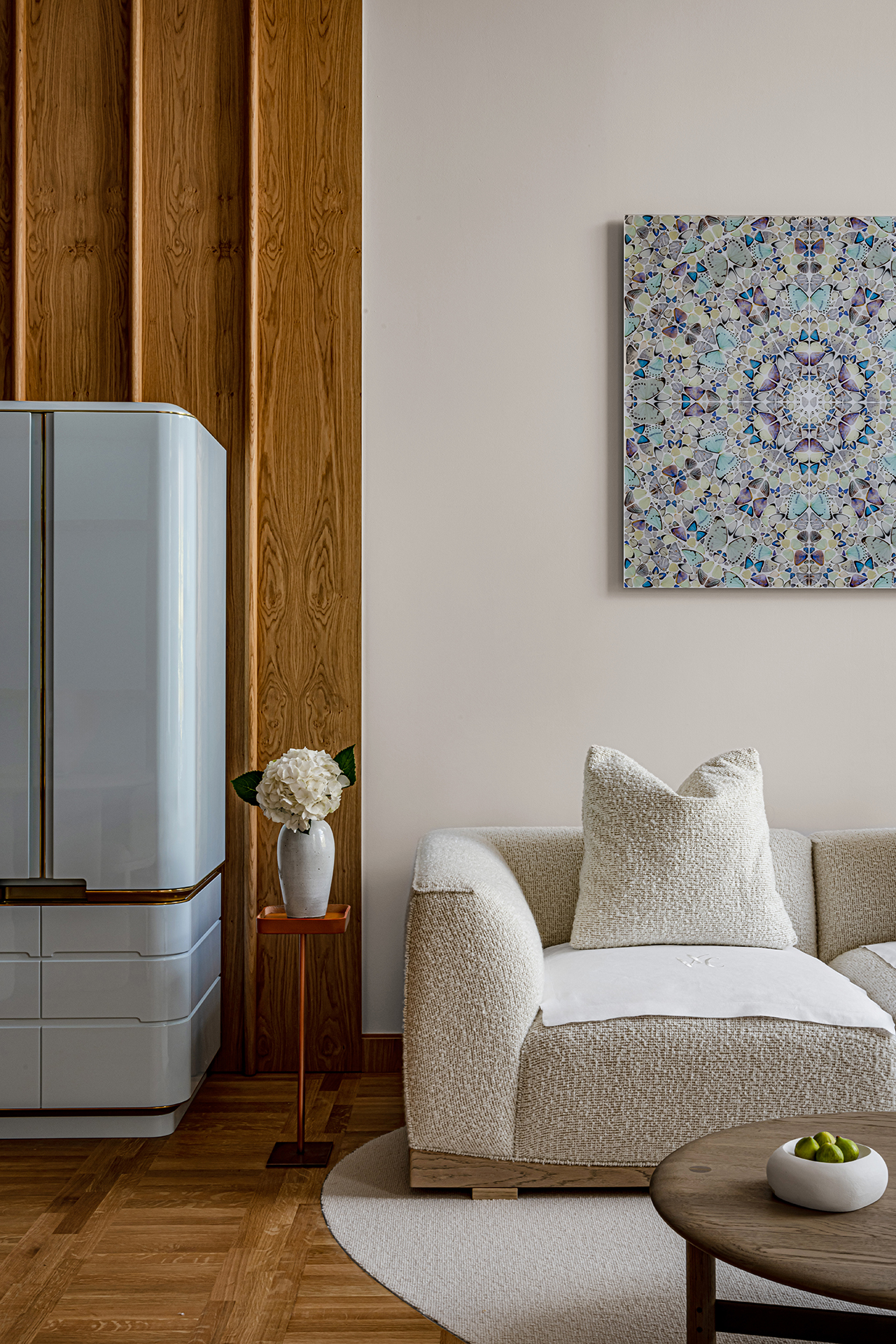 Celý interiér sjednocuje dýha dub očkový přírodní, použitá nejen na nábytku, ale také na obložení stěn a dalších prvcích. Její jedinečná kresba vnáší do prostoru hloubku, hřejivou eleganci a organický charakter. Precizně navazující plochy tvoří harmonický celek nesoucí podpis řemeslného mistrovství, zatímco přírodní materiály podtrhují autenticitu a nadčasovou kvalitu.