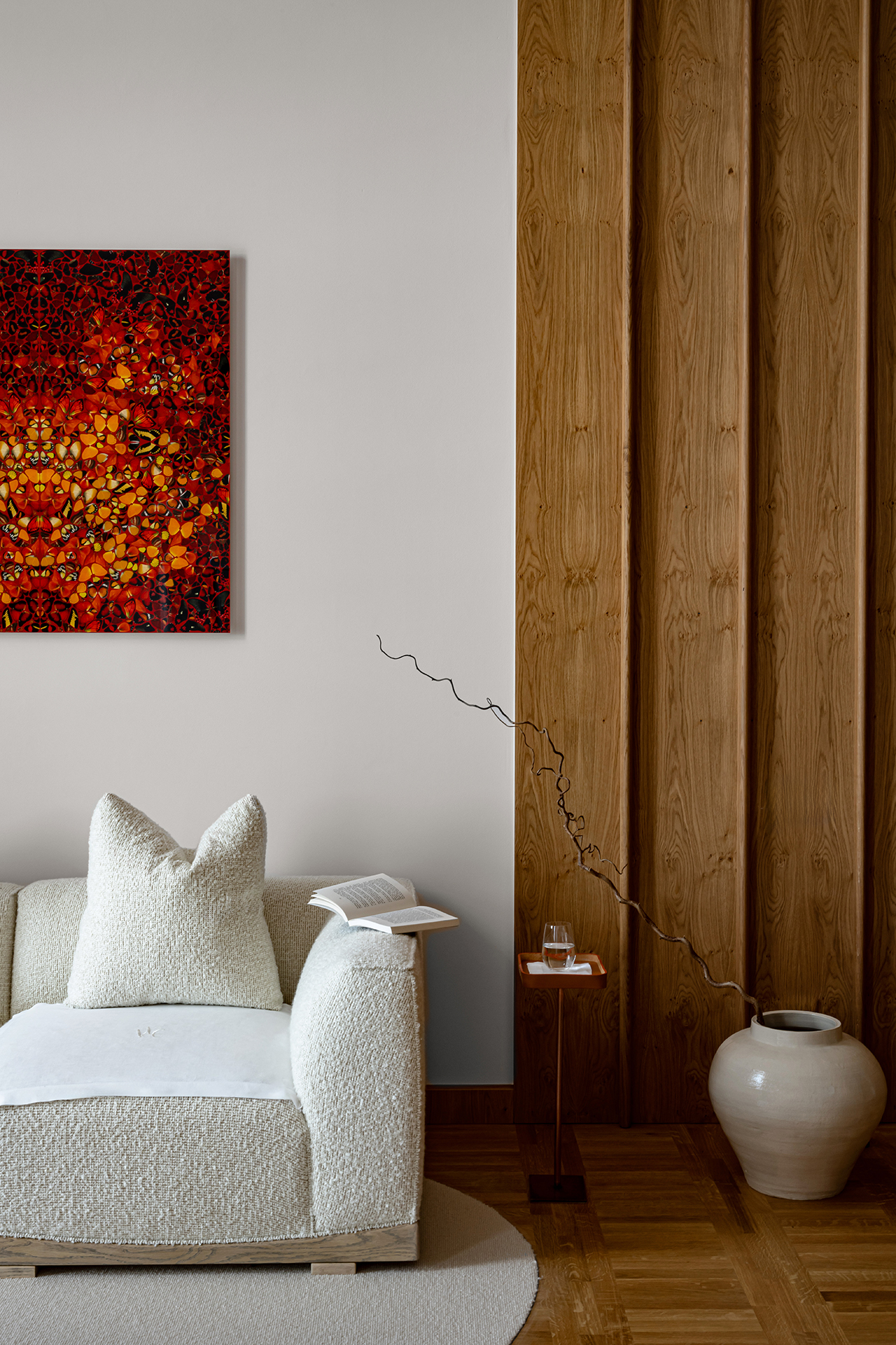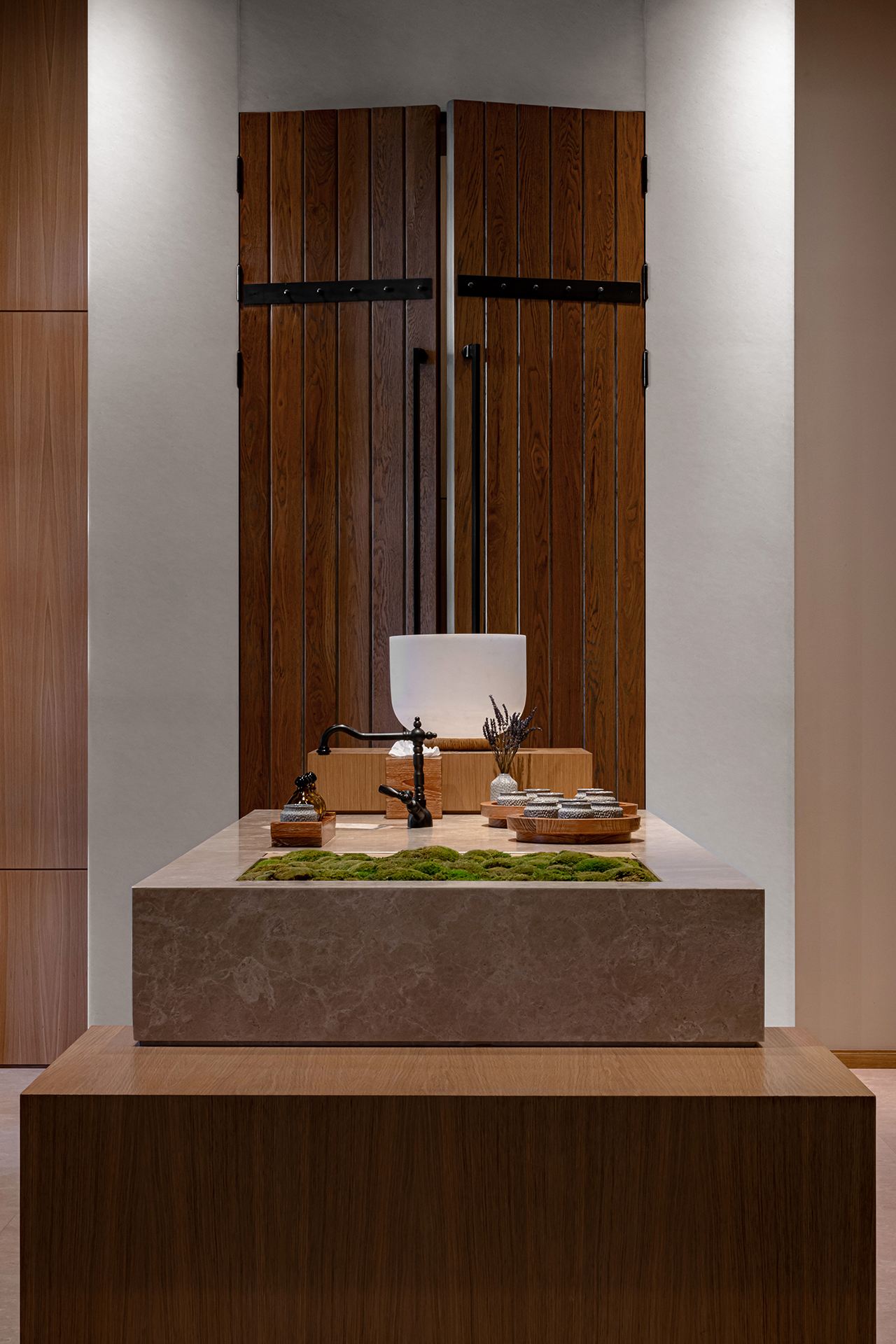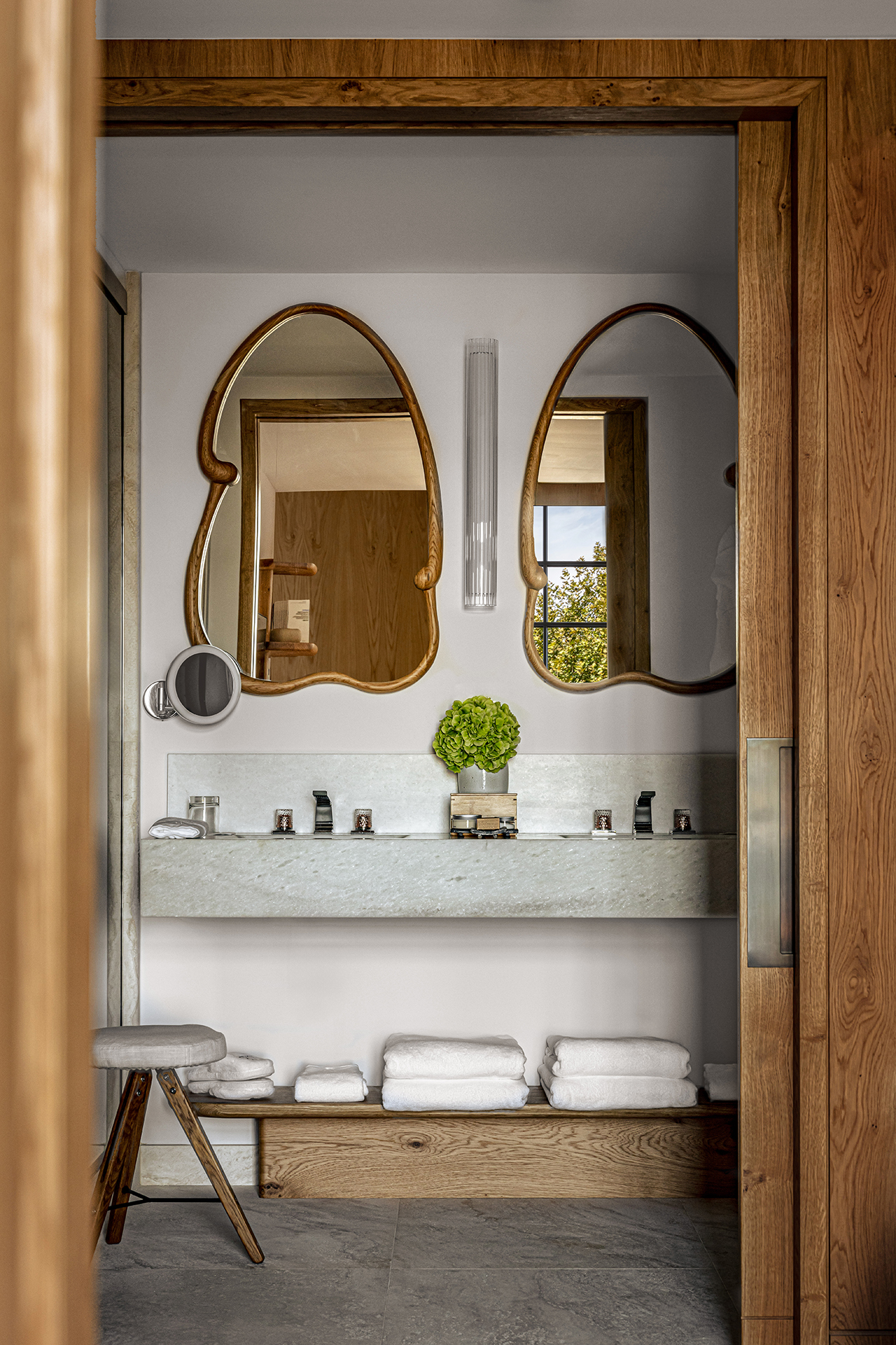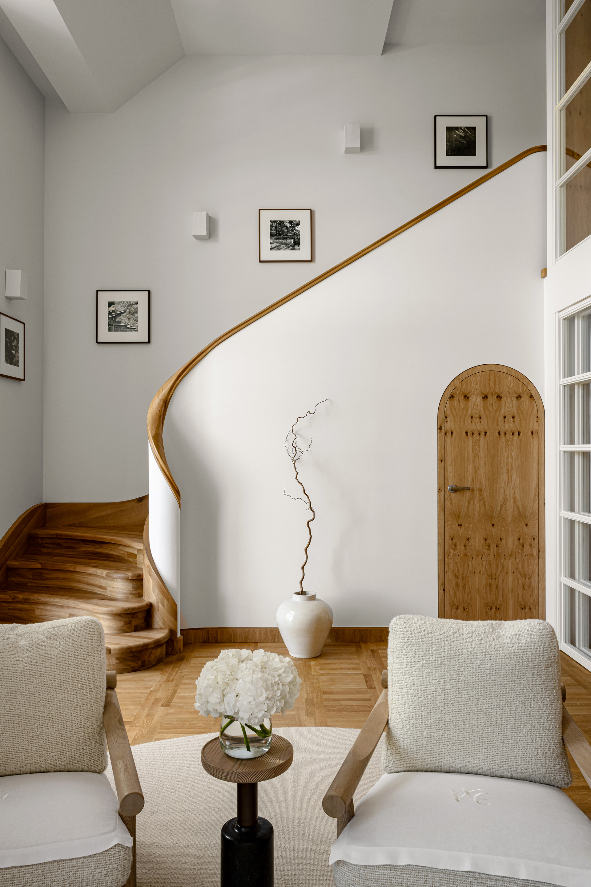 Celý interiér sjednocuje dýha dub očkový přírodní, použitá nejen na nábytku, ale také na obložení stěn a dalších prvcích. Její jedinečná kresba vnáší do prostoru hloubku, hřejivou eleganci a organický charakter. Precizně navazující plochy tvoří harmonický celek nesoucí podpis řemeslného mistrovství, zatímco přírodní materiály podtrhují autenticitu a nadčasovou kvalitu.