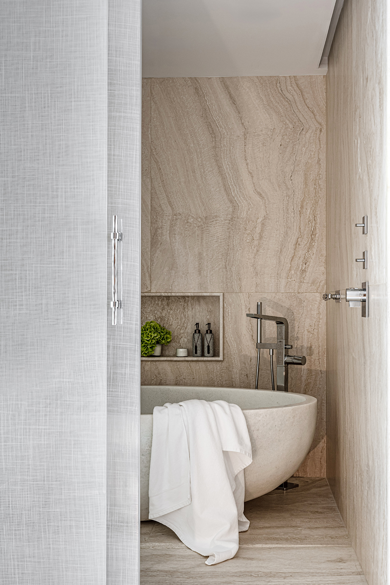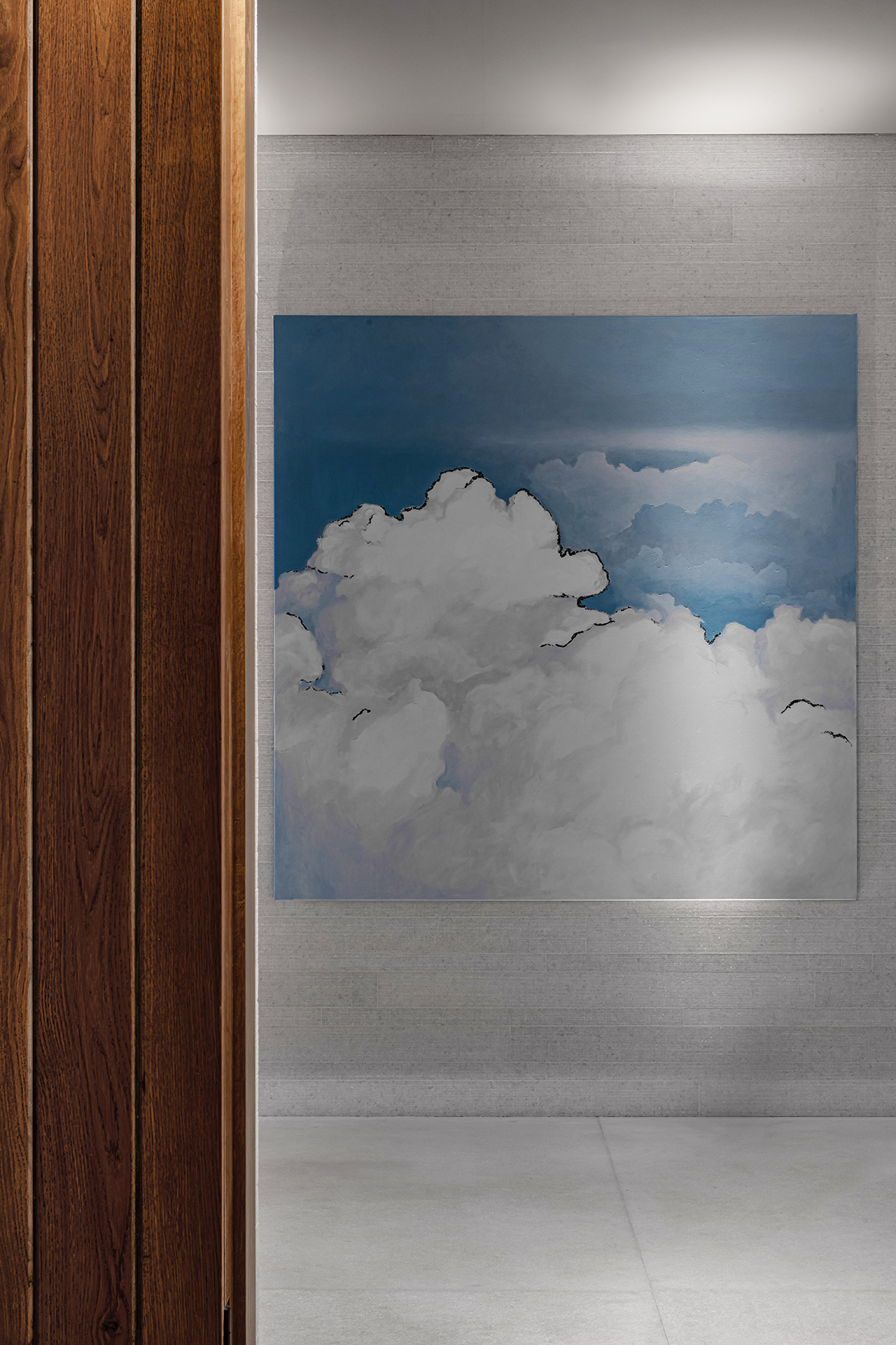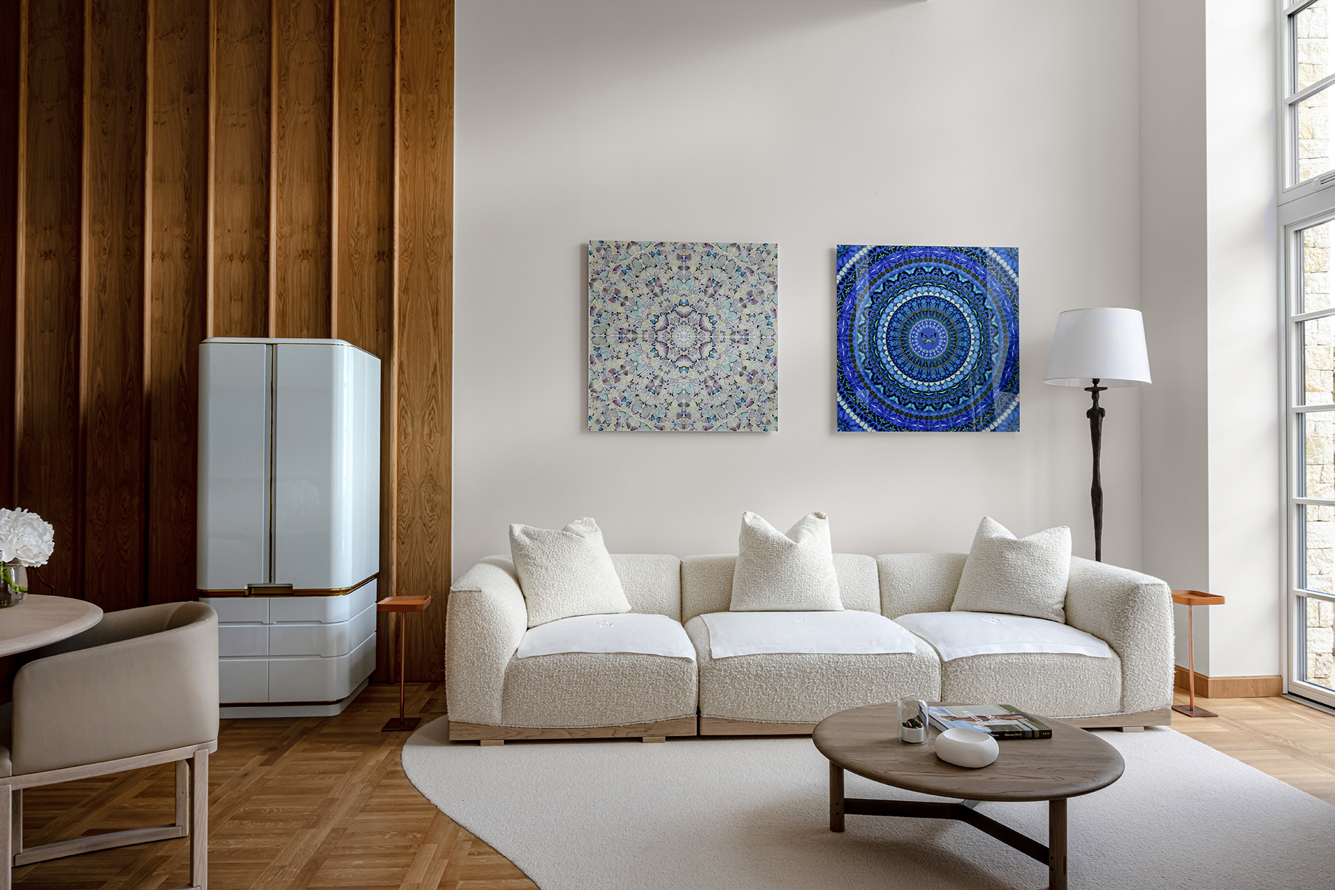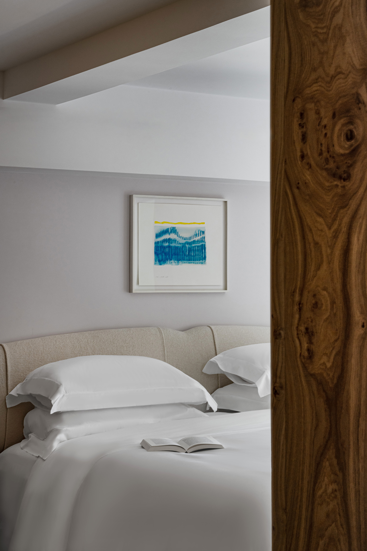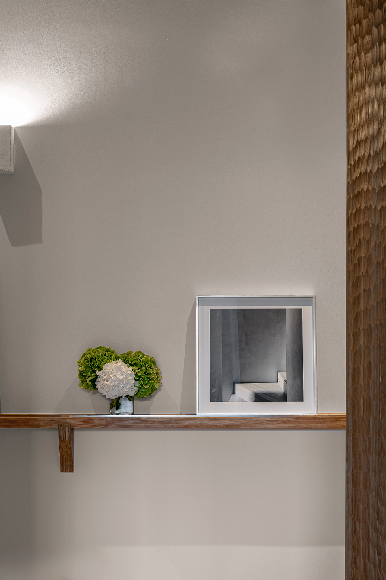 Celý interiér sjednocuje dýha dub očkový přírodní, použitá nejen na nábytku, ale také na obložení stěn a dalších prvcích. Její jedinečná kresba vnáší do prostoru hloubku, hřejivou eleganci a organický charakter. Precizně navazující plochy tvoří harmonický celek nesoucí podpis řemeslného mistrovství, zatímco přírodní materiály podtrhují autenticitu a nadčasovou kvalitu.