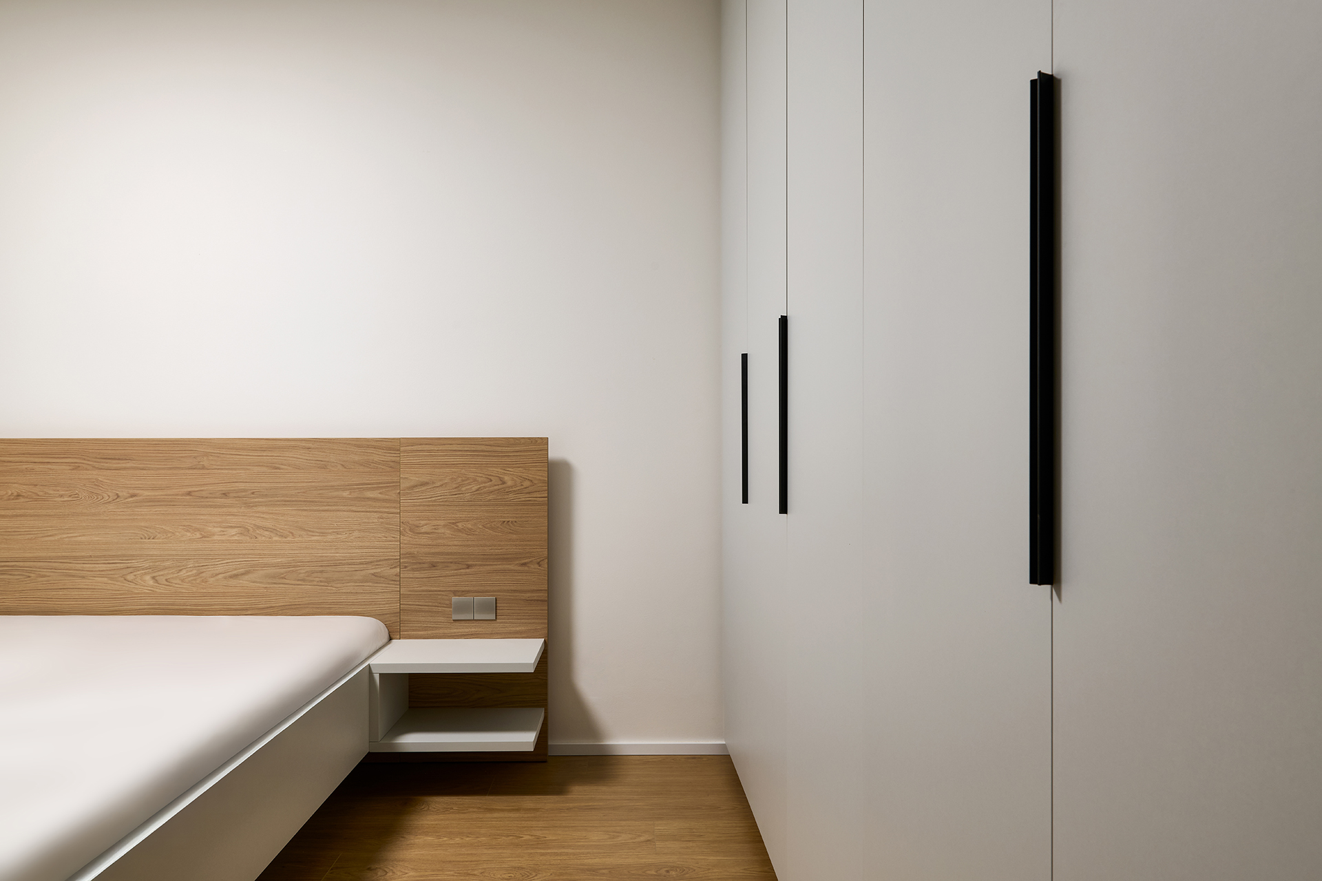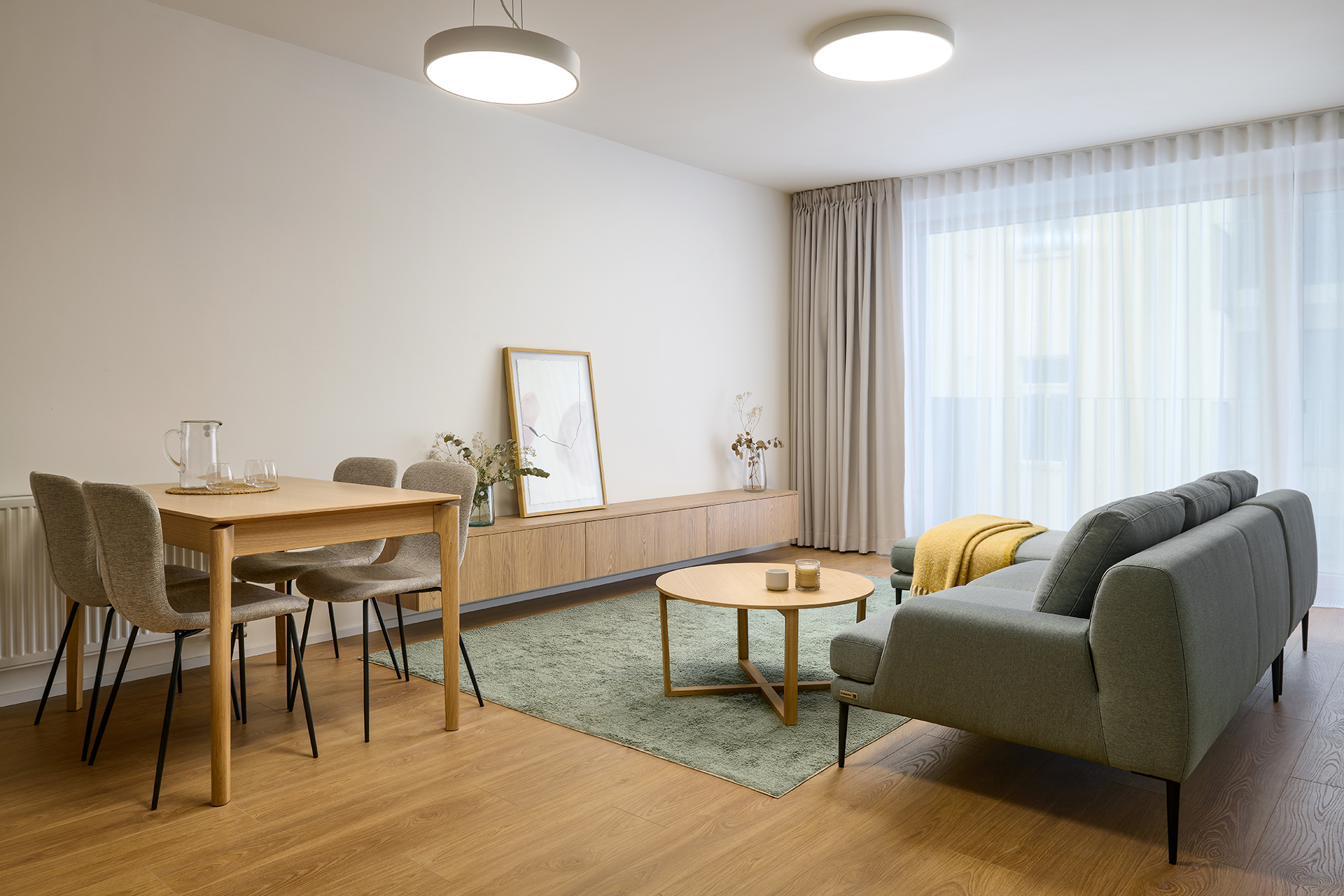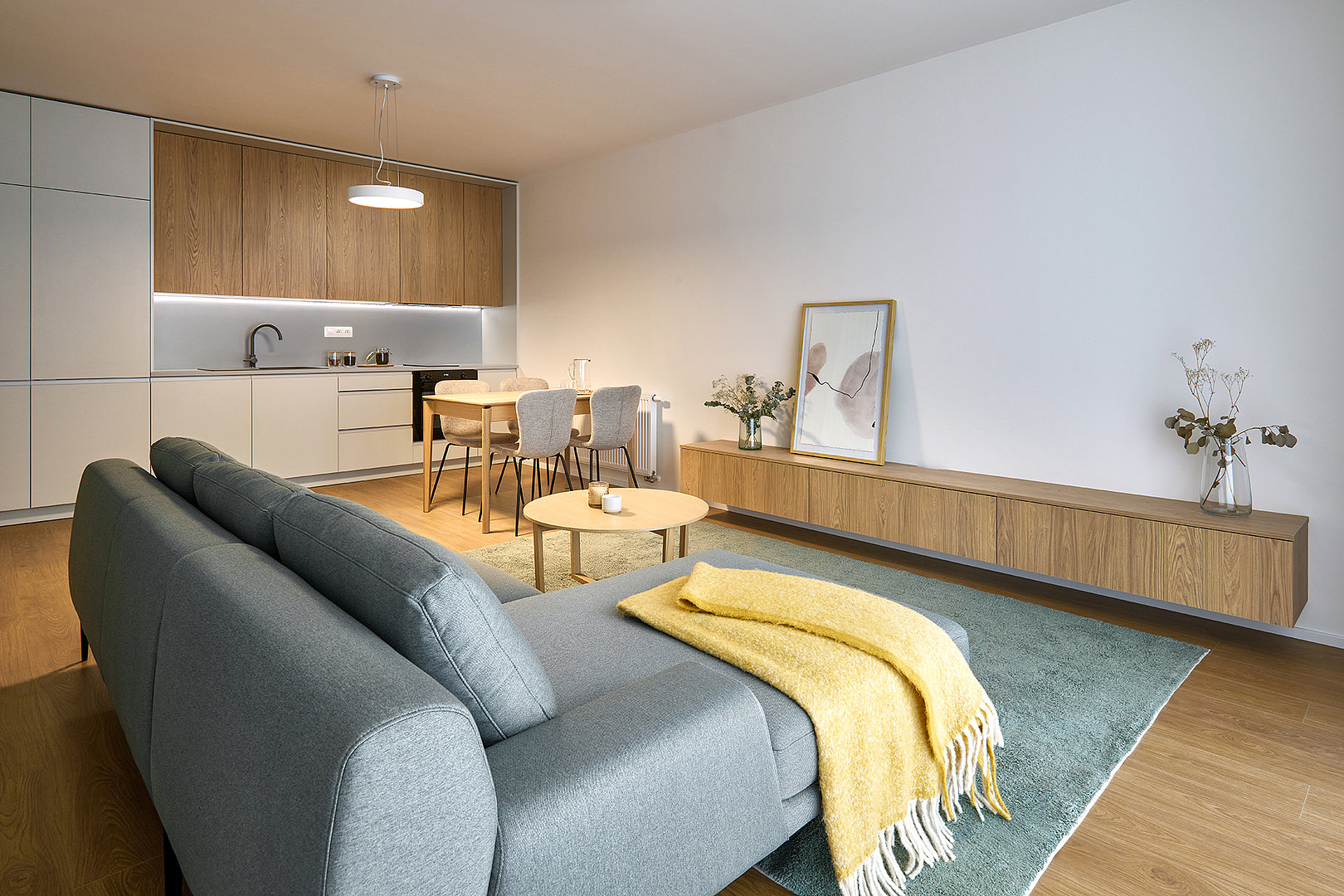 Der Innenraum der 1-Zimmer-Wohnung wurde mit Fokus auf eine effiziente Raumnutzung und visuelle Klarheit gestaltet. Die Küche SIMPLE in der Kombination aus grauem Laminat und Eiche quercus sienna fügt sich selbstverständlich in den Gesamtcharakter der Wohnung ein und bildet eine ruhige, einheitliche Basis des Interieurs.