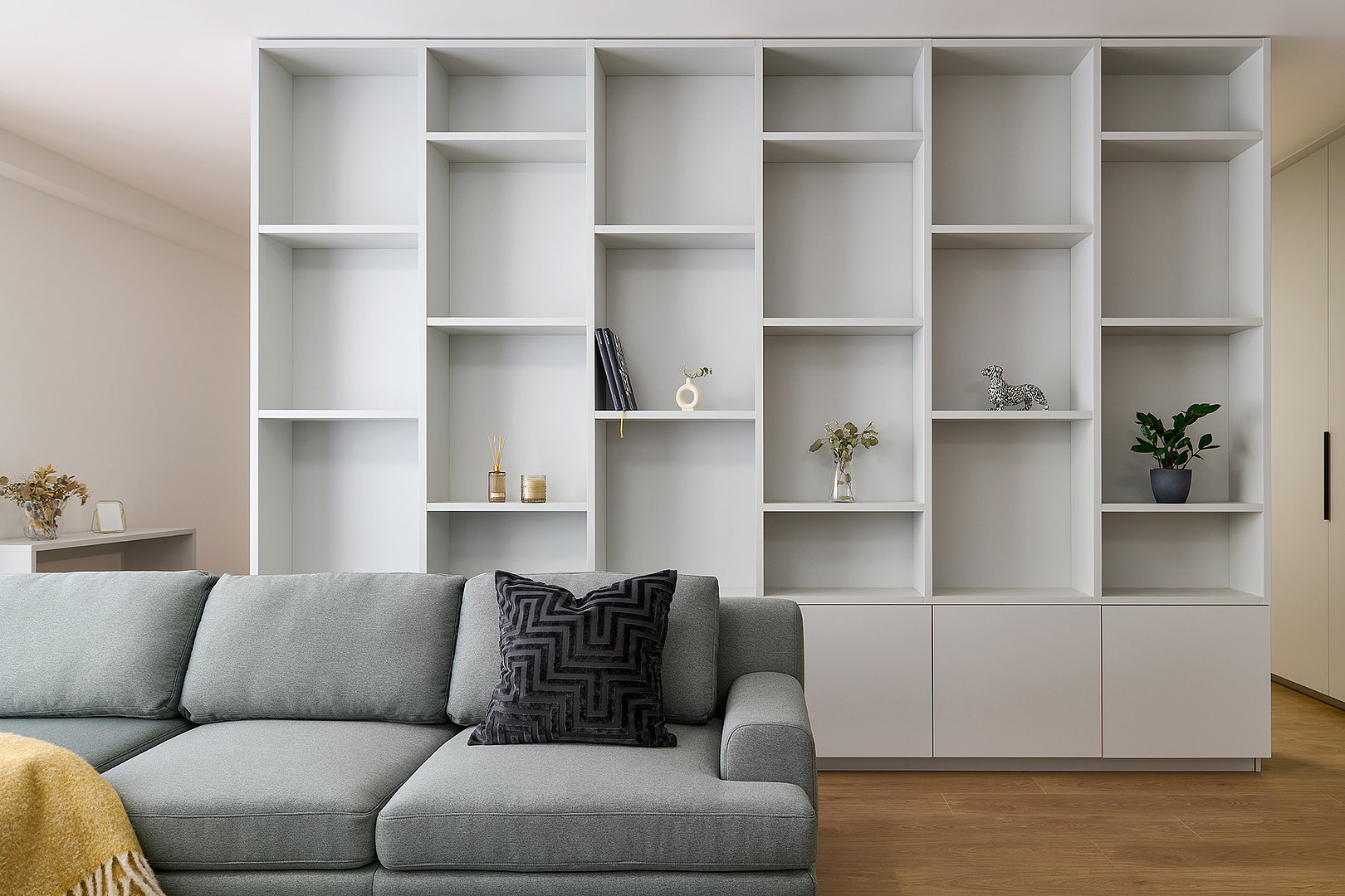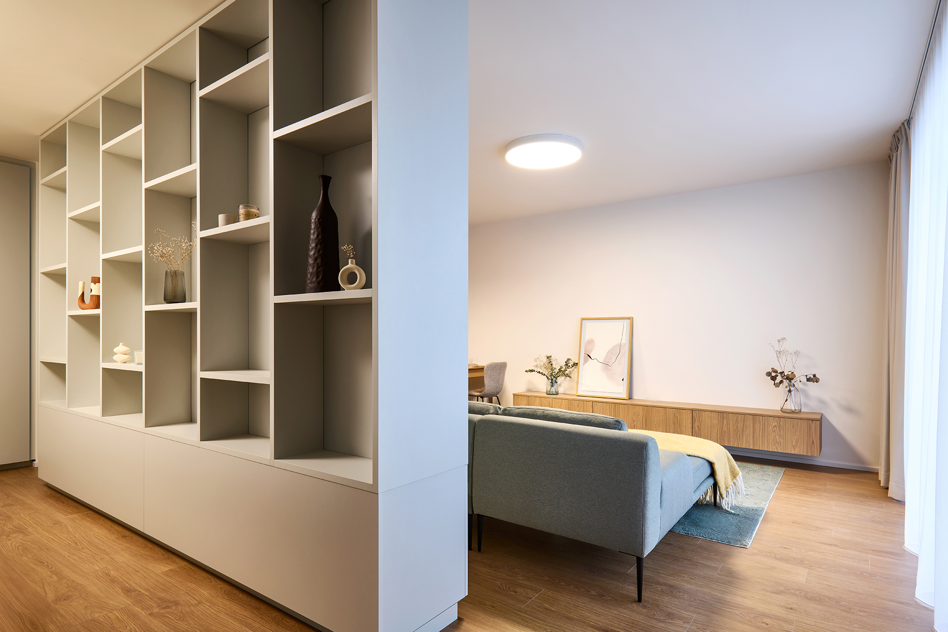 Ein zentrales Element des Konzepts ist das Möbelsystem HARMONY, das den Raum dezent gliedert und gleichzeitig ein Gefühl von Privatsphäre und Ordnung schafft. Dahinter entsteht ein ruhiger Schlafbereich, der selbstverständlich in den Grundriss integriert ist und nicht als Kompromiss oder Übergangslösung wirkt.