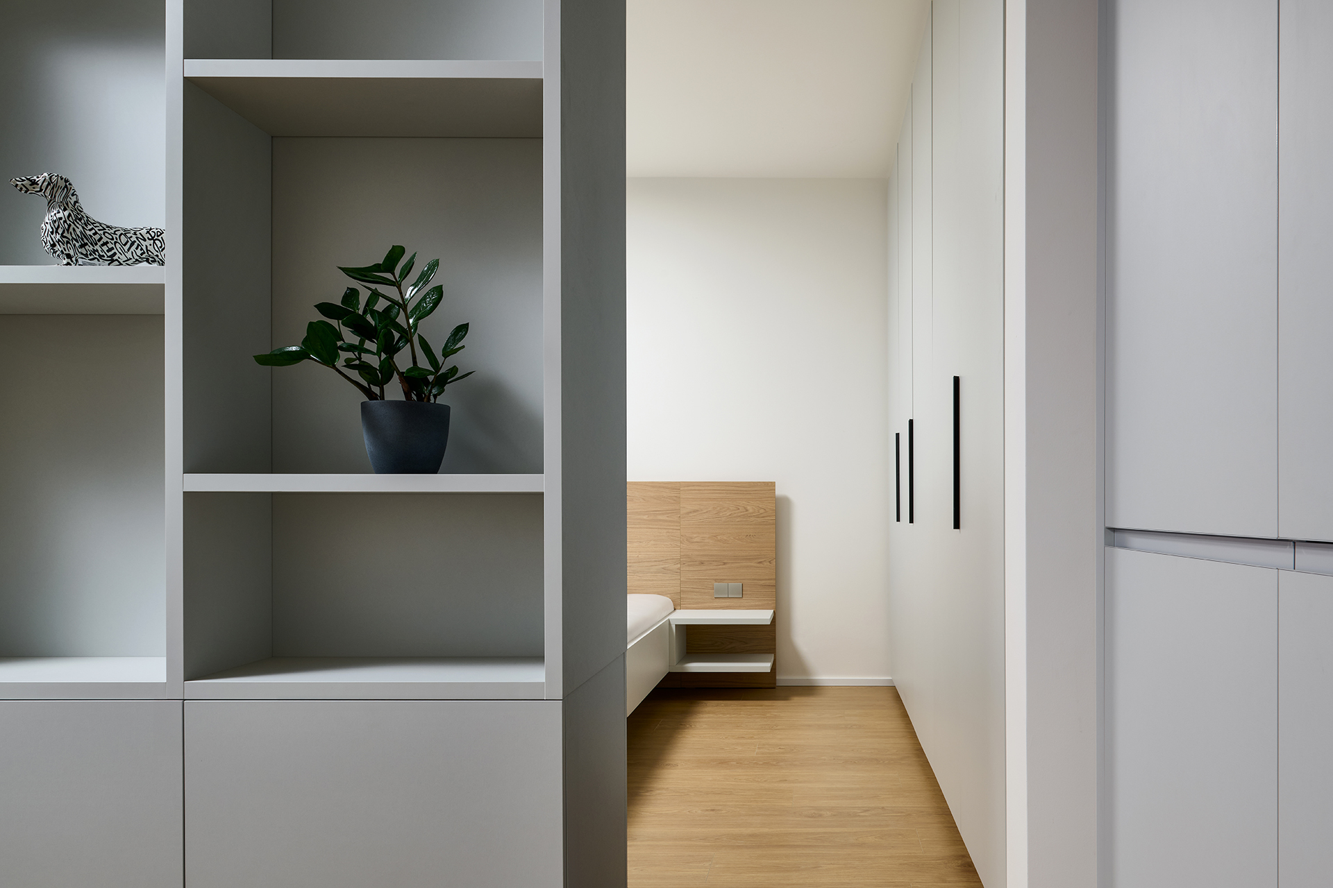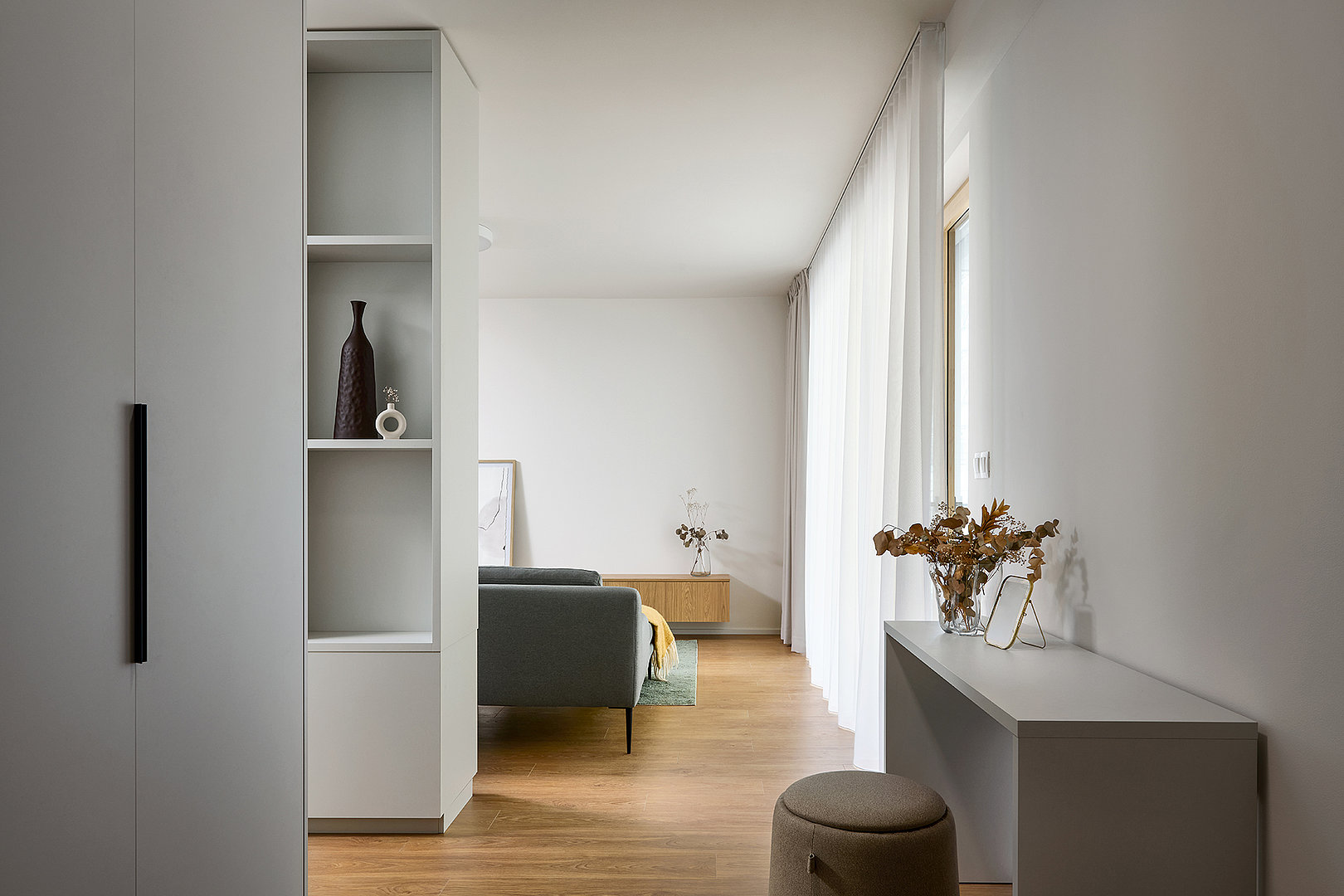 Die einheitliche Materialwahl, zurückhaltende Farbigkeit und durchdachte Details verleihen auch dieser kompakten Disposition Ausgewogenheit, Ruhe und den Charakter eines echten Zuhauses.
