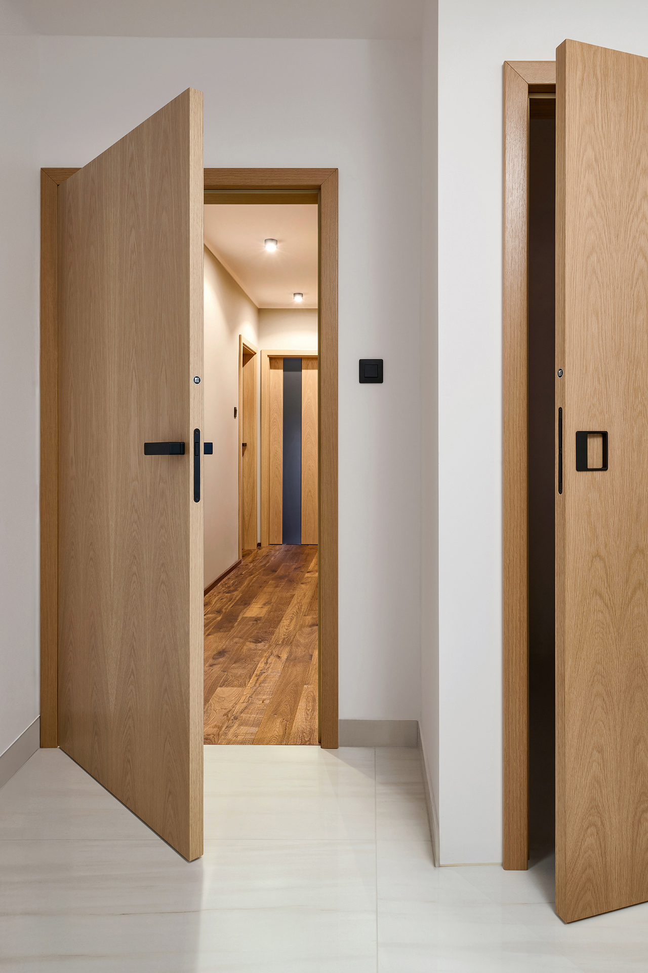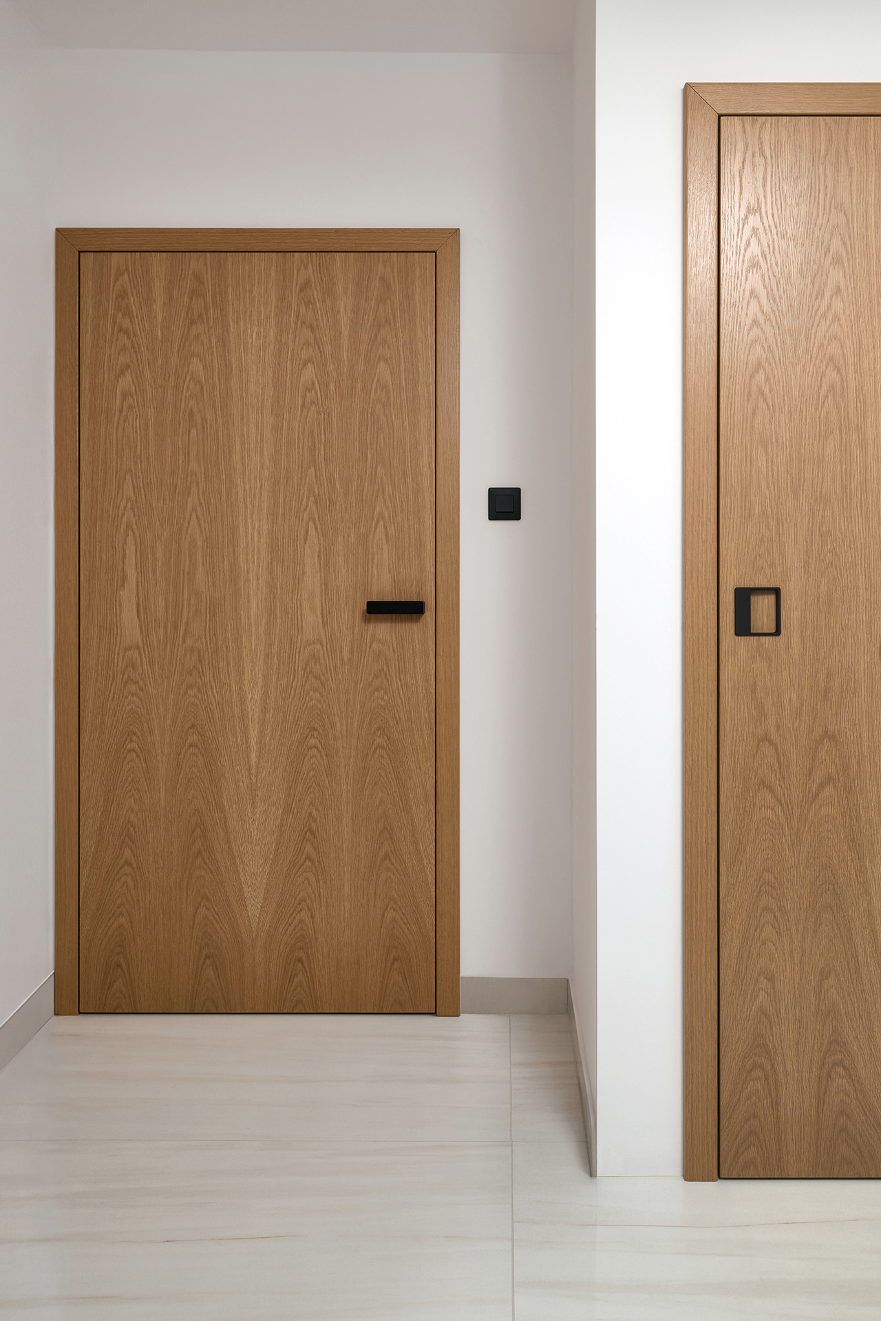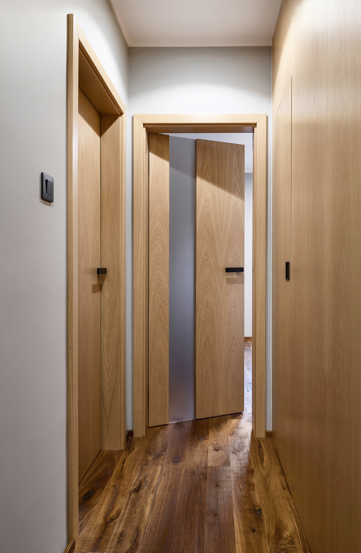 Das wichtigste verbindende Element ist das natürliche amerikanische Eichenfurnier, das bei den Modellen SPACE und SPIRIT verwendet wurde. Durch ihre glatten Oberflächen und ihre minimalistische Verarbeitung verschmelzen die Türen buchstäblich mit der Wand. Für ungestörte Linien sorgen verdeckte Scharniere, Magnetverschlüsse und schwarze Gegenplatten. Der Gesamteindruck wird durch den Türgriff Minimal Tin K in Titanmatt und den optionalen Türgriff Joo Magnetic in passender Holzfarbe abgerundet.