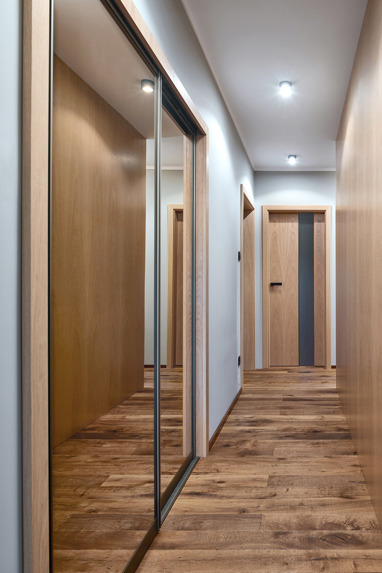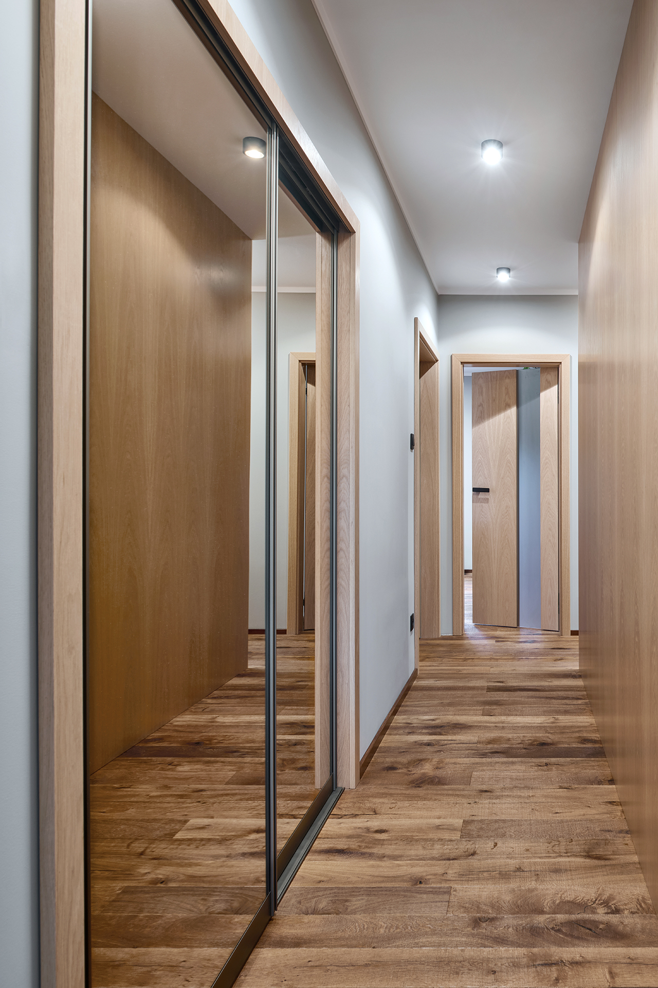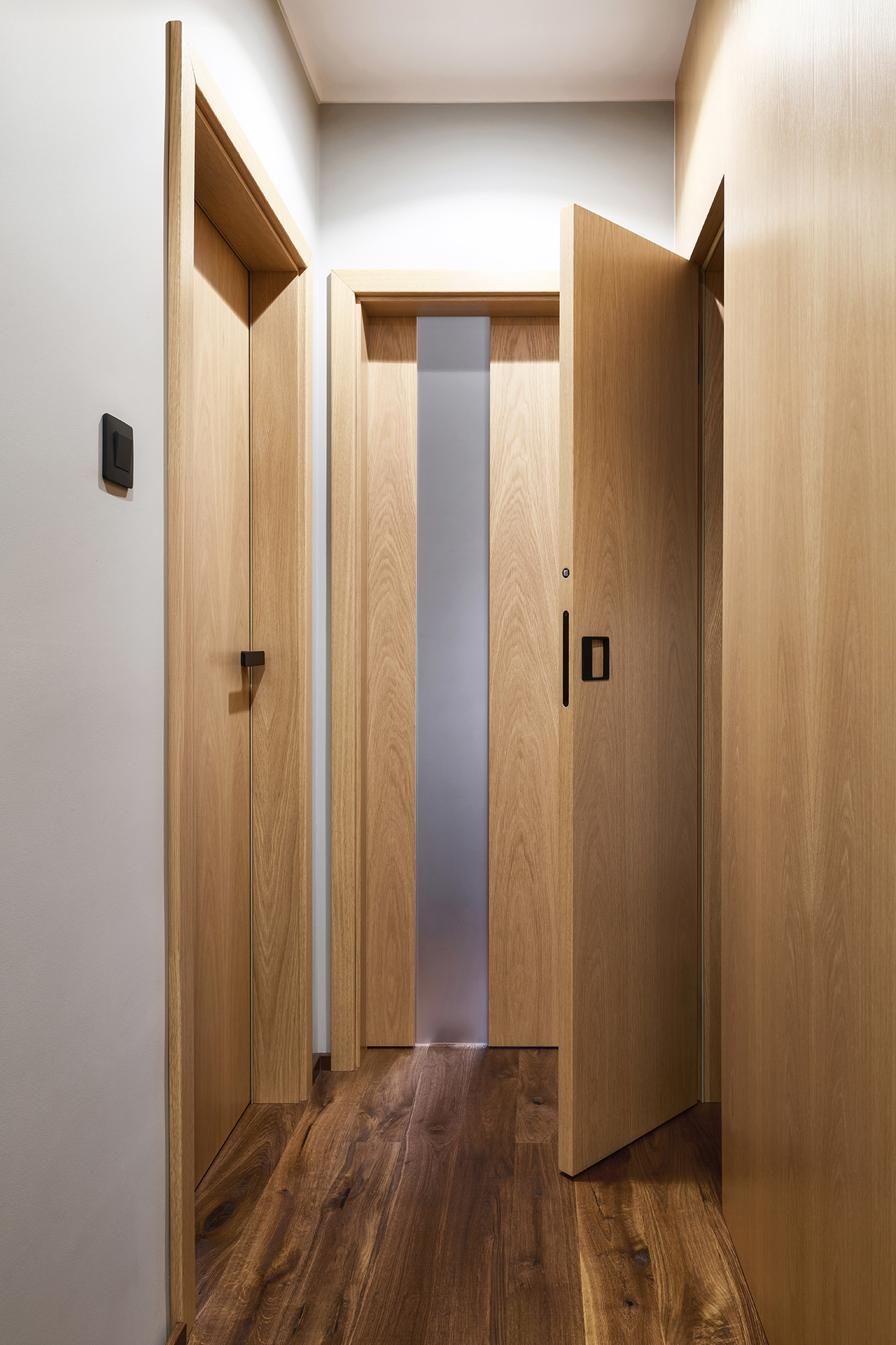 Das wichtigste verbindende Element ist das natürliche amerikanische Eichenfurnier, das bei den Modellen SPACE und SPIRIT verwendet wurde. Durch ihre glatten Oberflächen und ihre minimalistische Verarbeitung verschmelzen die Türen buchstäblich mit der Wand. Für ungestörte Linien sorgen verdeckte Scharniere, Magnetverschlüsse und schwarze Gegenplatten. Der Gesamteindruck wird durch den Türgriff Minimal Tin K in Titanmatt und den optionalen Türgriff Joo Magnetic in passender Holzfarbe abgerundet.
