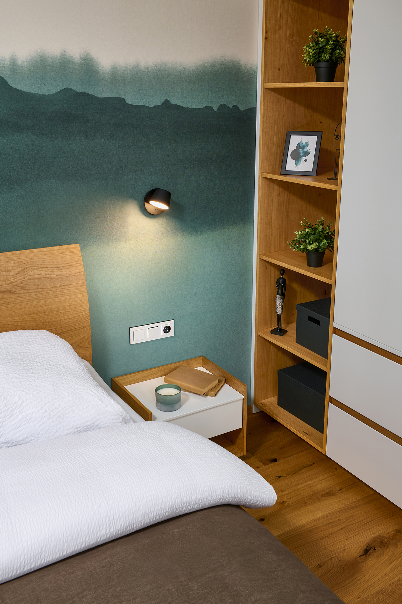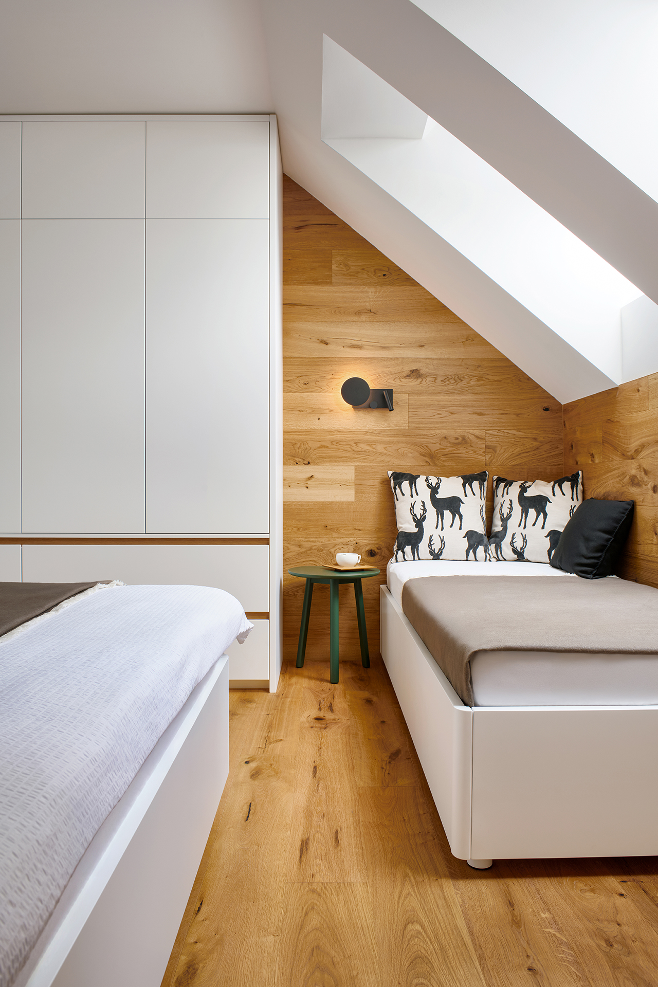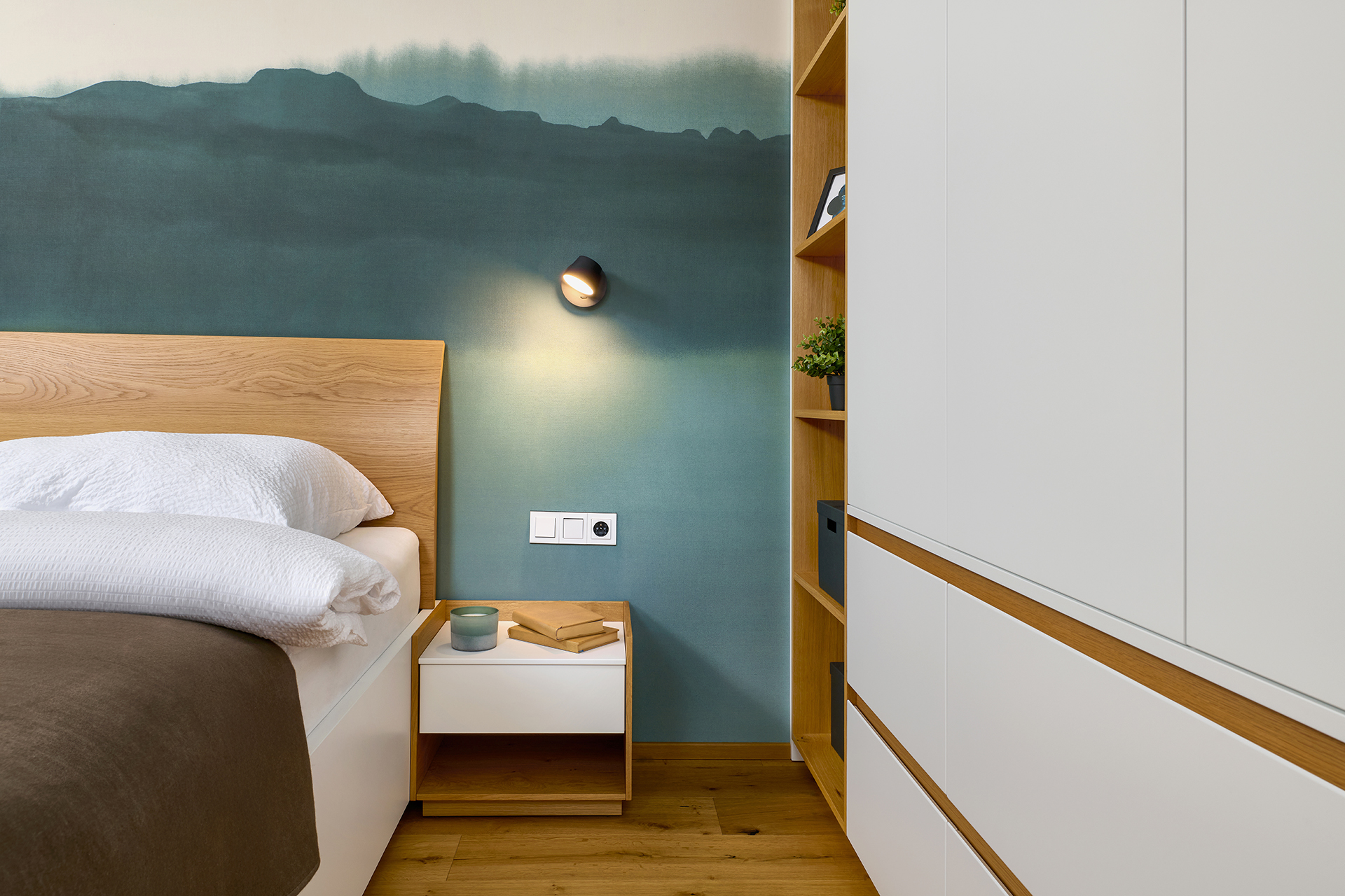 The bedroom offers a discreet retreat for relaxation with KLAUDIE beds with solid headboards and LARA beds with elegantly rounded lines, which give the room a feeling of security and privacy. The built-in wardrobe set with tip-on opening and Solid handles provides a practical storage solution without disturbing the clean and calm character of the interior.