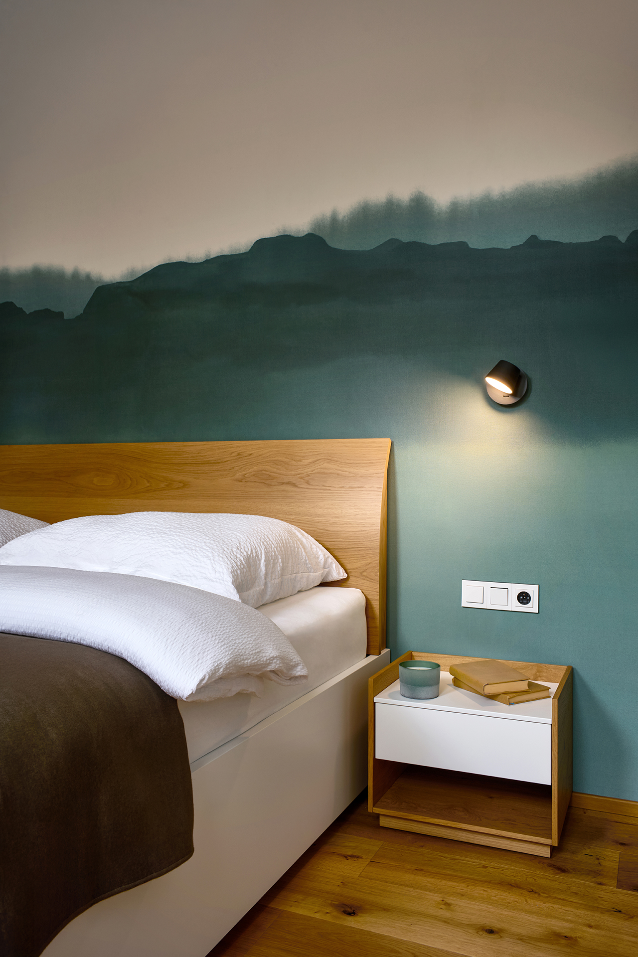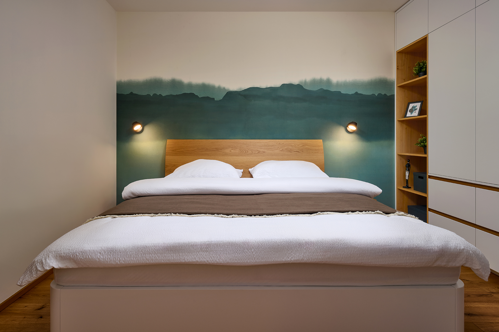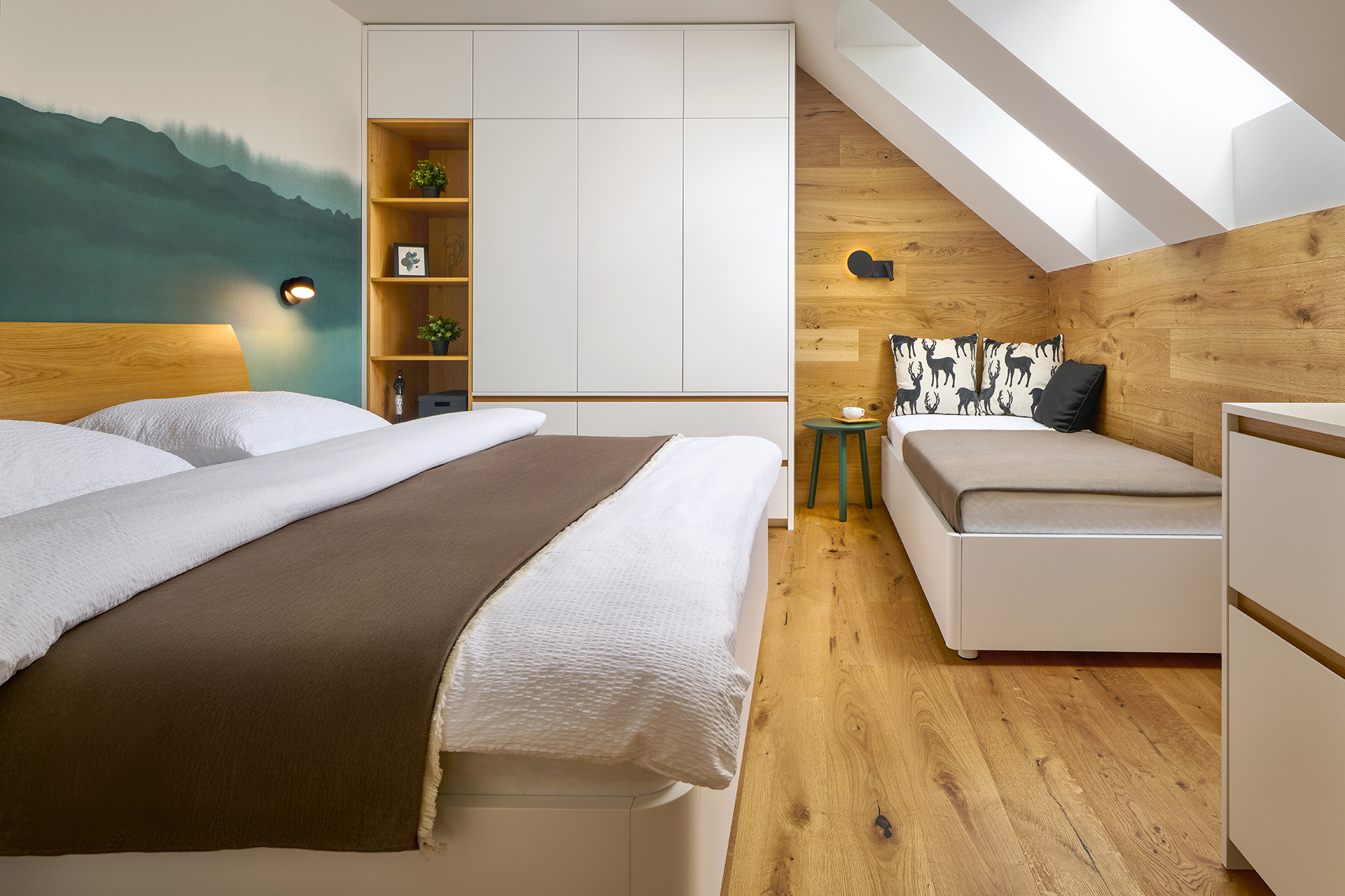 The bedroom offers a discreet retreat for relaxation with KLAUDIE beds with solid headboards and LARA beds with elegantly rounded lines, which give the room a feeling of security and privacy. The built-in wardrobe set with tip-on opening and Solid handles provides a practical storage solution without disturbing the clean and calm character of the interior.