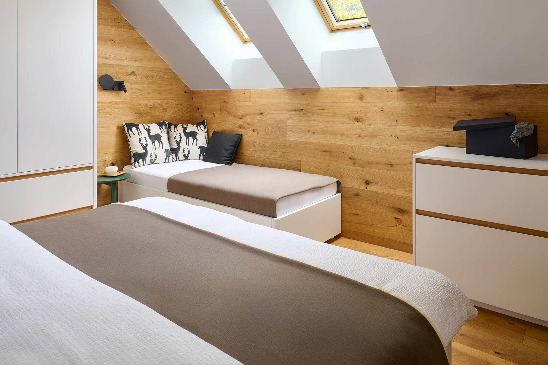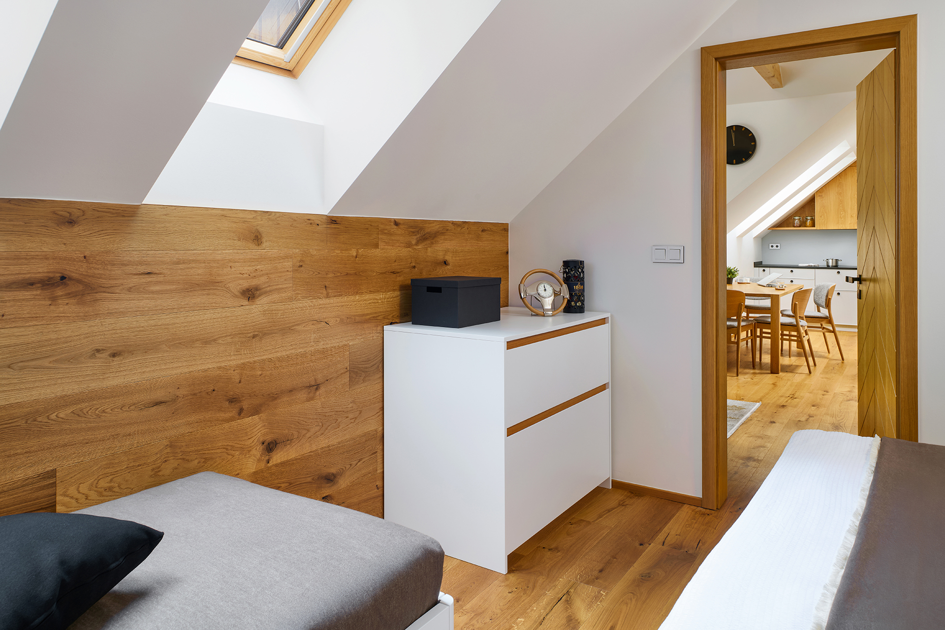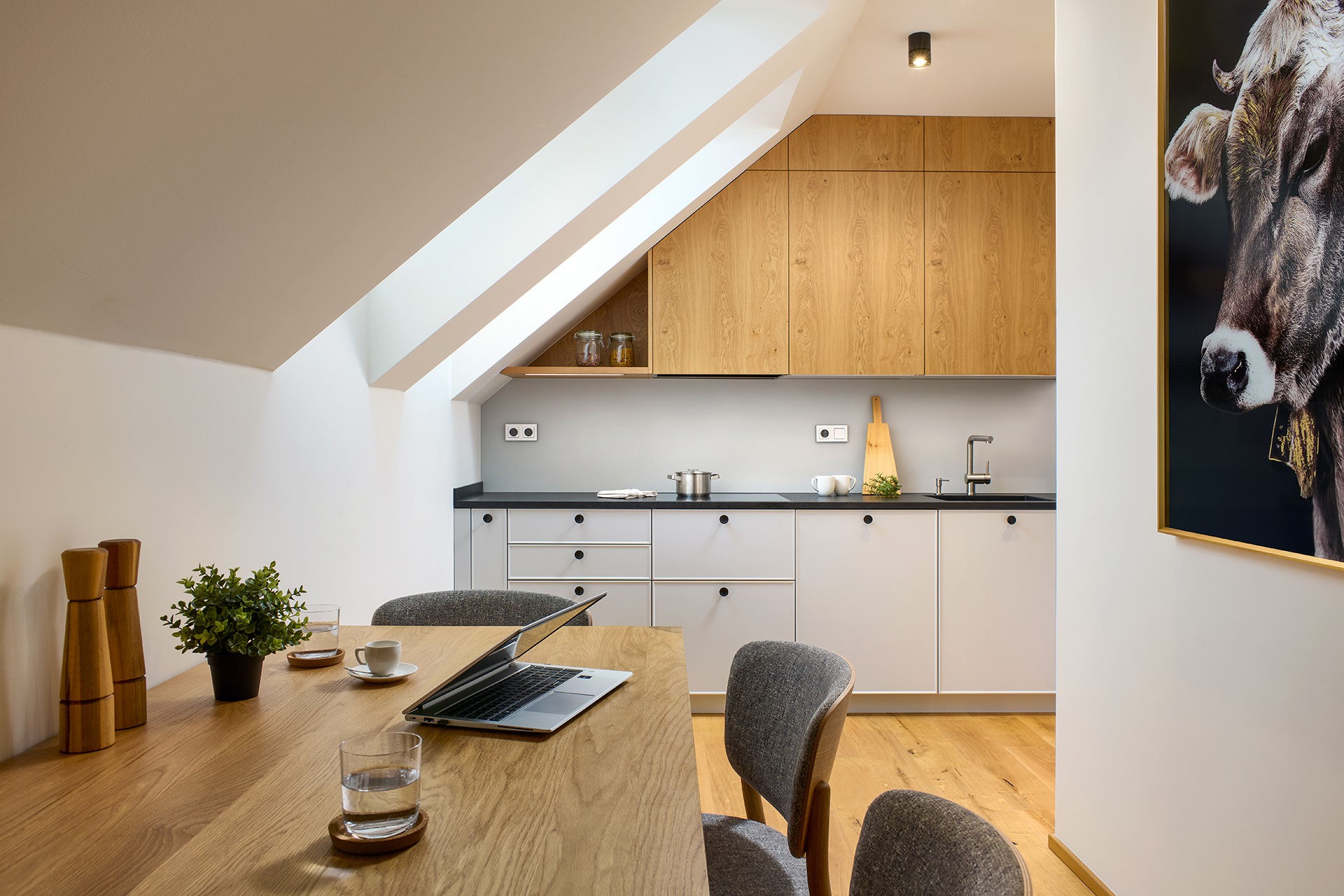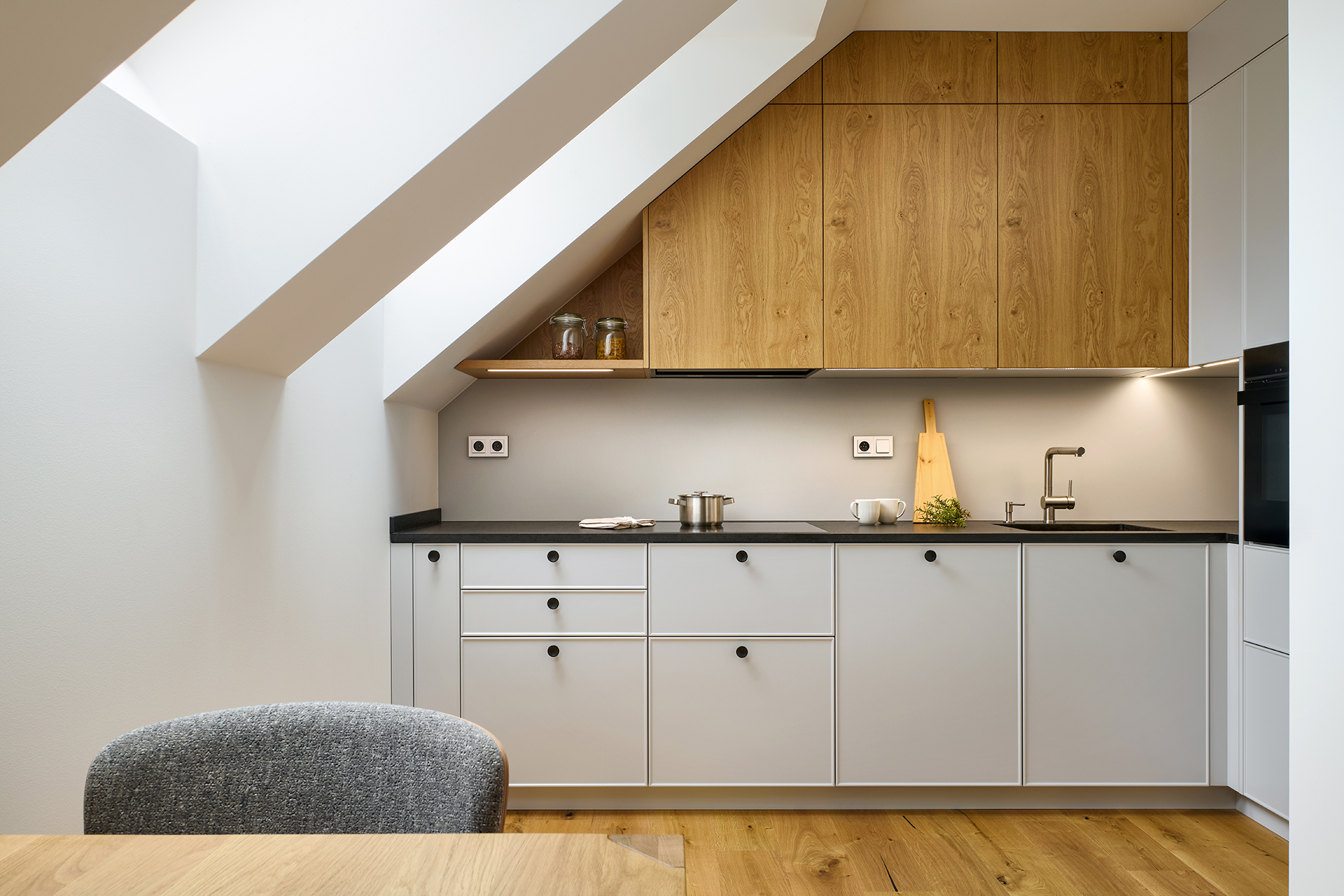 The dominant feature of the space is the CUBIC kitchen in light gray, where designers have made use of every last centimeter of the atypical attic sloping ceiling. The soft lines highlight the rustic oak on the upper cabinets, whose texture gives the space a cozy character. The contrasting Nero Assoluto black granite countertop brings elegance and durability, while Siemens appliances ensure reliable operation.
