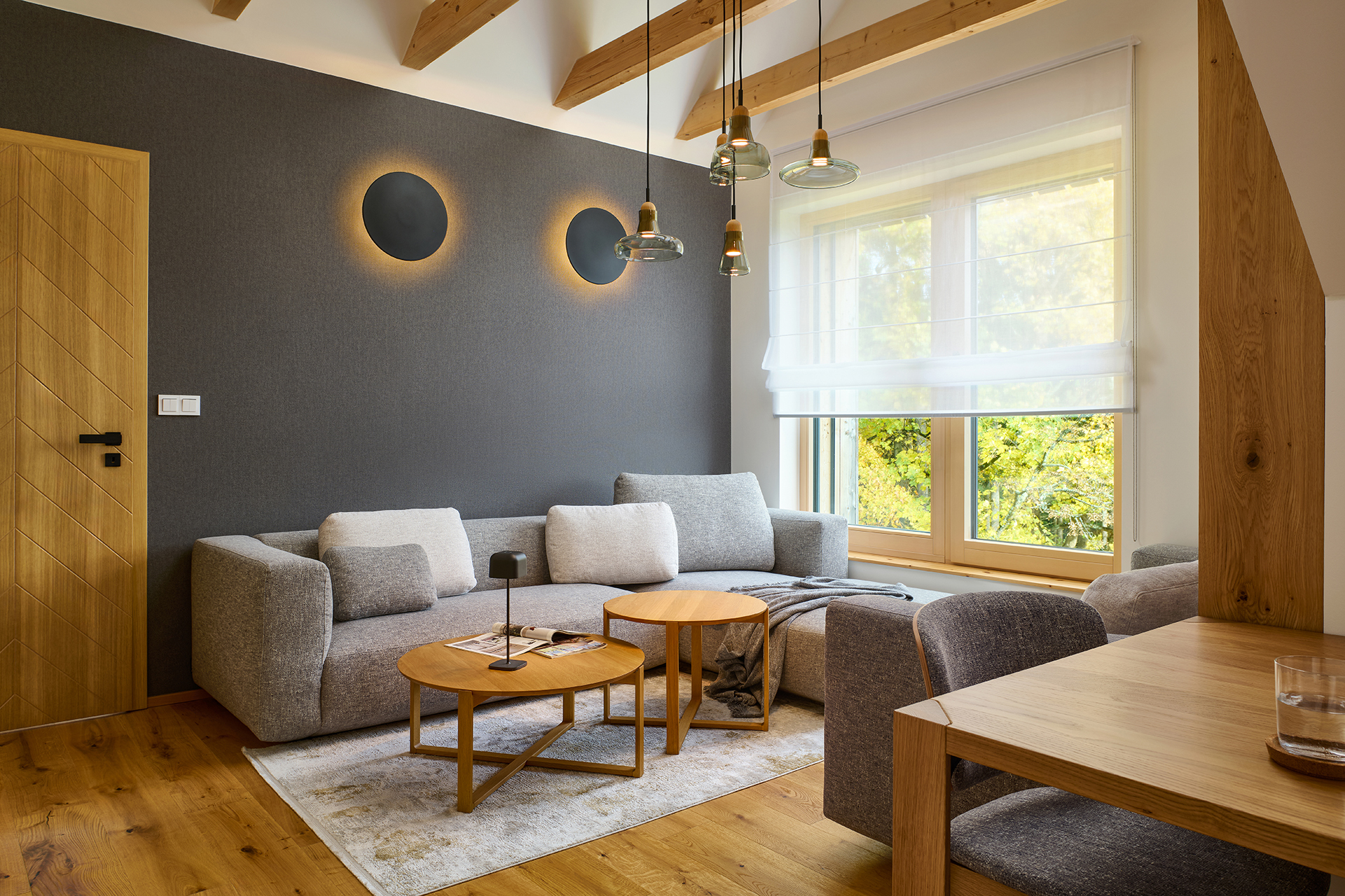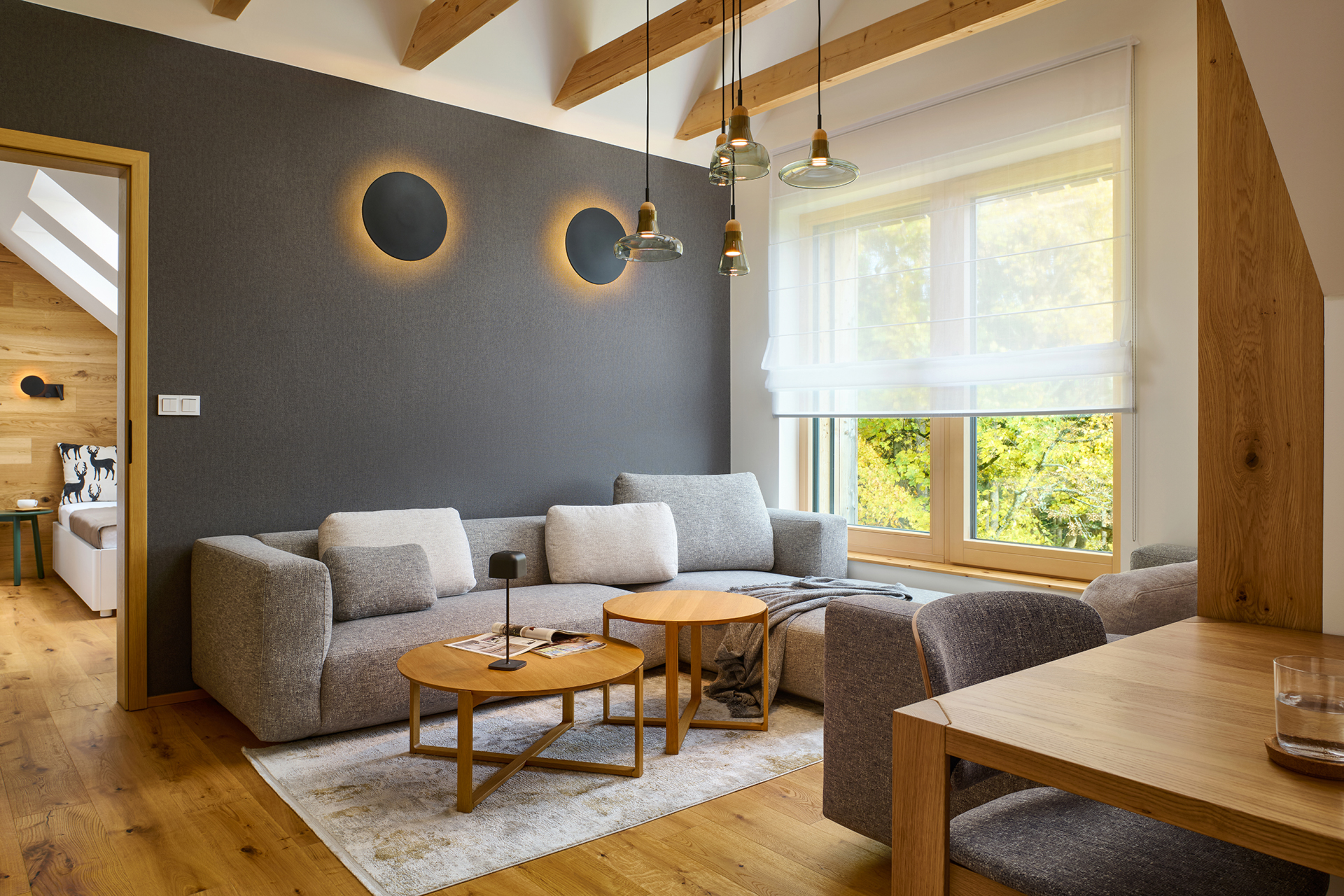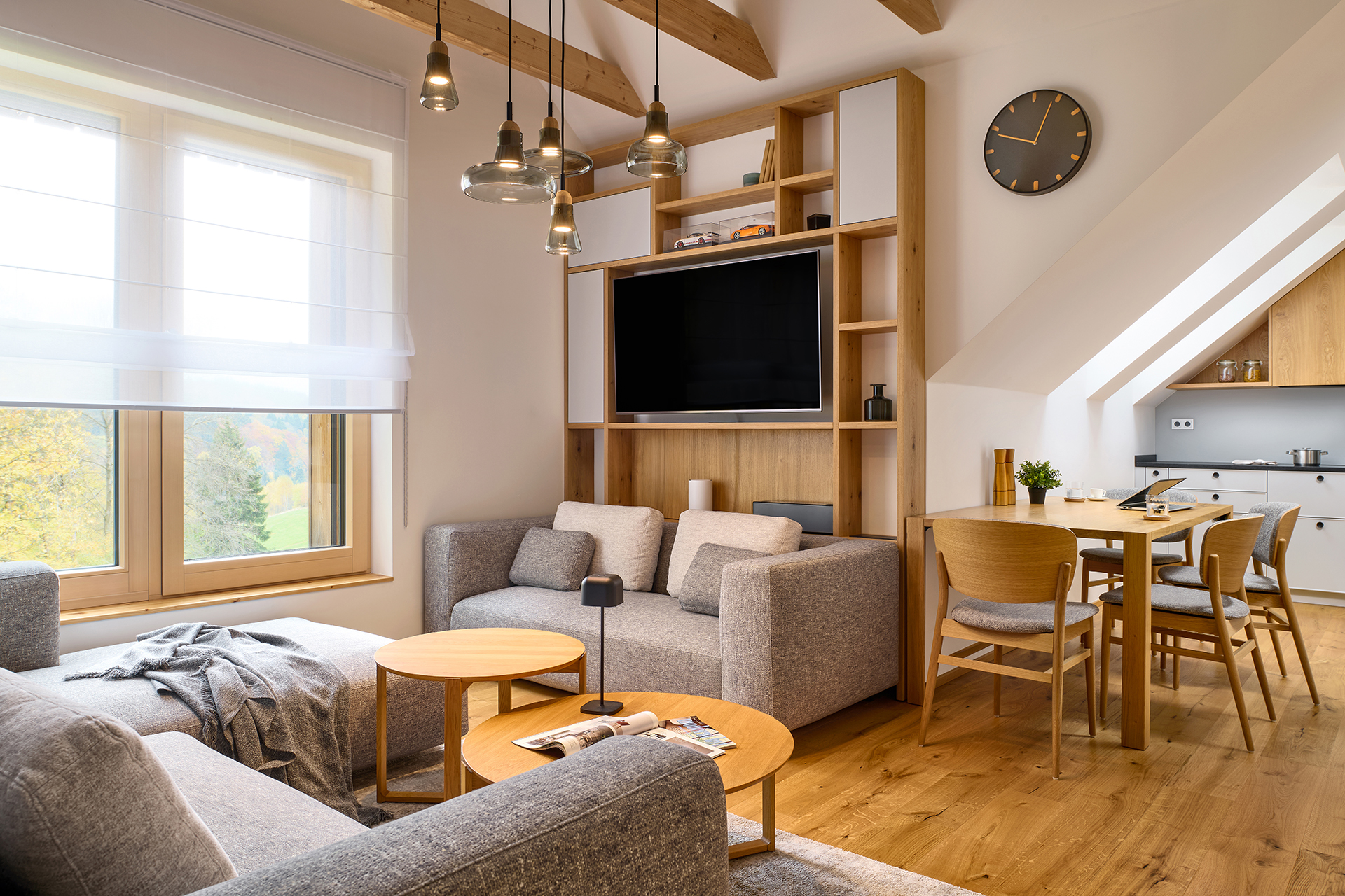 The kitchen flows seamlessly into the living area, where the HARMONY set combines soft tones with the natural grain of the beams, emphasizing the overall atmosphere of the space. The comfortable POLYGON sofa set is perfect for family gatherings and quiet, undisturbed relaxation.