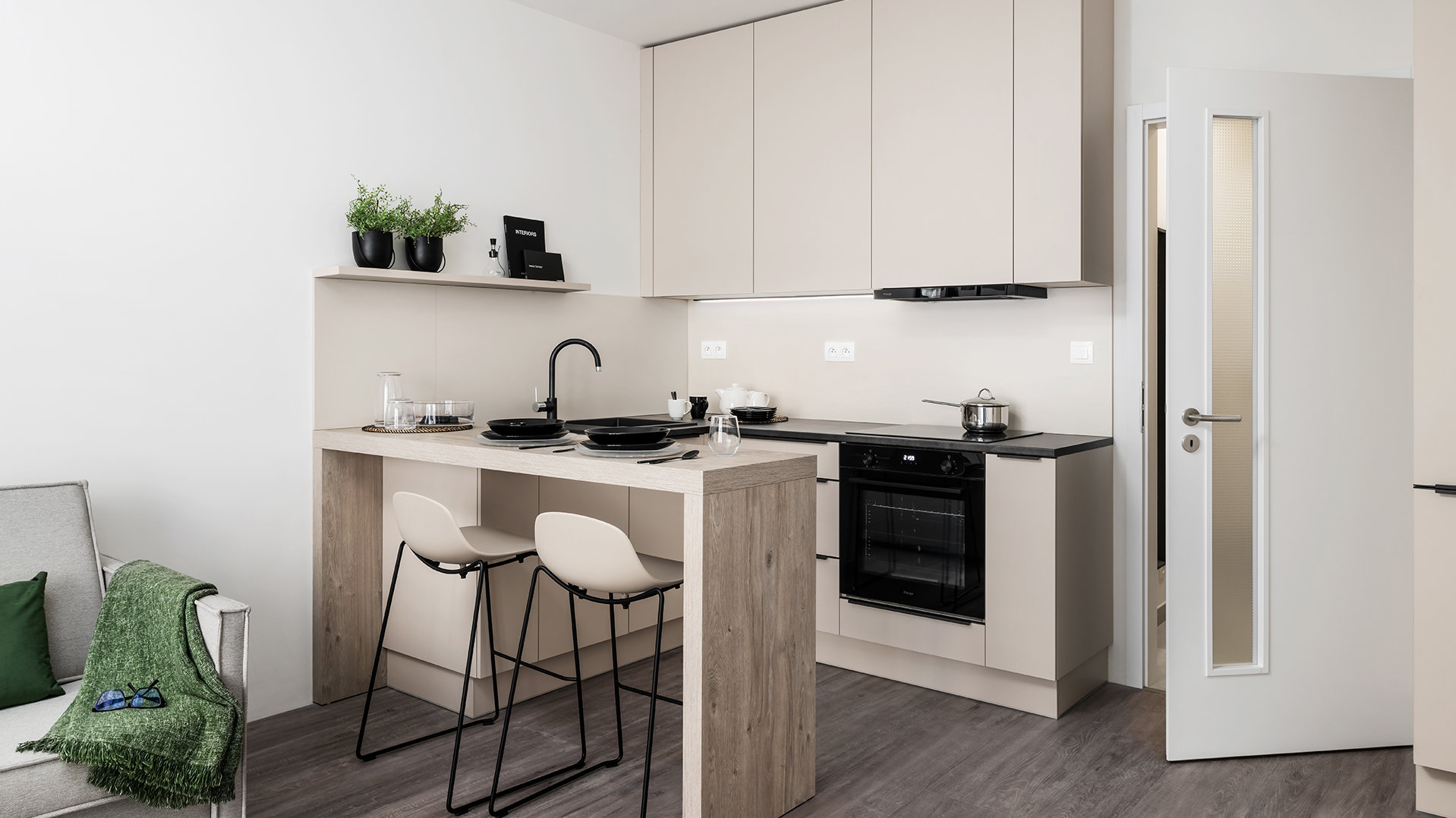 Chaque appartement de ce projet de développement moderne situé dans un quartier calme de Slavkov est équipé d'une cuisine HANÁK. Les résidents peuvent choisir parmi plusieurs décors élégants et colorés dans un design standard ou opter pour des options haut de gamme exclusives. Le projet comprend également un parc de détente avec une abondante verdure, des sièges et une aire de jeux pour enfants, créant ainsi un habitat harmonieux et fonctionnel pour un style de vie moderne.