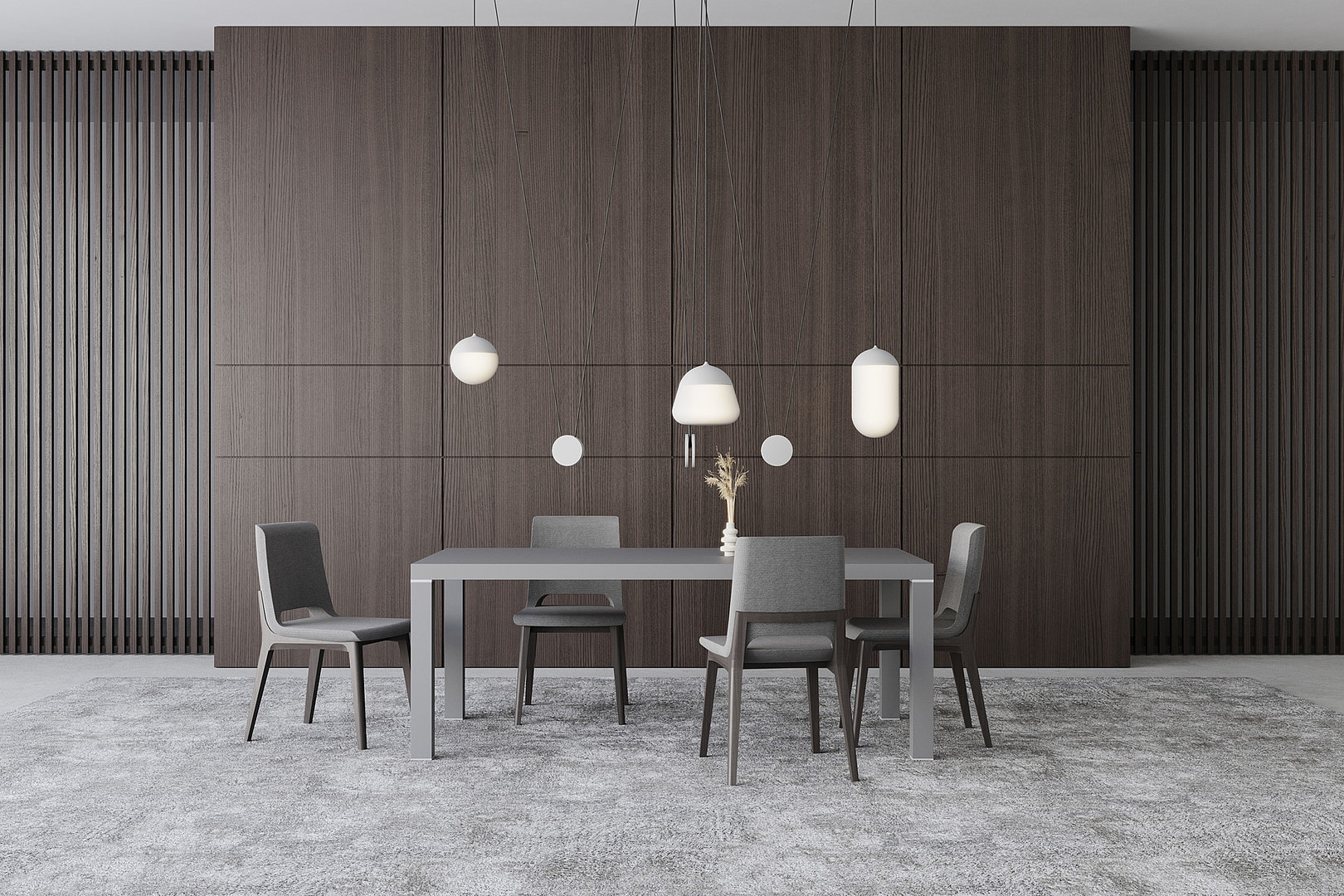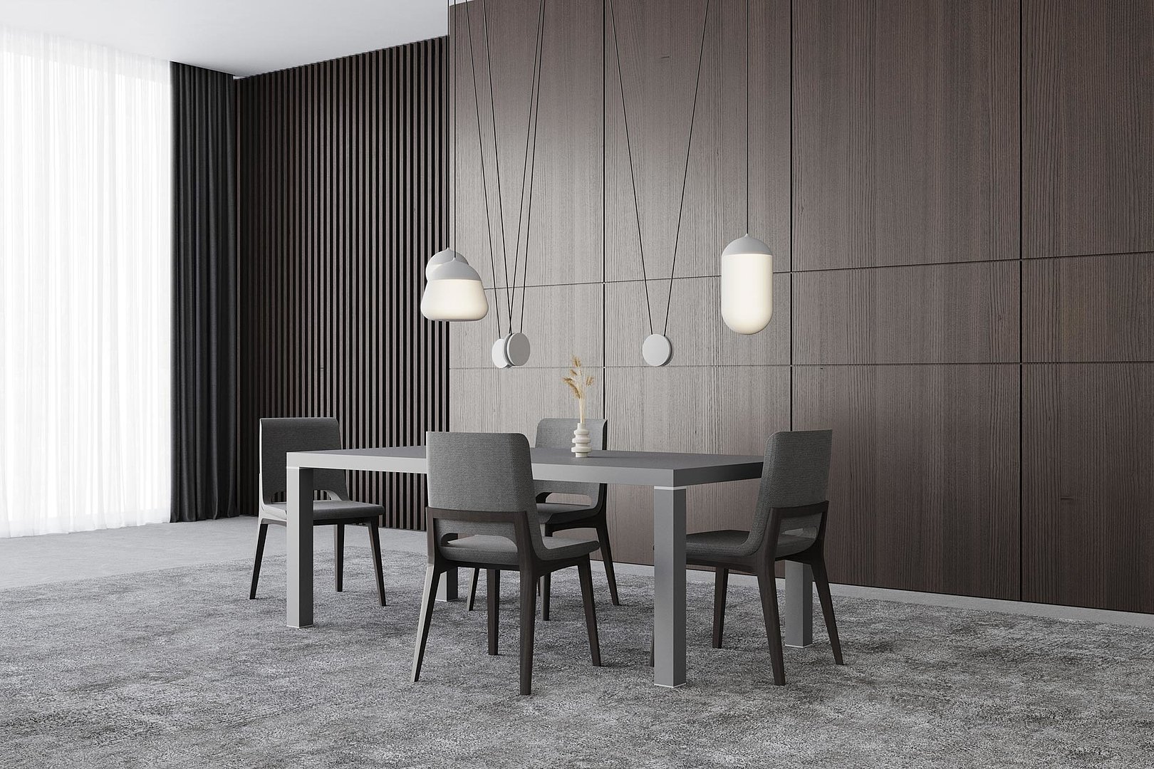 Elegantní vzhled jídelního stolu tvoří vysoká stolová deska a decentní kovový prvek, který od ní odděluje a současně také zakončuje každou jeho nohu.