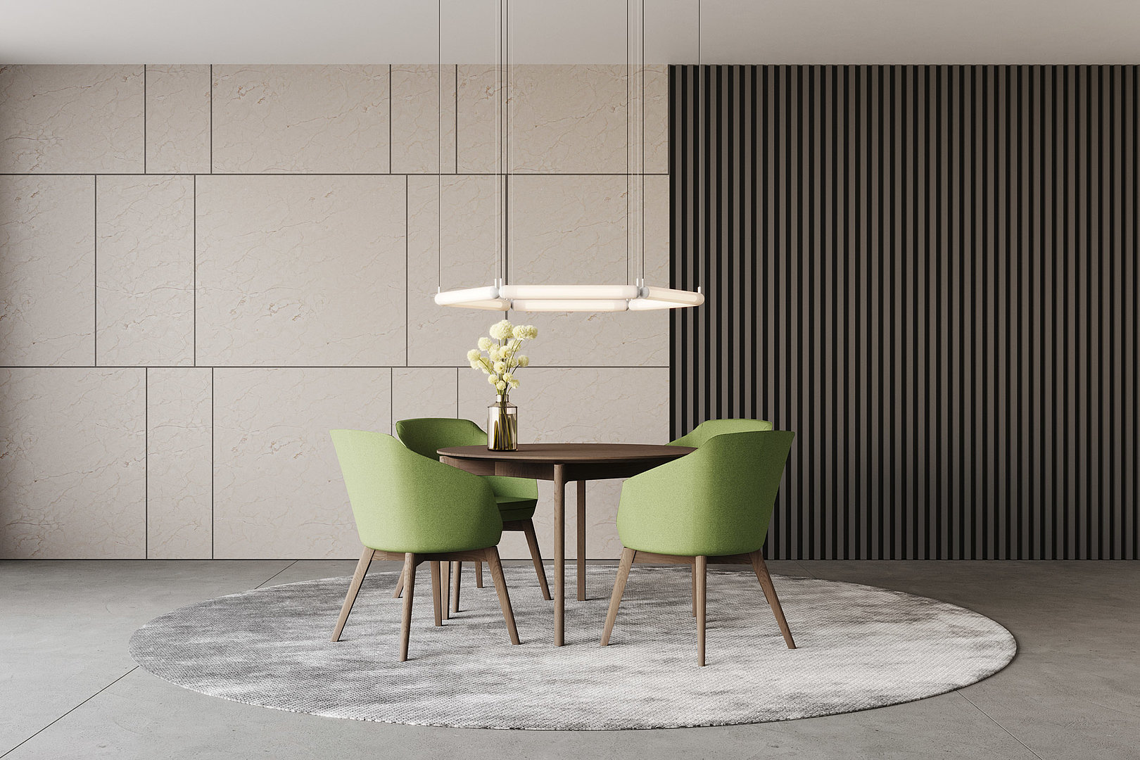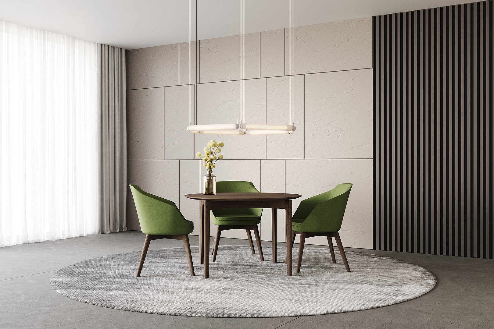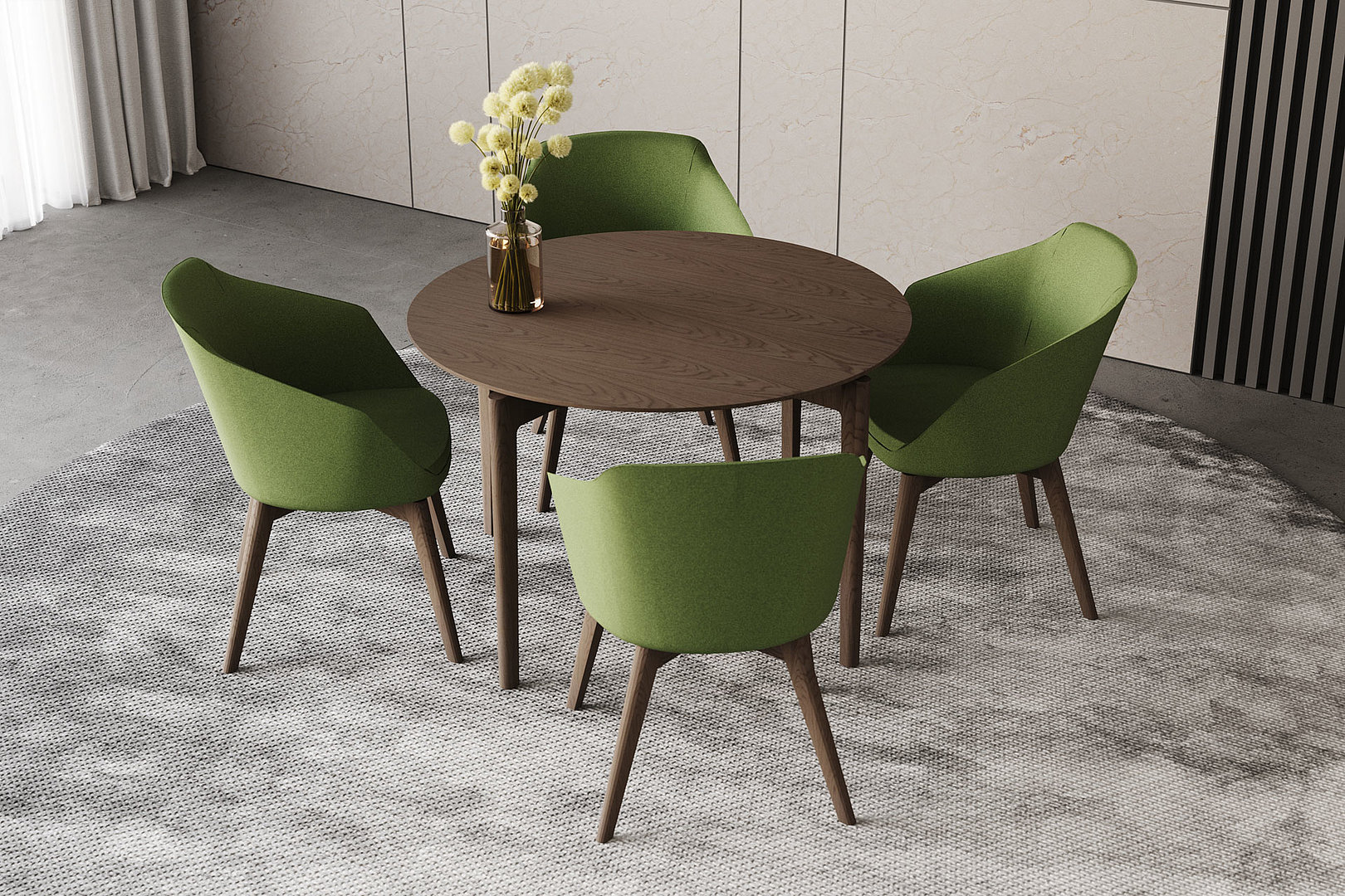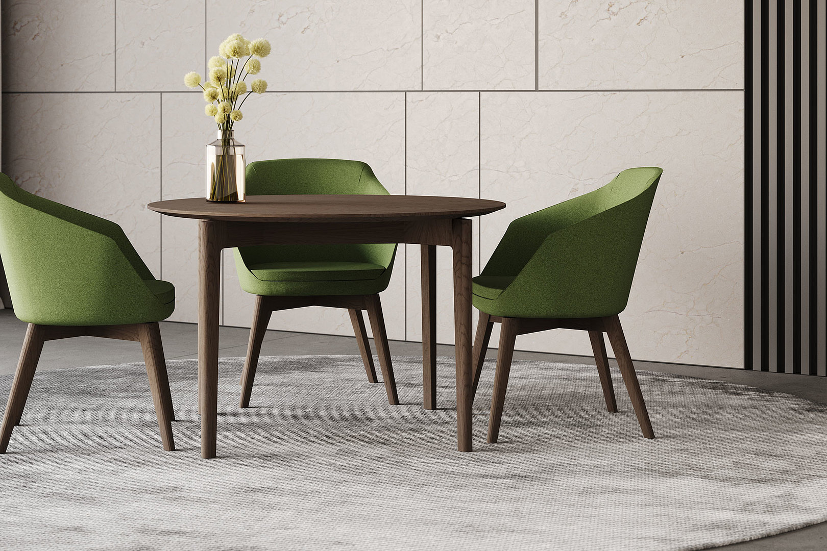 Dýhovaný kulatý jídelní stůl zajímavý svými precizně zpracovanými detaily. Tenká stolová deska usazená na střed křížové podnože, ve zvolené kombinaci navozuje pocit jejího levitujícího dojmu.