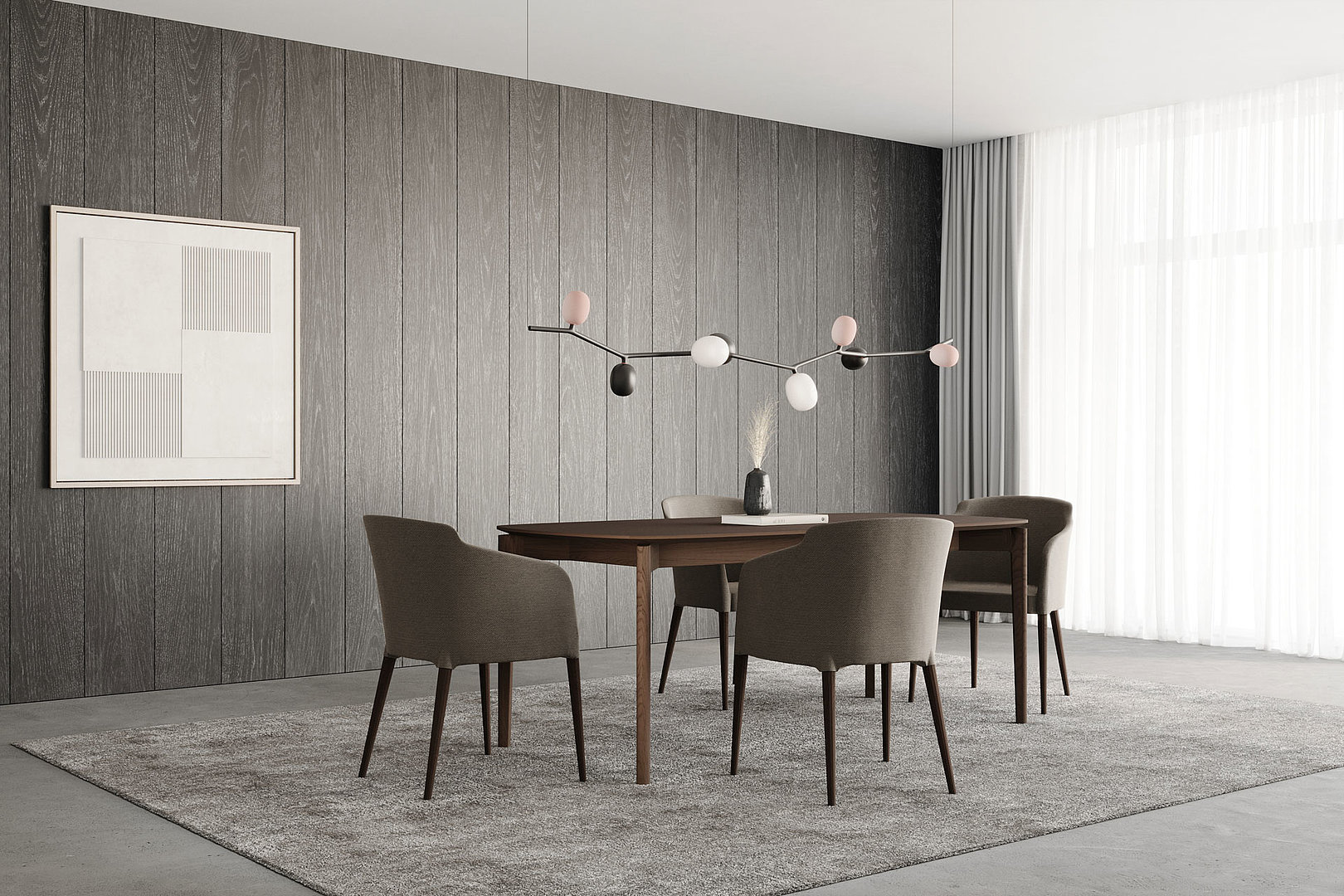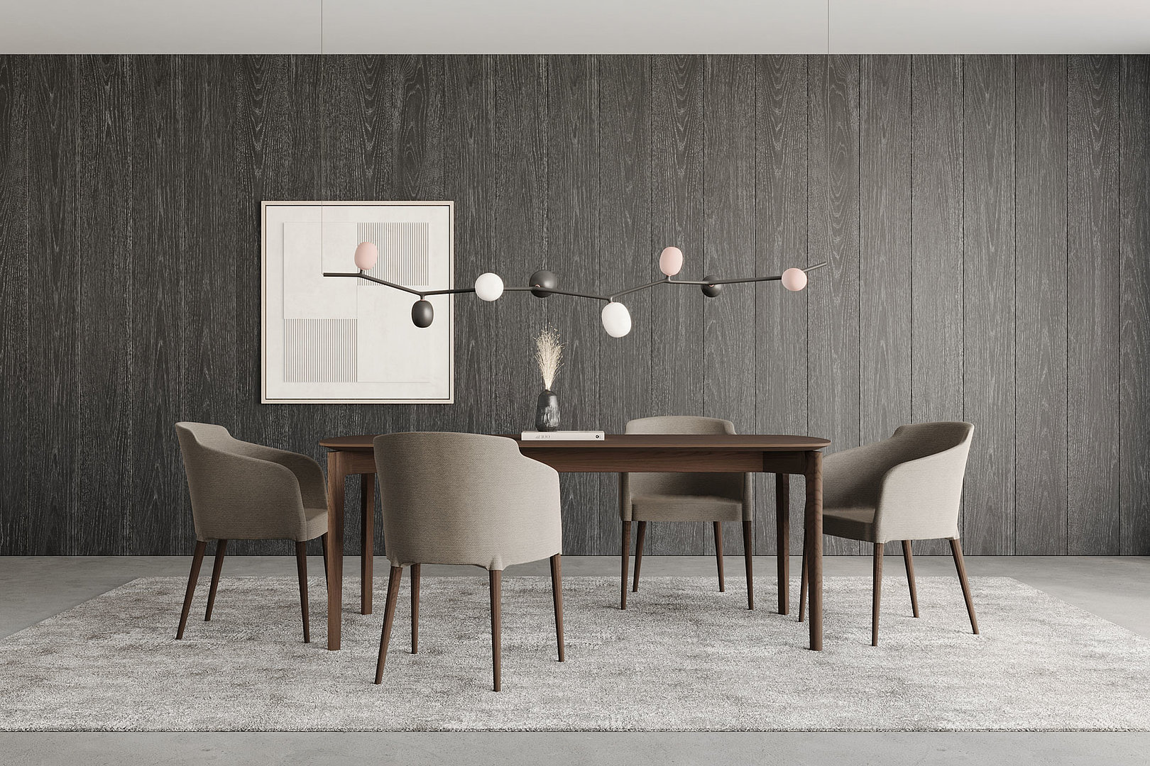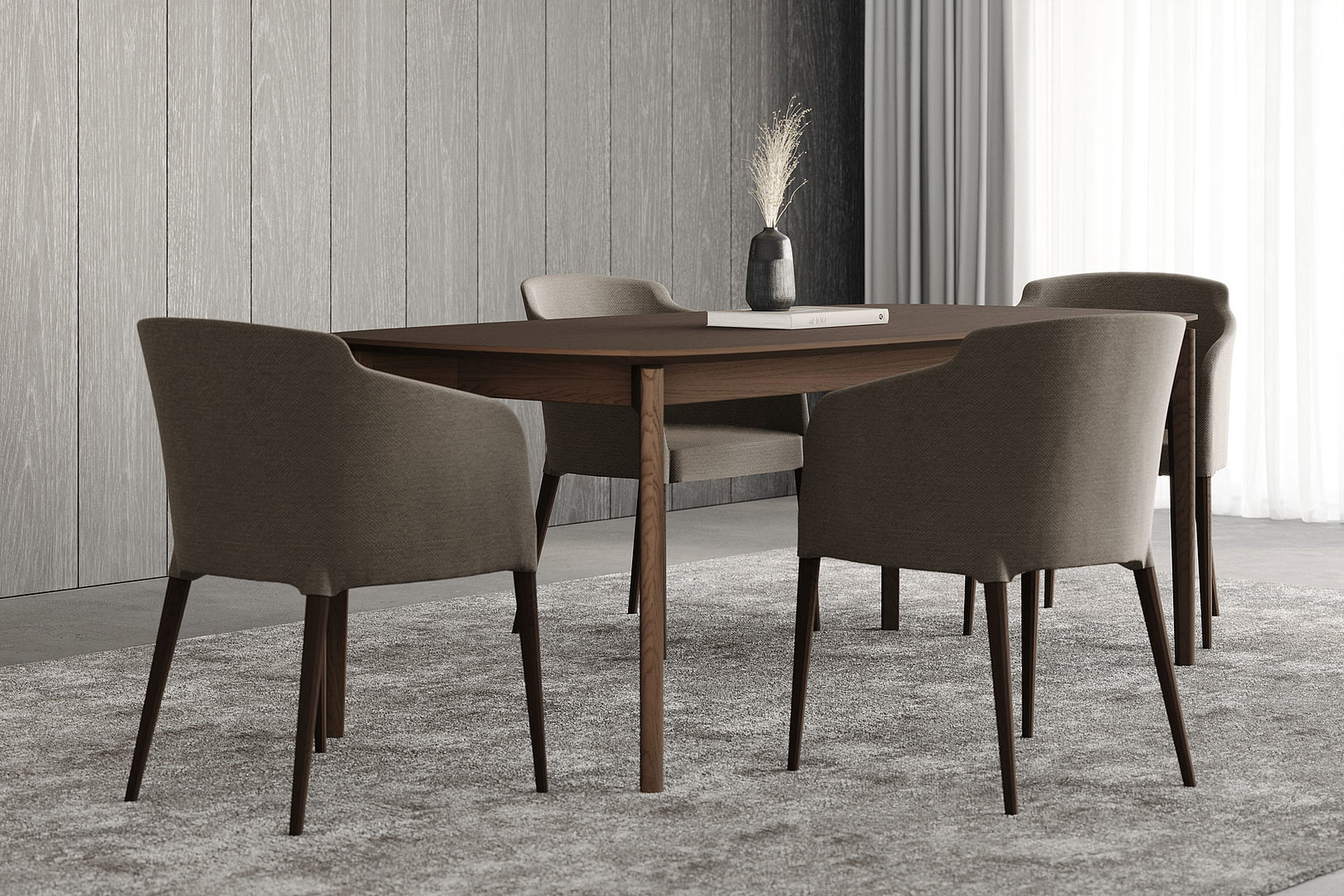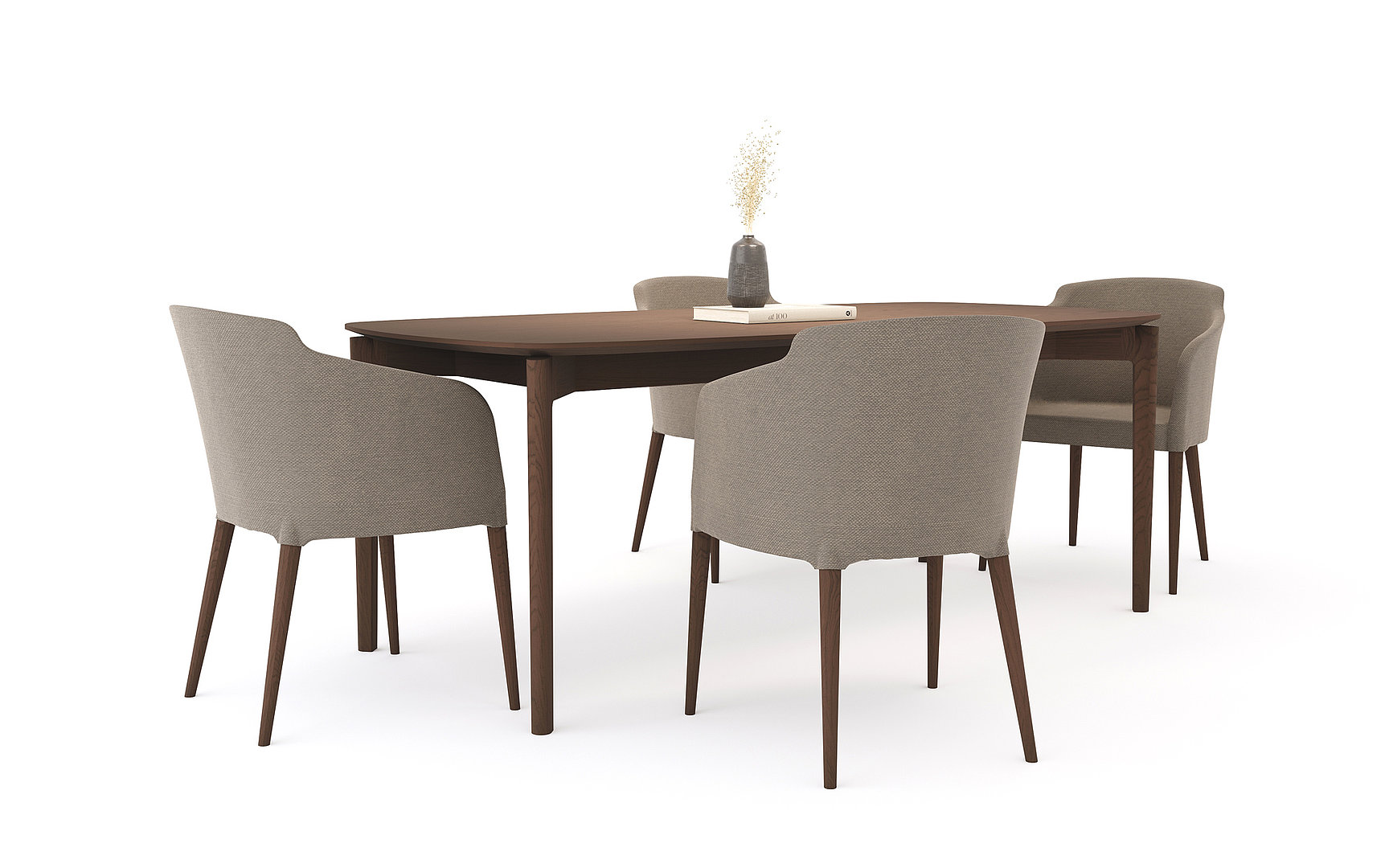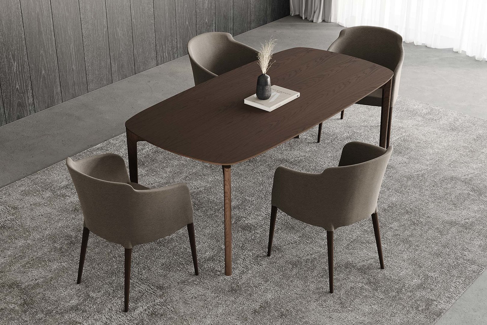 Obdélníkový jídelní stůl se zaoblenými rohy stolové desky s decentním zkosením a řemeslným zpracováním noh s napojením na lub. Kombinace těchto prvků tvoří elegantní a odlehčený dojem.
