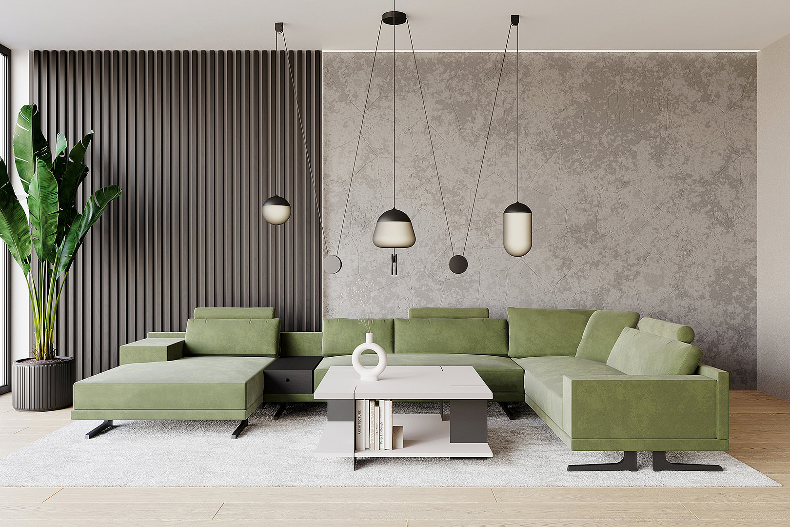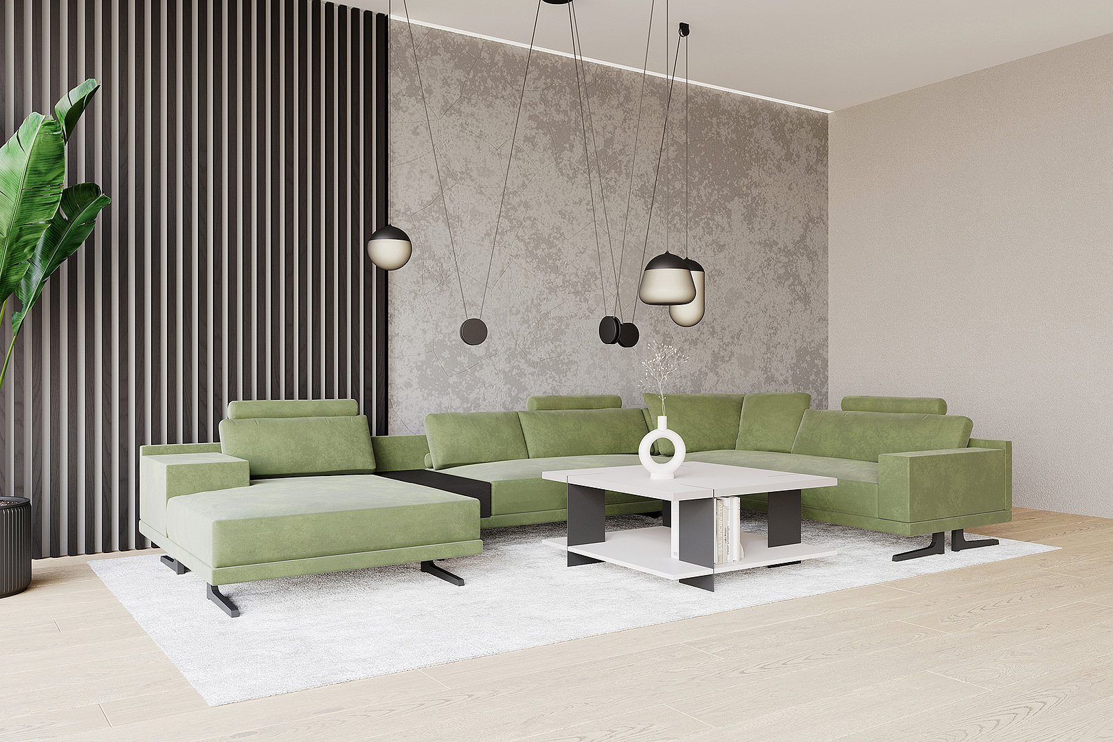 Designový konferenční stolek v kombinaci přírodní dýhy či lakovaného povrchu s kovovými prvky. Kovové části jsou zakomponovány do obou desek a současně tvoří jeho celou konstrukci.