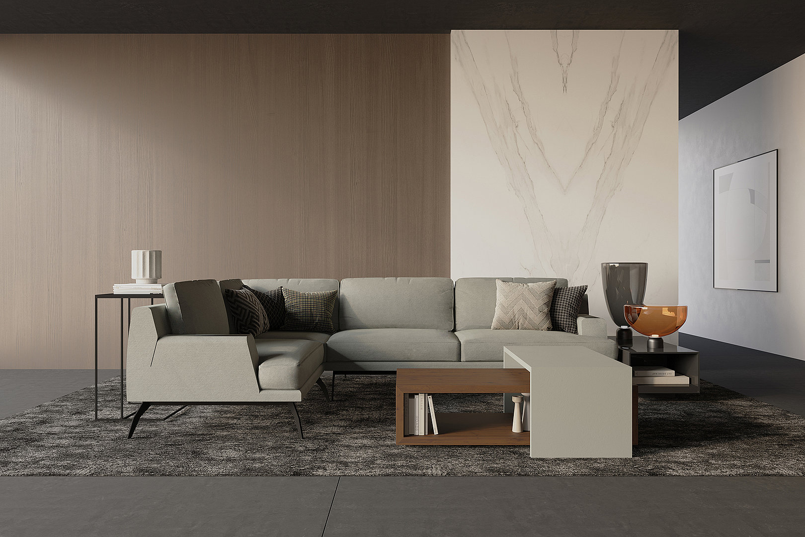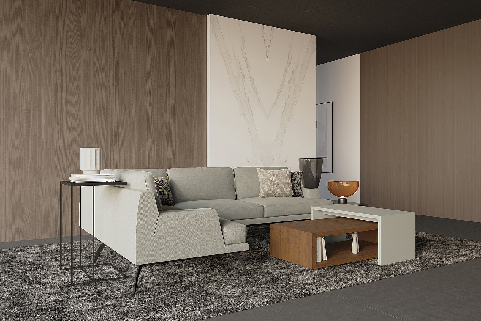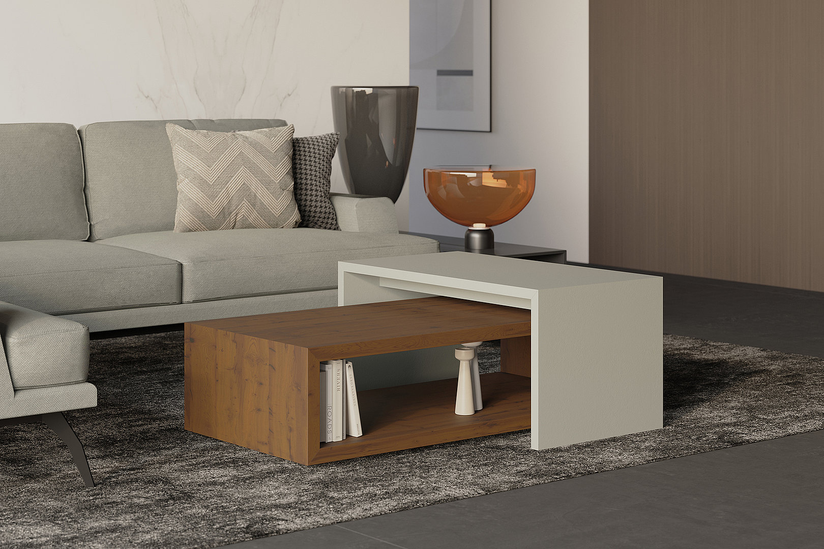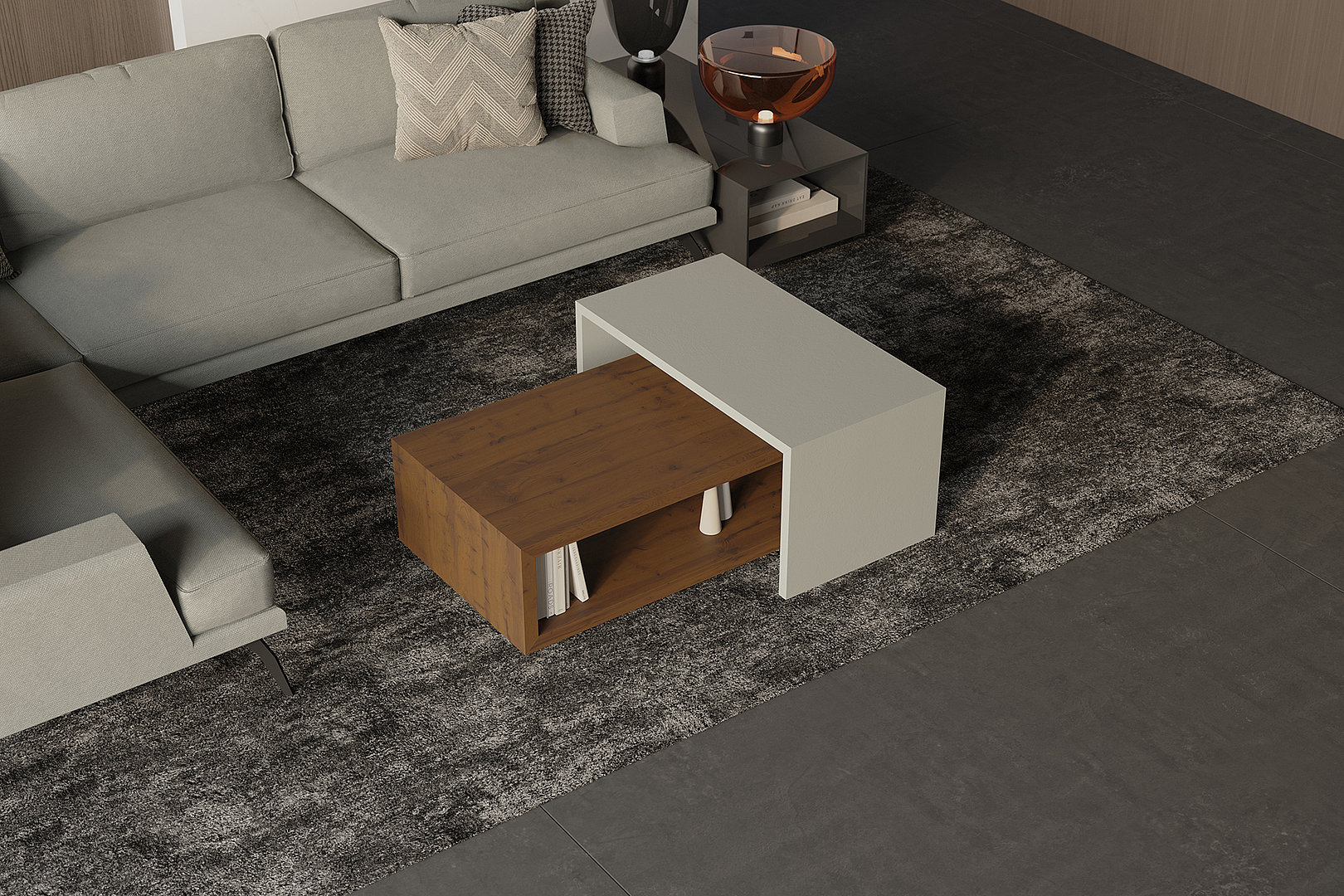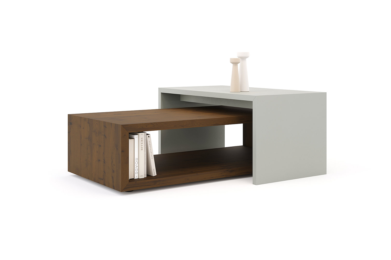 Dva do sebe zapadající konferenční stolky ve tvaru velikostně rozdílných obdélníků nabízí možnost střídání jejich umístění a vytváření zajímavých barevných a materiálových sestav.