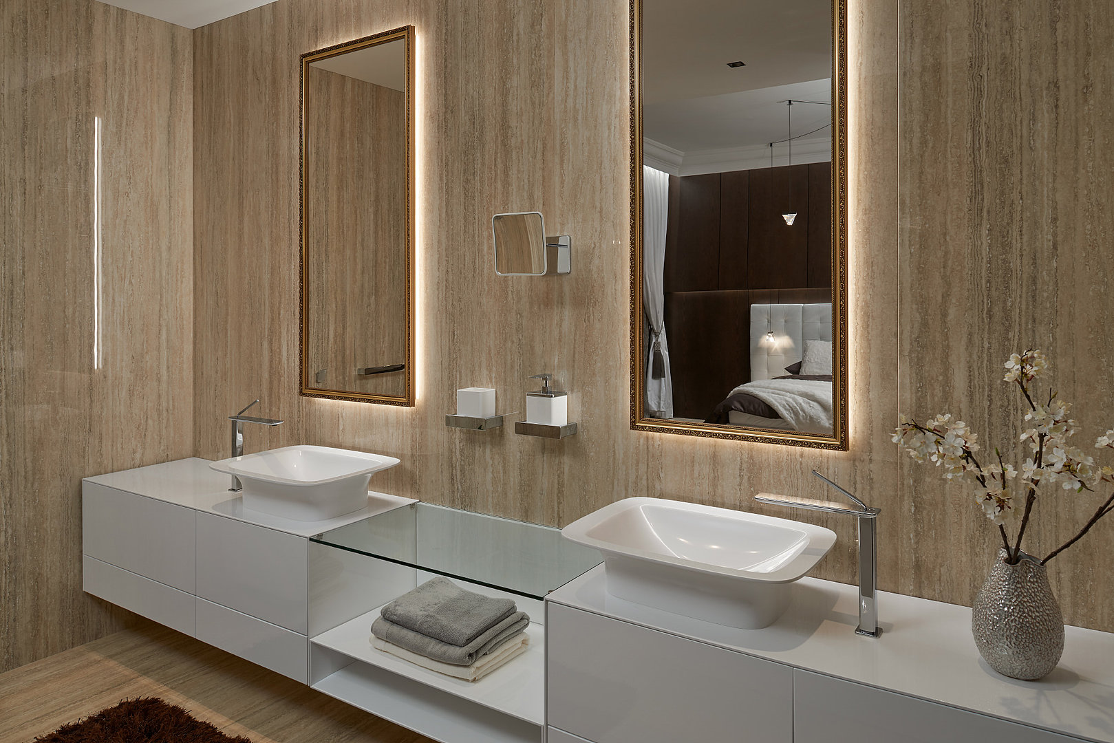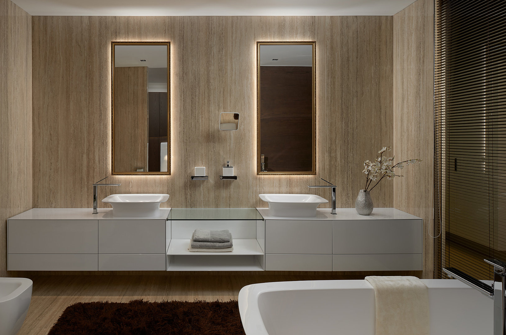 Tato koupelnová sestava představuje vysoce designovou záležitost. Má několik působivých detailů, počínaje subtilním korpusem, konče precizními spoji na pokos.