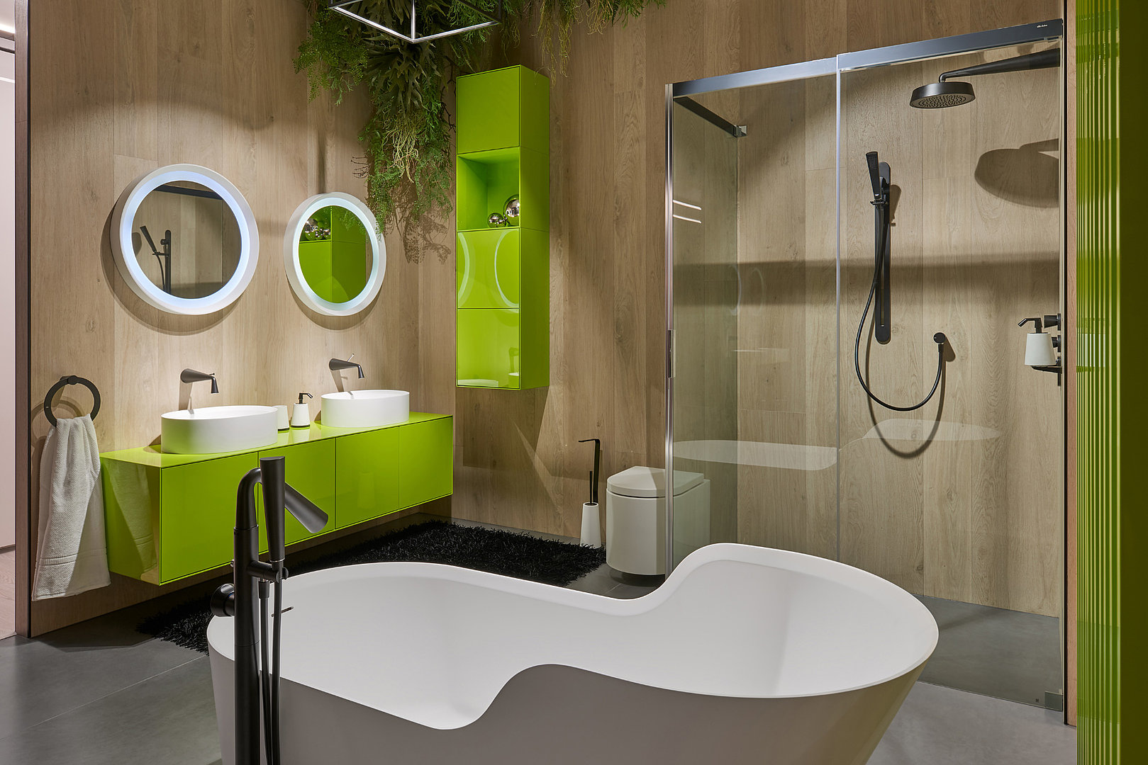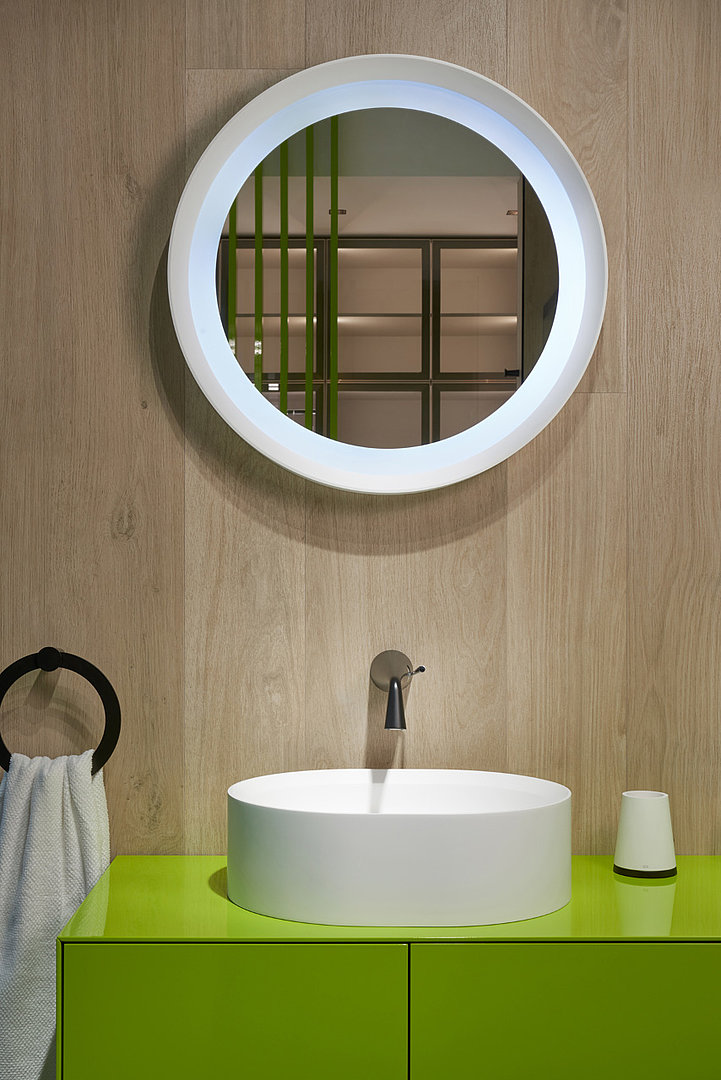 Koupelnová sestava s několika působivými detaily, počínaje subtilním korpusem a konče precizními spoji na pokos.