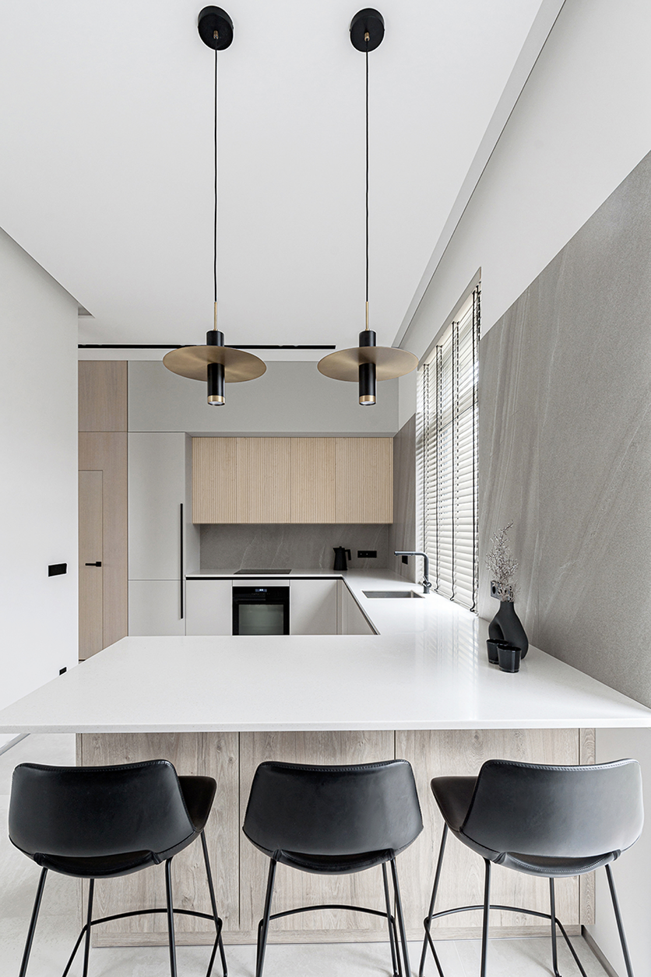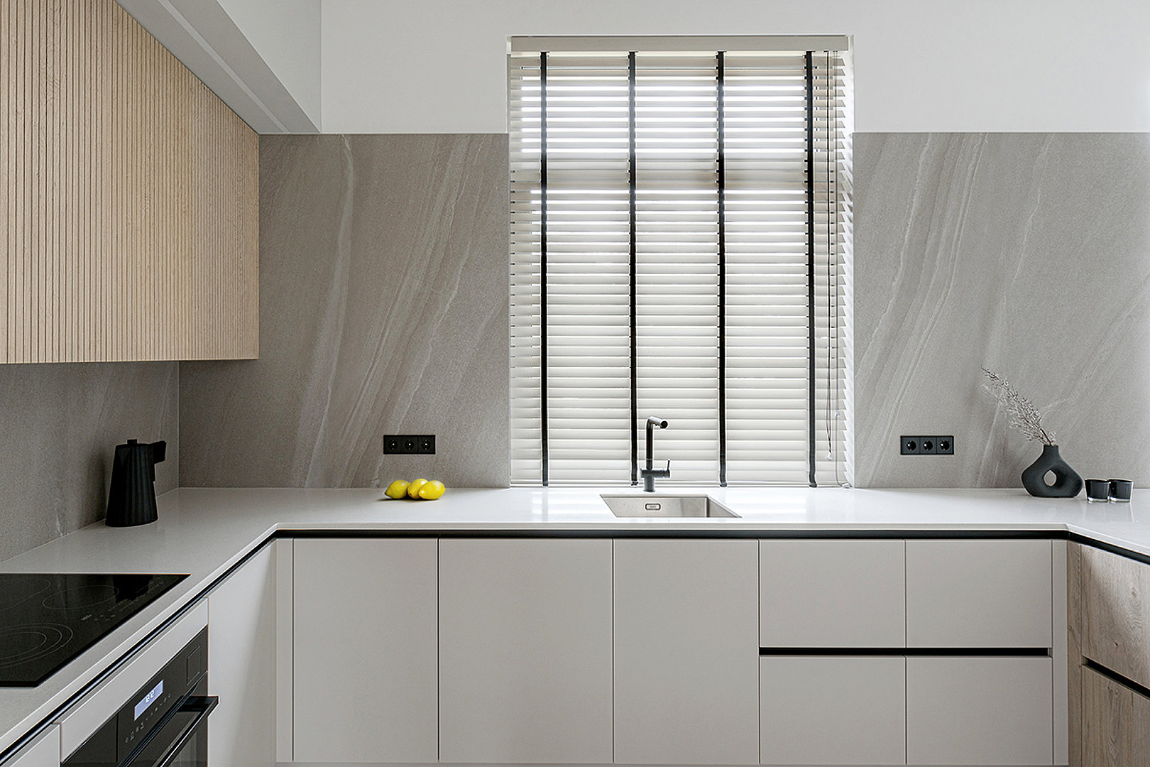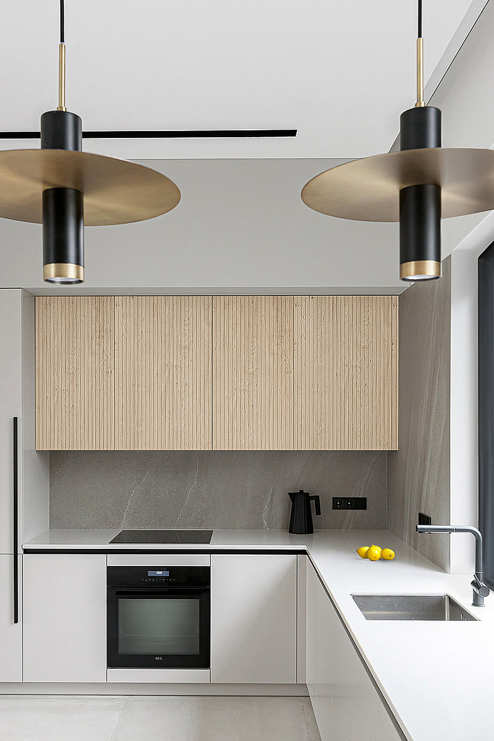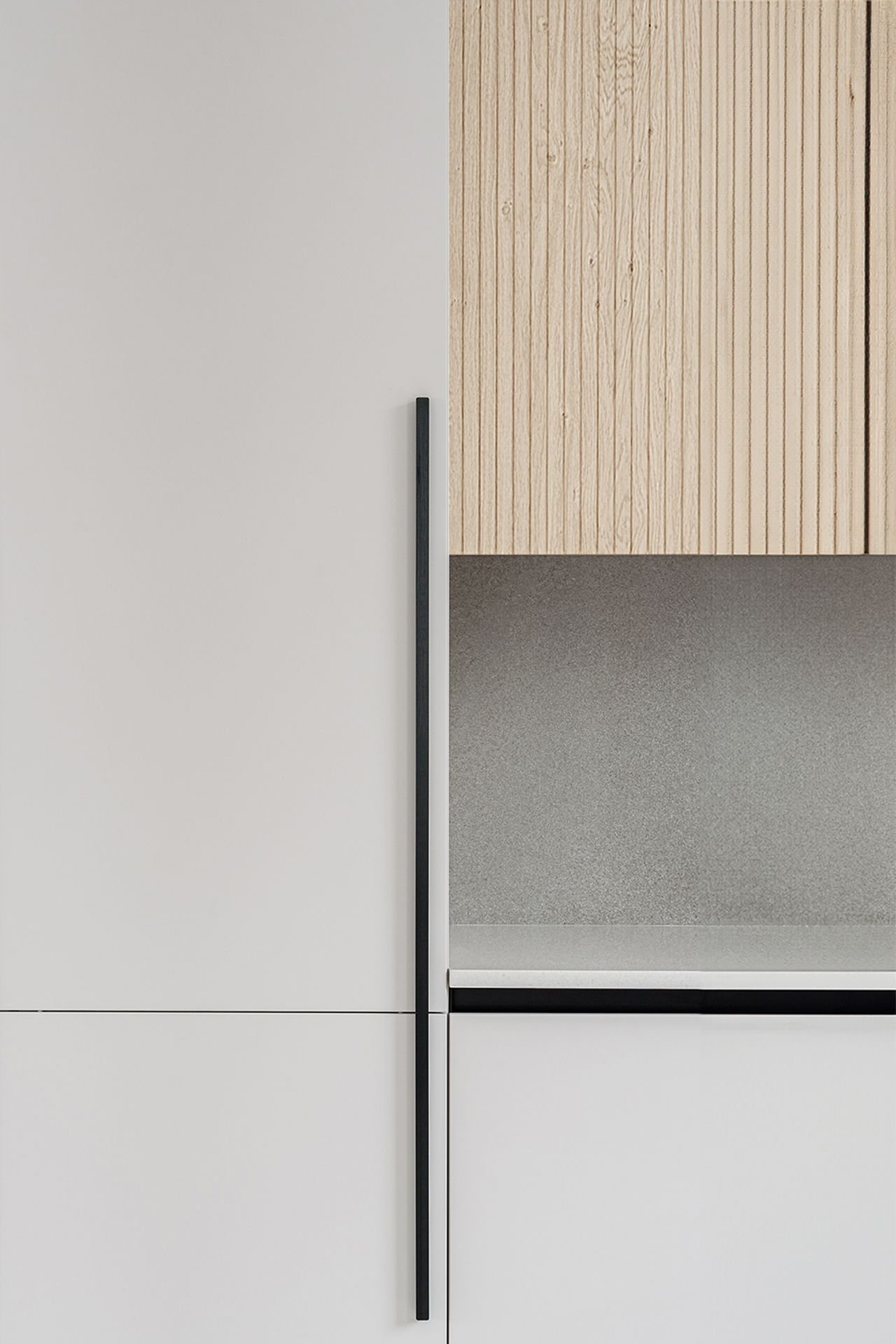 a symetrické drážky. Tento unikátní vizuální dojem, který drážky vytváří, přidává interiéru na dynamice a zároveň působí uklidňujícím dojmem, díky své symetrii a opakování.