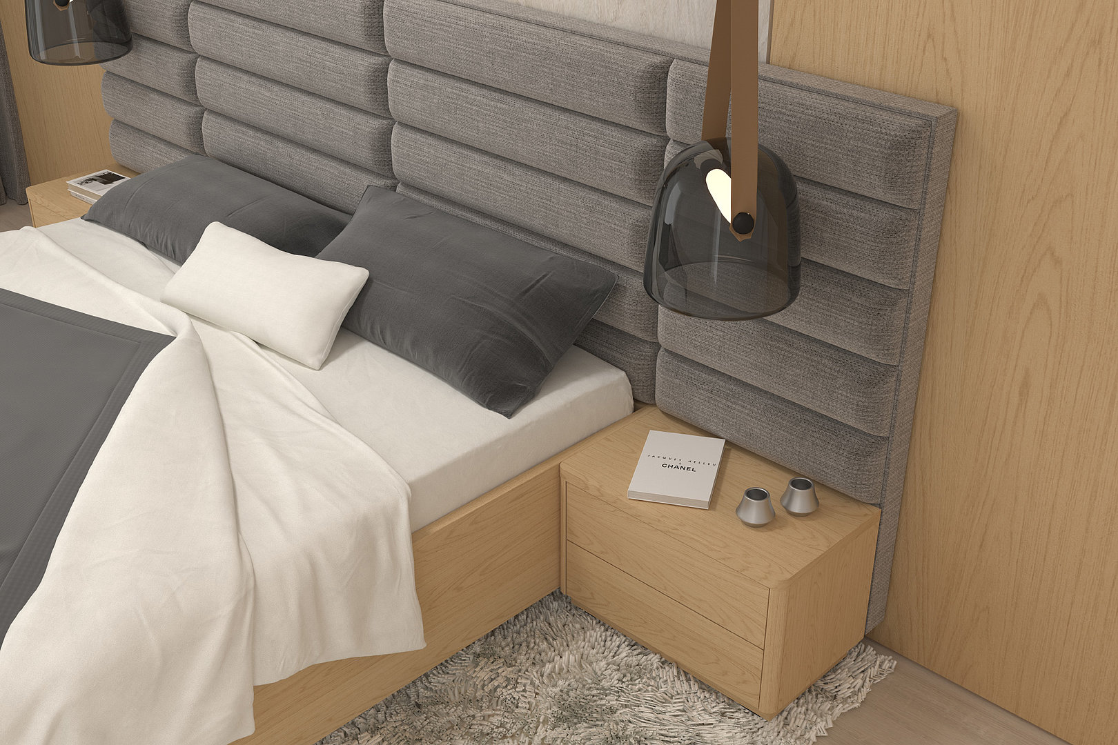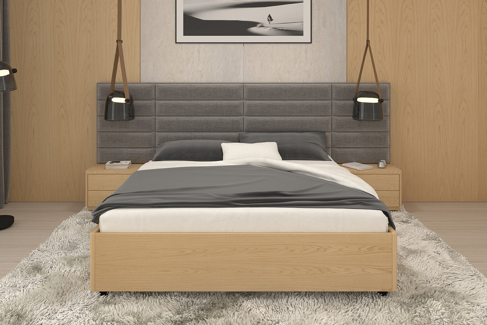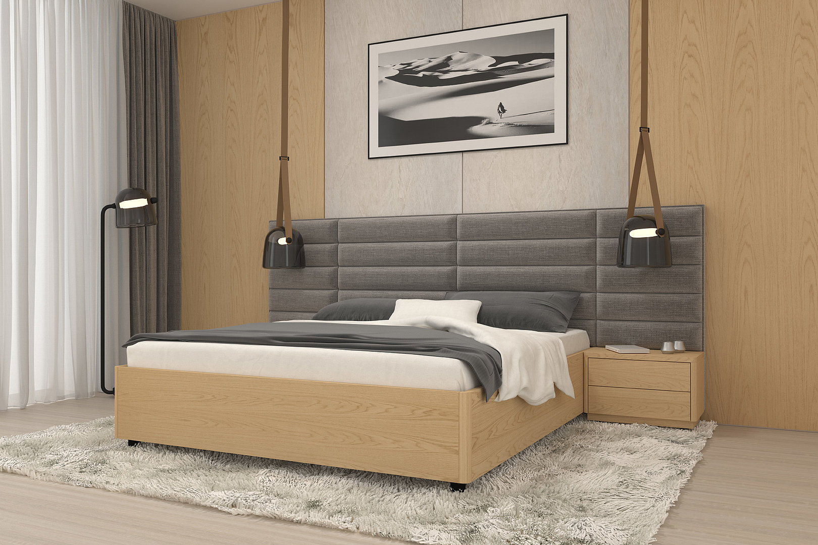 nočních stolků, rámu postele i prošití čela je sladěné do posledního detailu.