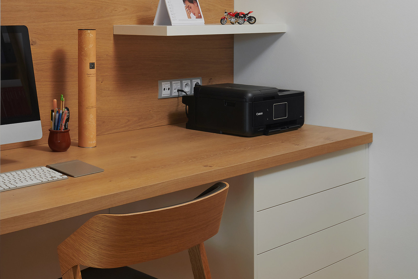 Útulná menší pracovna v příjemných přírodních odstínech, kde máte vše hned při ruce.
