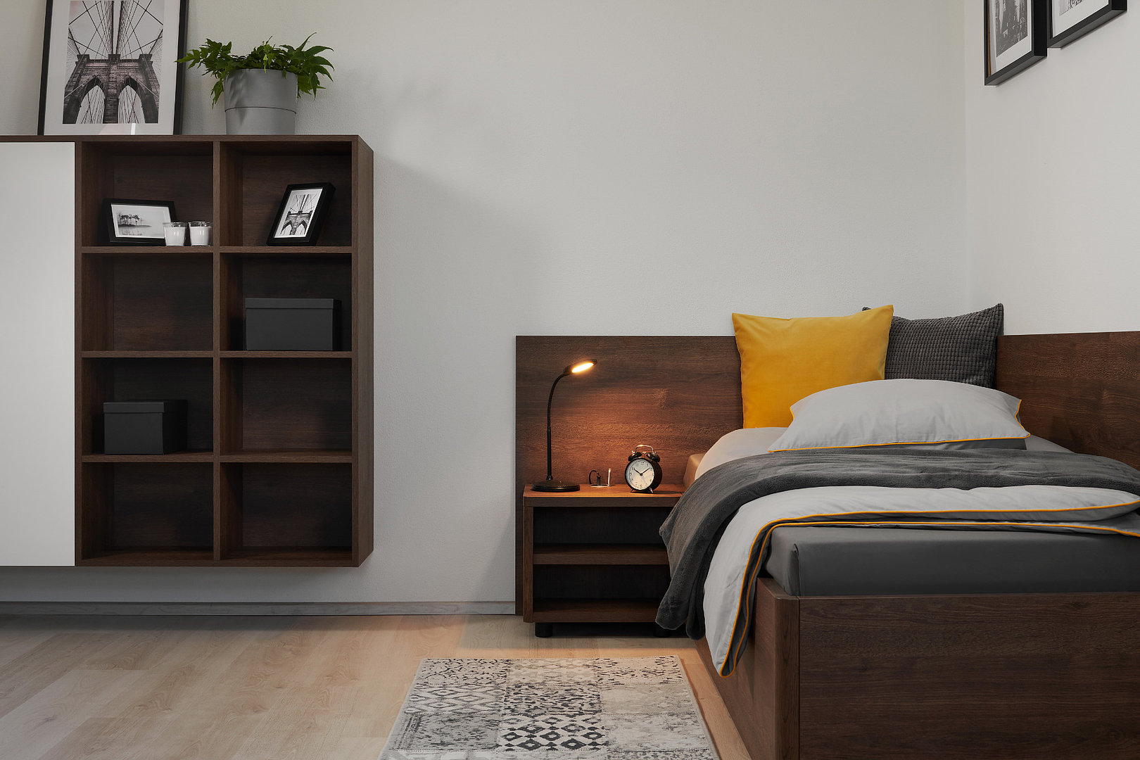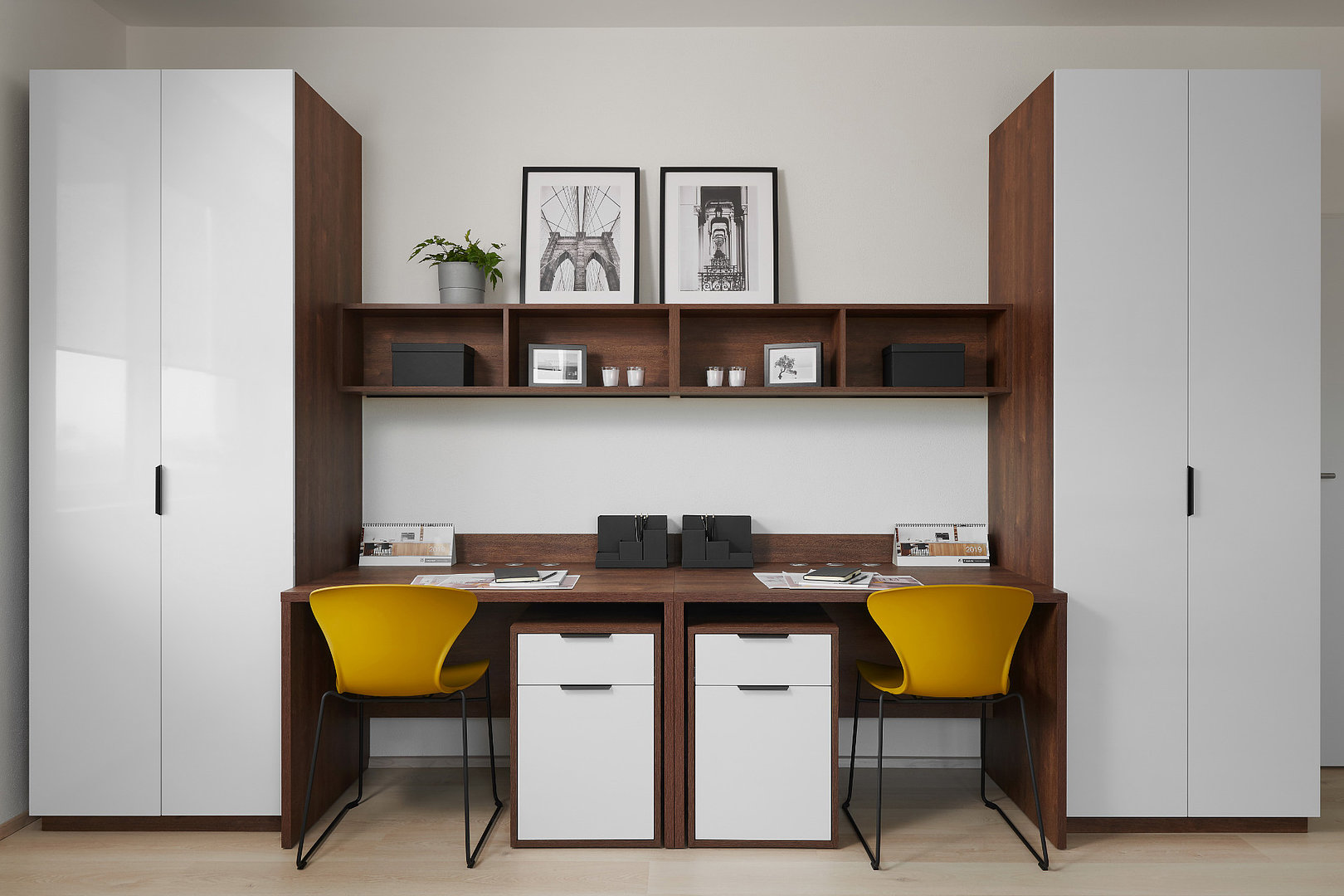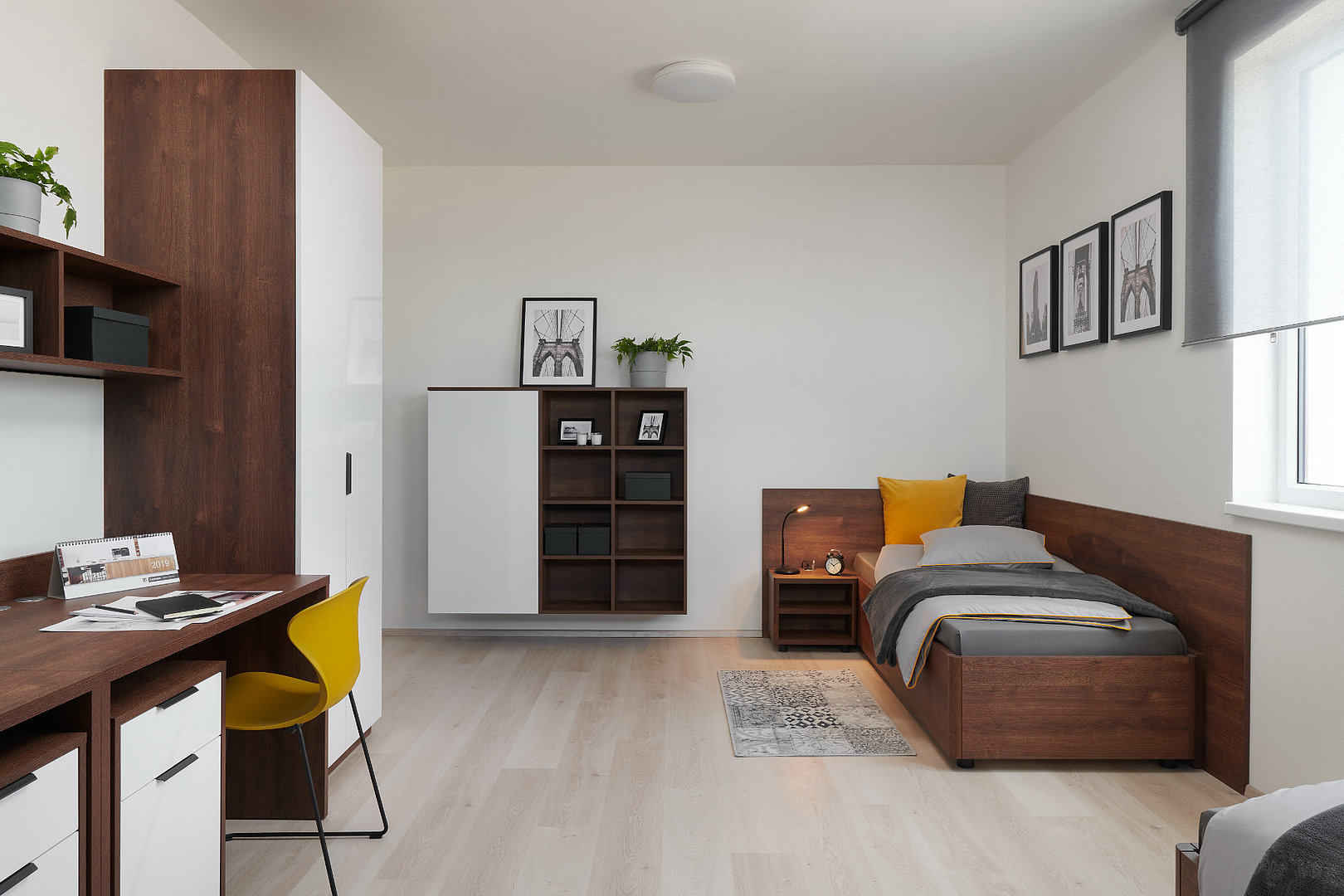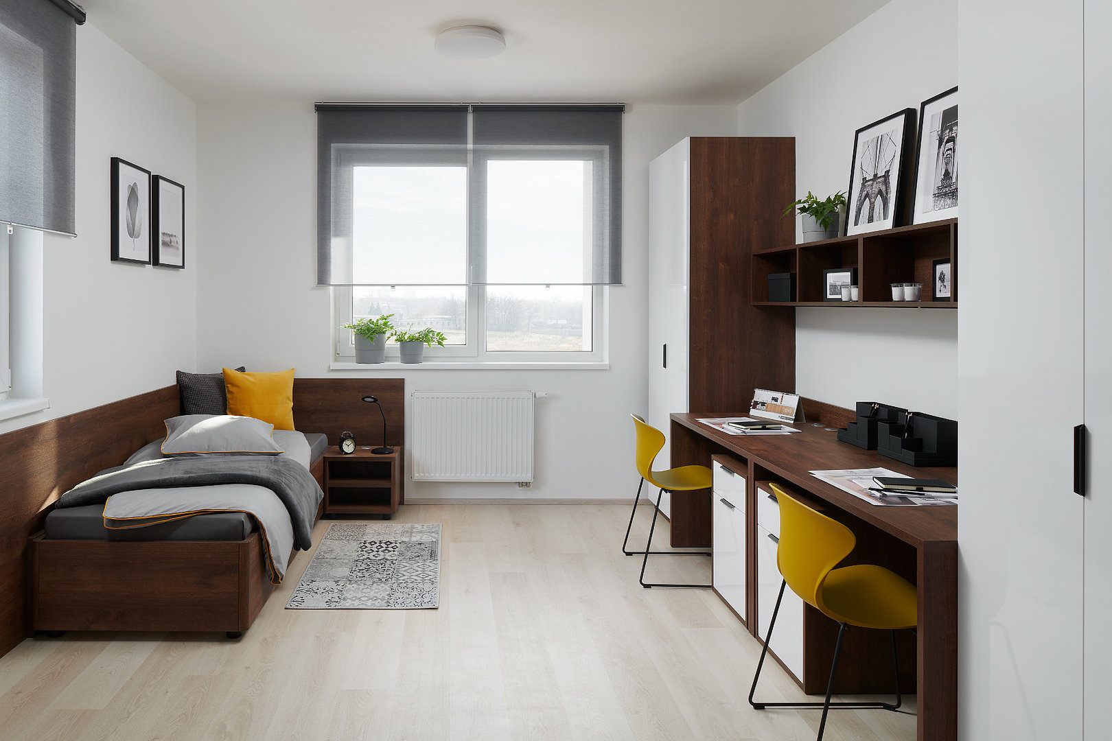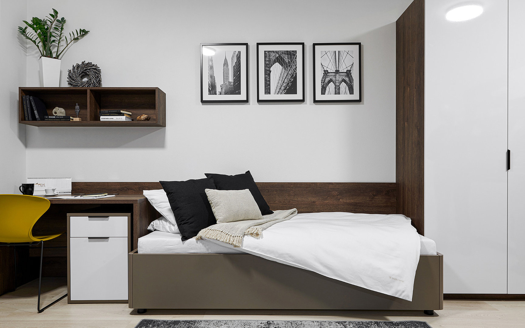 Praktické a komfortní řešení bydlení pro studenty. Jednoduchý a čistý design podtrhuje nadčasovost celého prostoru.