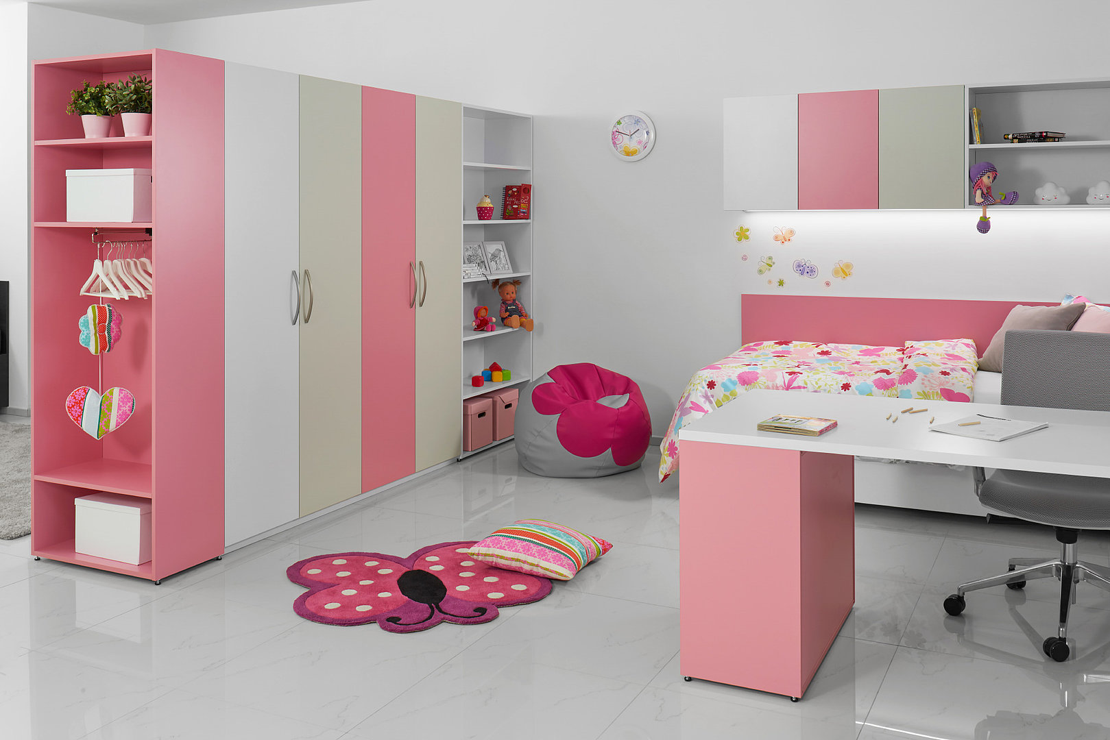 Království pro malé princezny v tlumených barevných odstínech matného laku. Nechybí šatní skříň na šaty, otevřené niky na hračky i pohodlná postel pro kvalitní spánek.