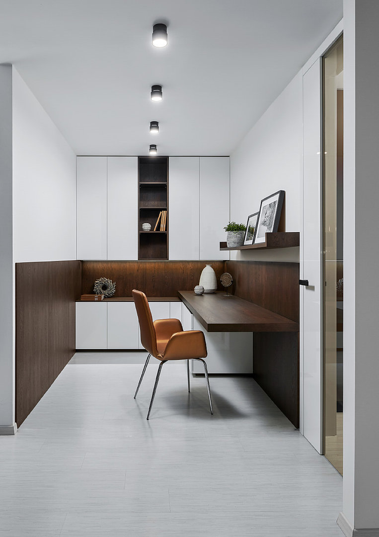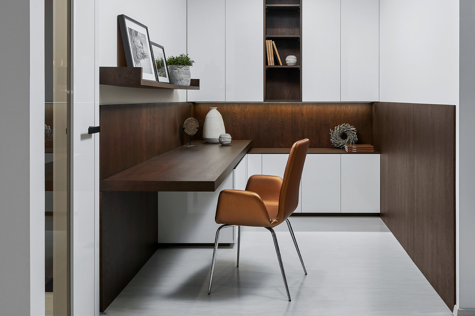 Malá, ale velmi vkusná pracovna s vysokými horními skříňkami, které nabízí spoustu úložného prostoru.