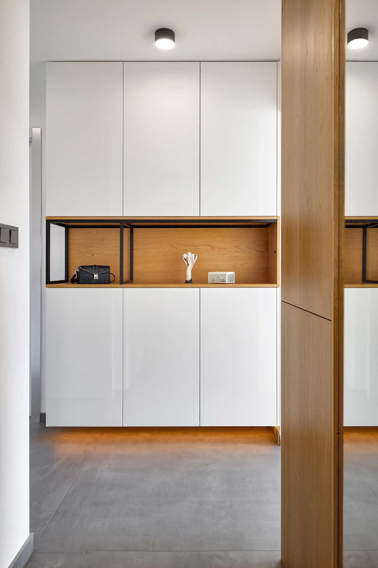šatny ozvláštňuje kovová konstrukce, díky které šatna působí téměř levitujícím dojmem.