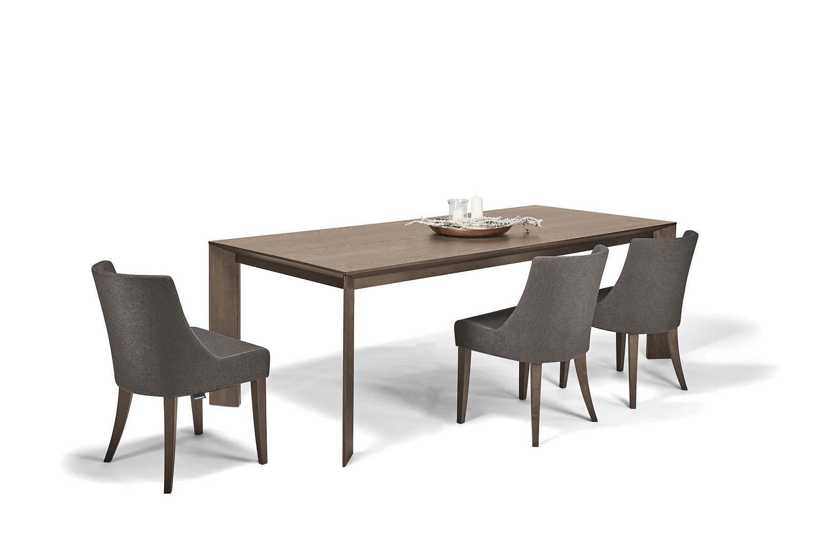 Čalounické materiály nabízí širokou paletu vysoce kvalitních látek a kůží od předních evropských dodavatelů a jsou dostupné v mnoha barevných variantách dle aktuálních vzorníků. Moření dřevěných podnoží ladí s našimi jídelními stoly.