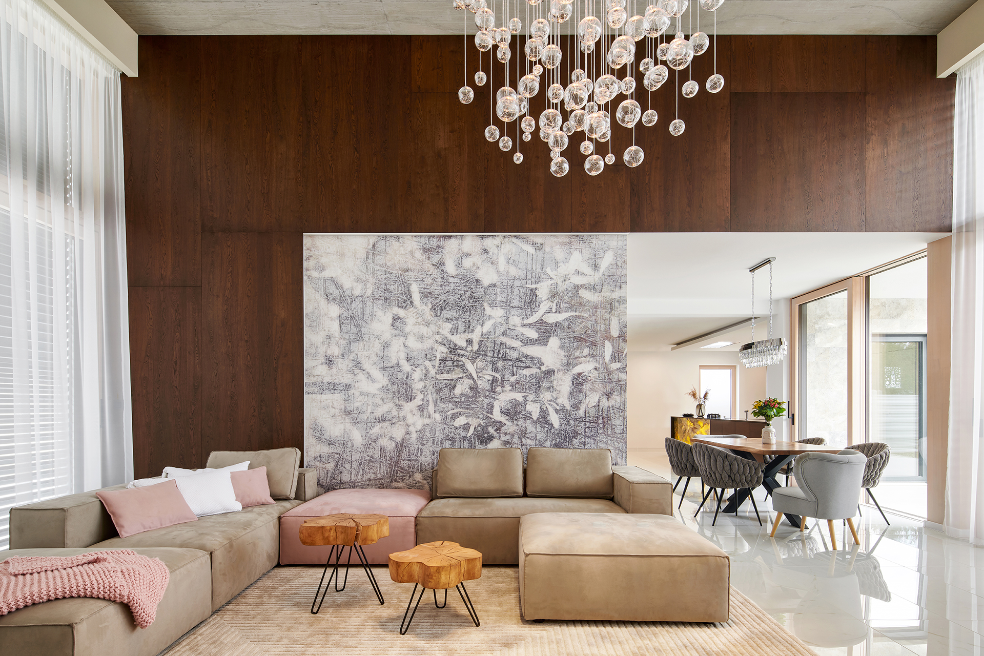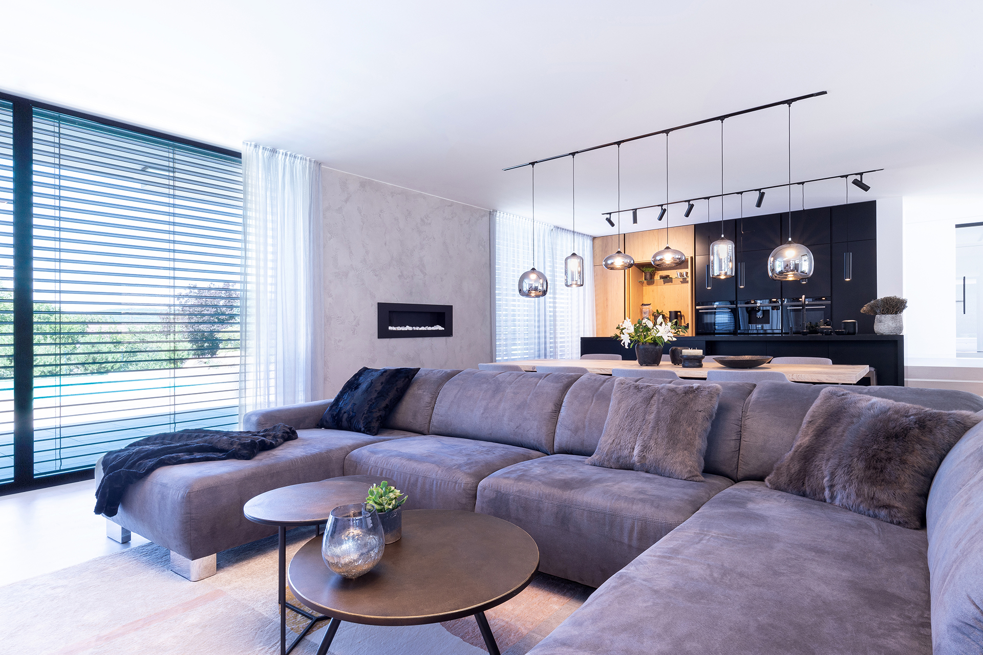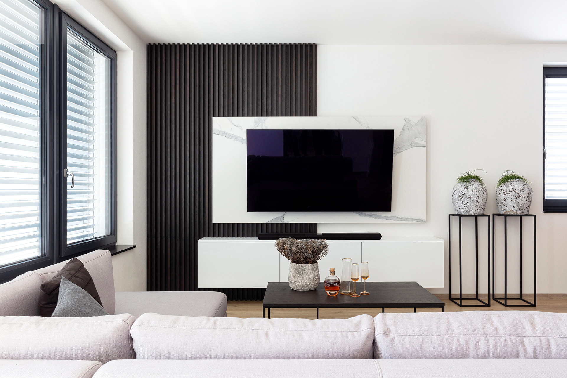 Designové obývací sestavy a konferenční stoly ve stejném dekoru.