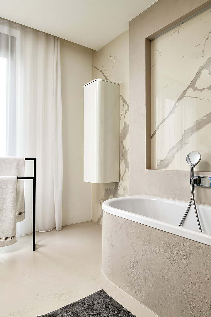 Celý interiér je v provedení prémiové dýhy dub americký carbon + lak mat titan s keramickou deskou a obklady Laminam Statuario Venato. V realizace se nachází dvě koupelné, které jsou vybaveny nábytkem HANÁK, včetně keramiky.
