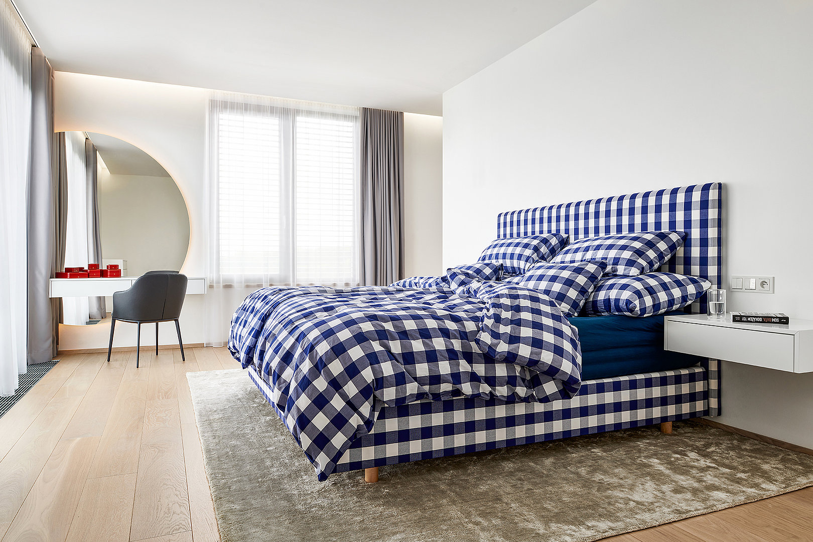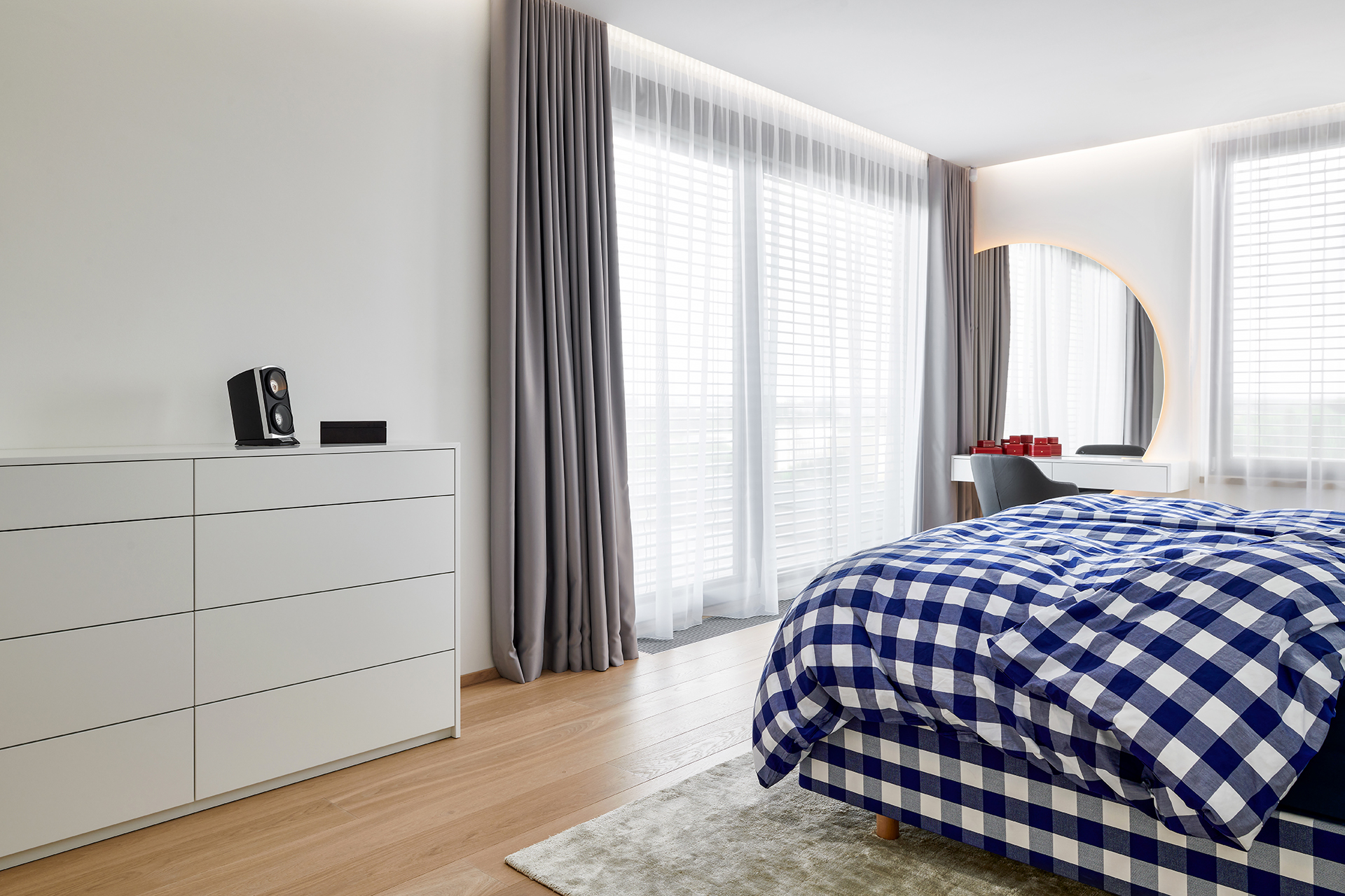 Celý interiér je v provedení prémiové dýhy dub americký carbon + lak mat titan s keramickou deskou a obklady Laminam Statuario Venato. Ložnice a šatna je provedena v bílem matném laku polar. V ložnici designéři použili atypické noční stolky, komodu a toaletní stolek.