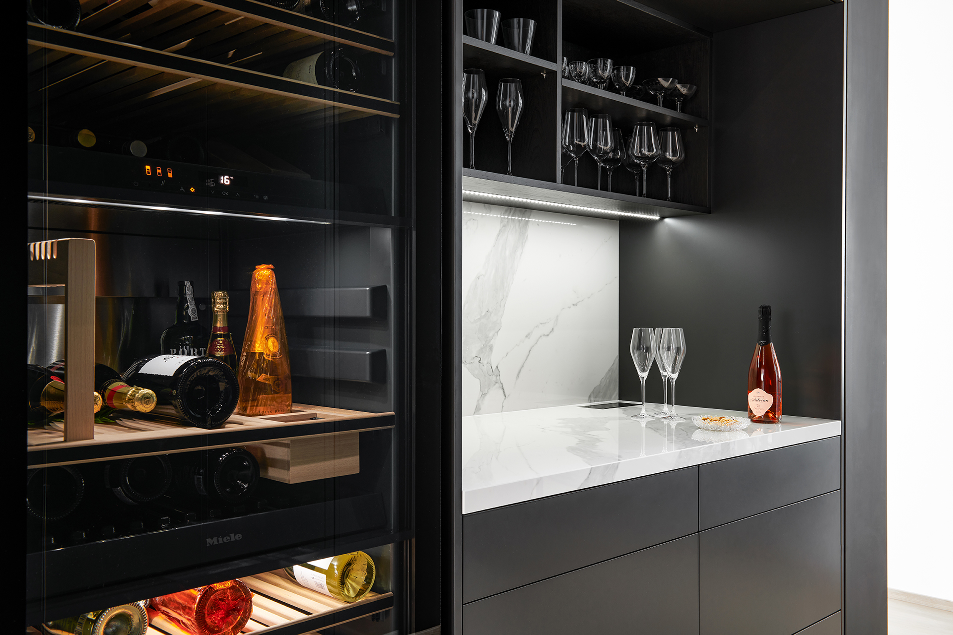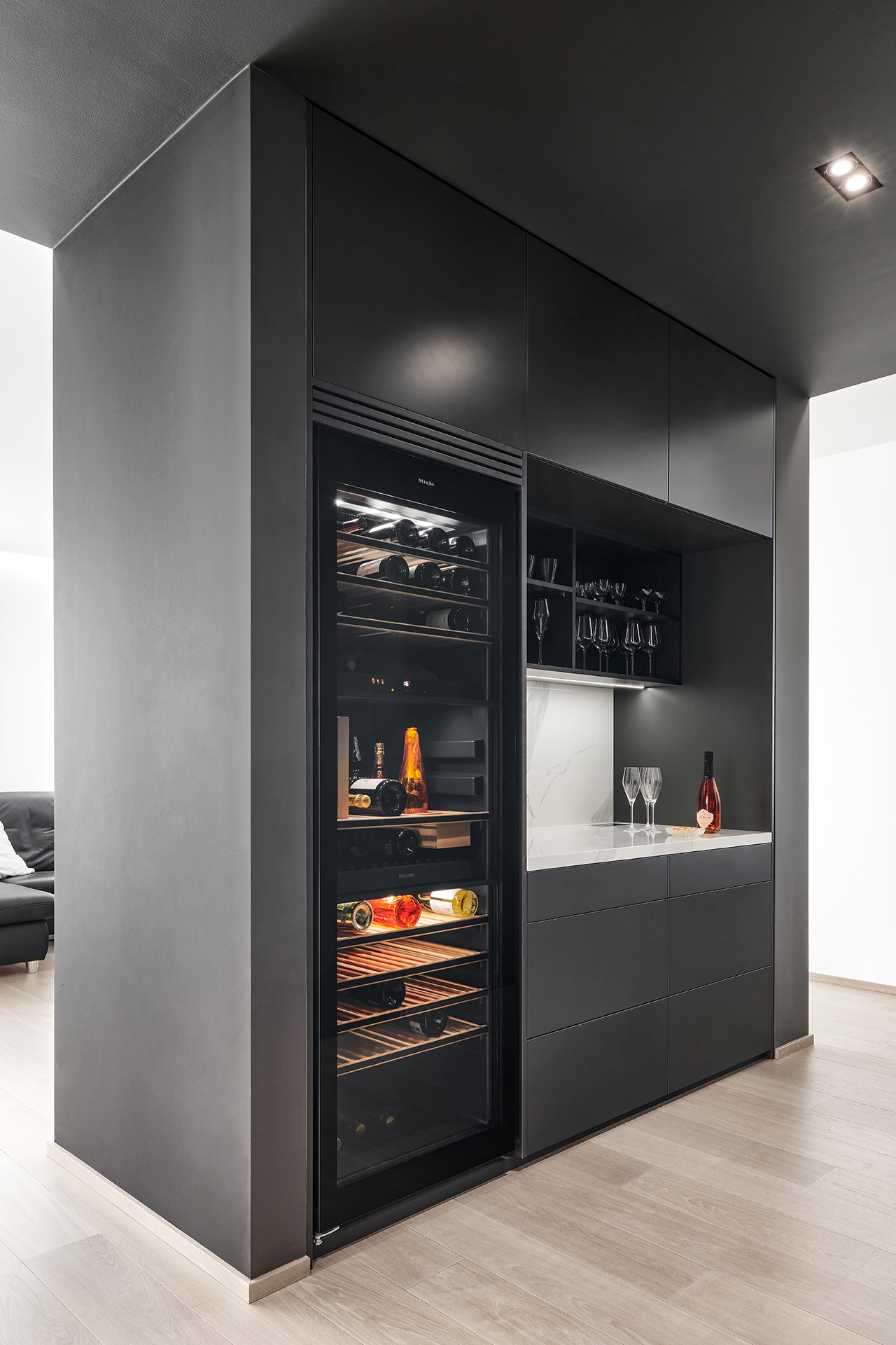 Celý interiér je v provedení prémiové dýhy dub americký carbon + lak mat titan s keramickou deskou a obklady Laminam Statuario. Obývací pokoj je proveden v minimalistickém stylu. Investor si nechal realizovat i stylový pánský pokoj – HARMONY stěna lak titan v kombinaci dýha dub americký. Technická místnost a vinotéka je v provedení lak mat titan.