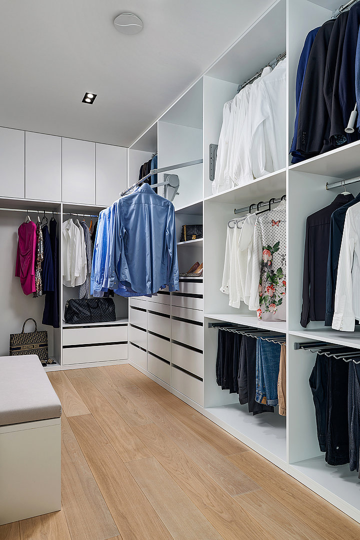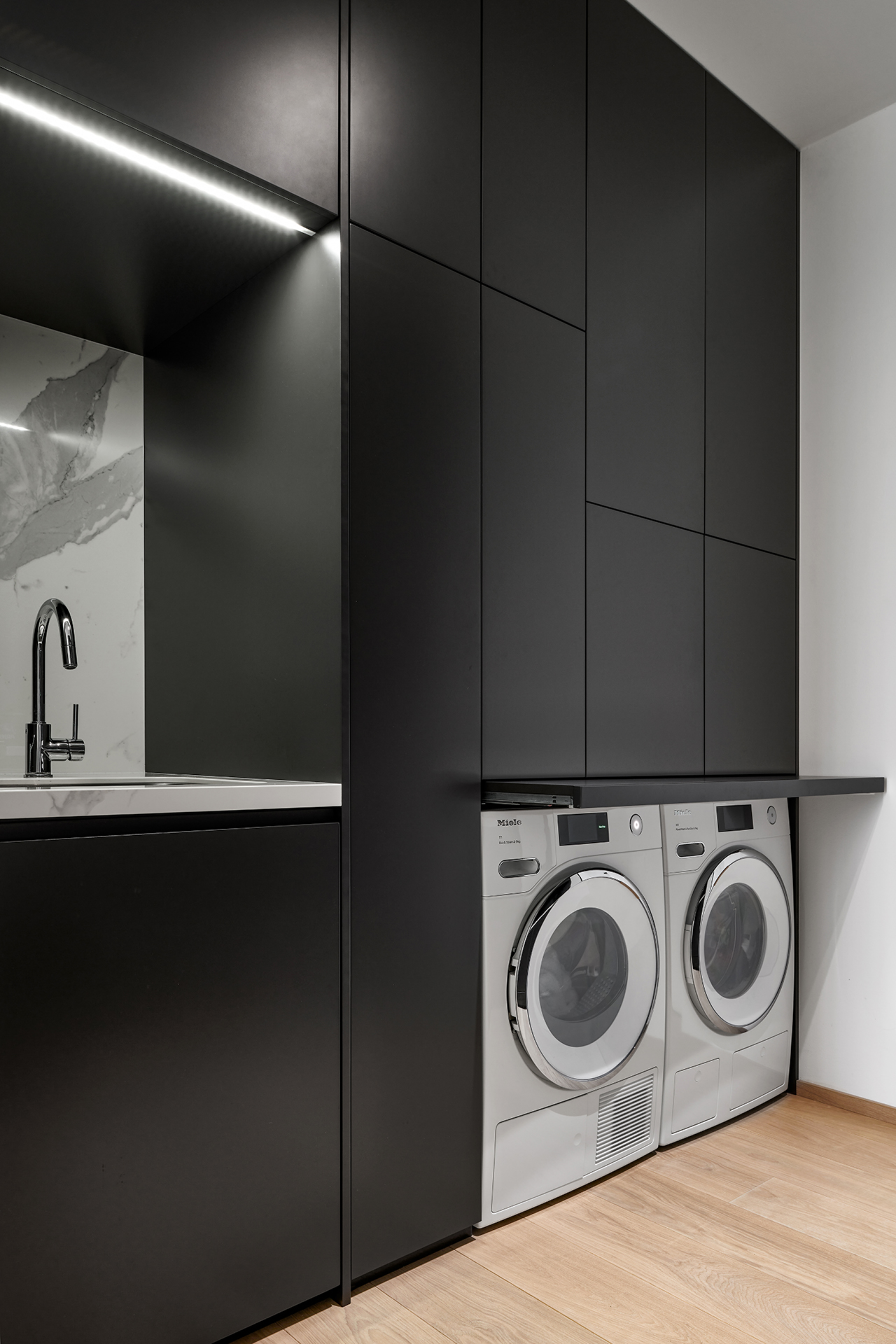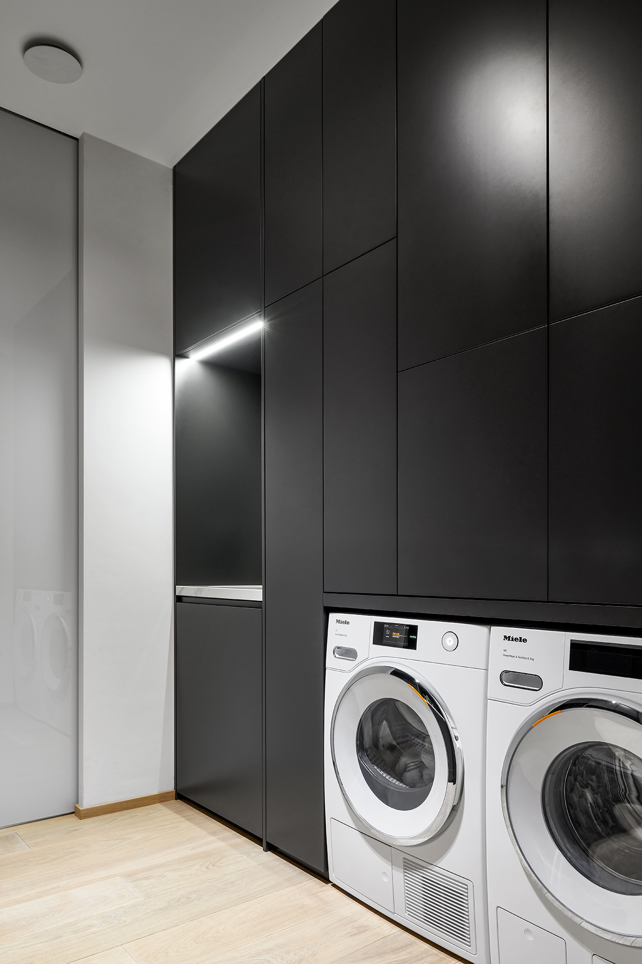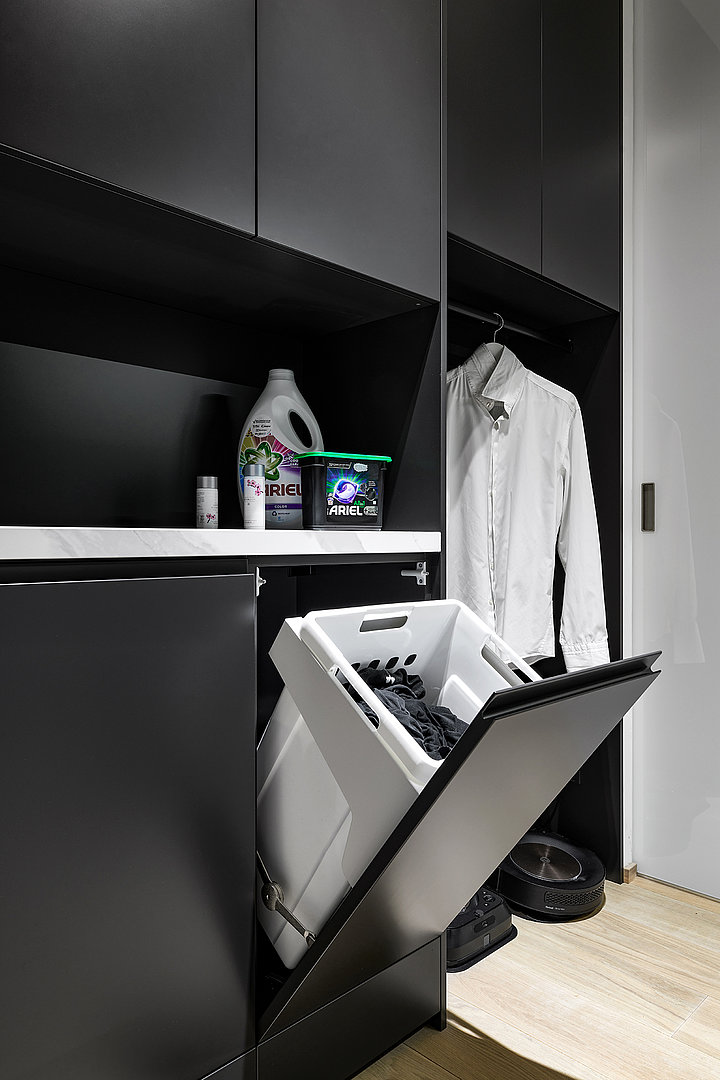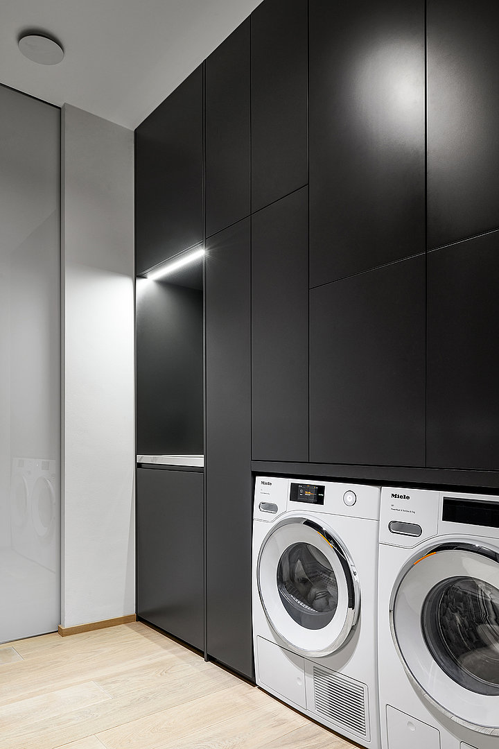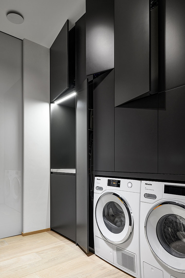 Celý interiér je v provedení prémiové dýhy dub americký carbon + lak mat titan s keramickou deskou a obklady Laminam Statuario Venato. Technická místnost je v provedení lak mat titan. V realizaci byla použita otevřená šatna HARMONY.