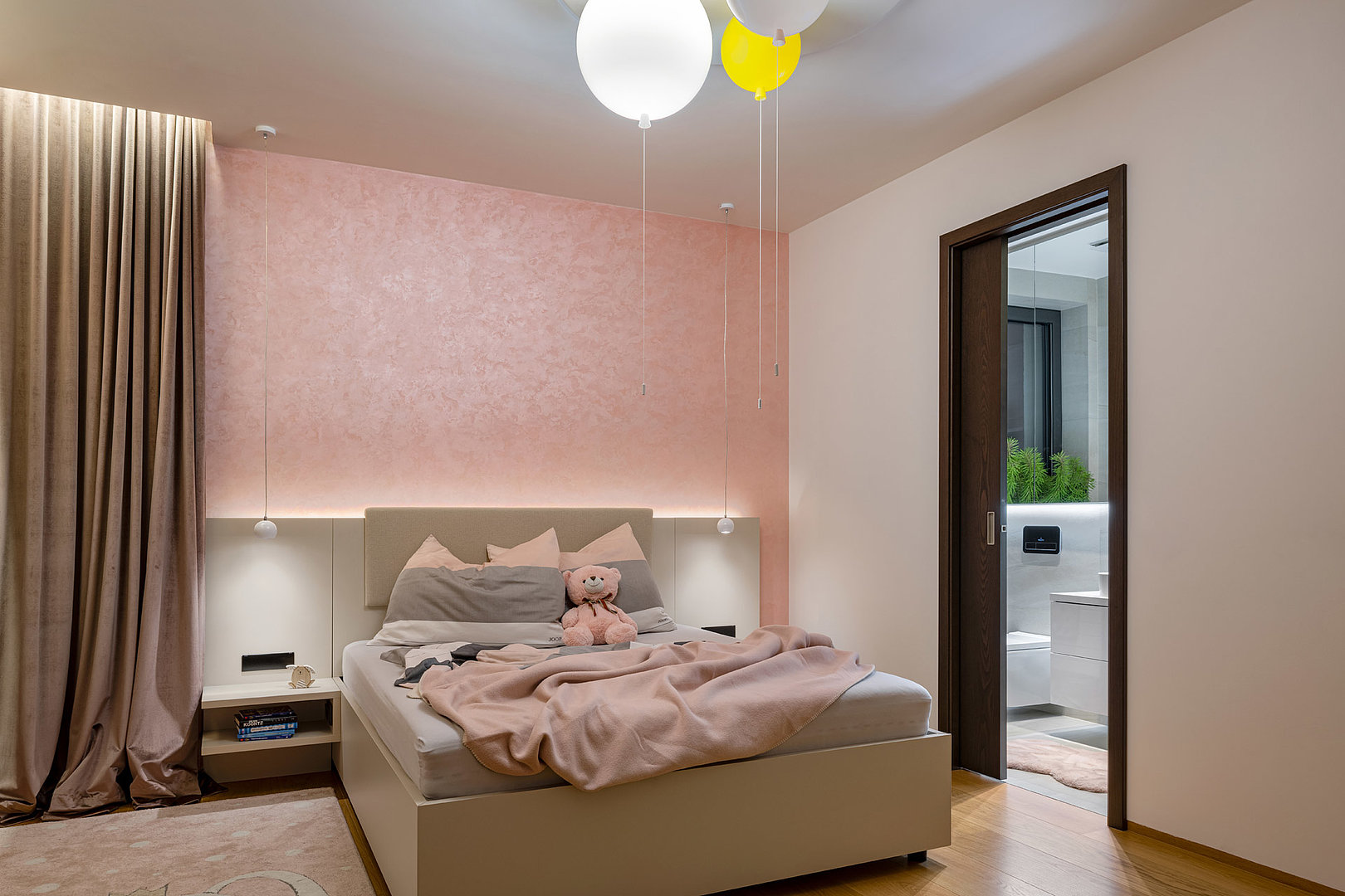 Vzdušné dětské pokojíčky pro kluka a holčičku zařízené jednoduše a prakticky tak, aby vyhovovaly dětským potřebám. Interiérové dveře nabízí soukromí i vstup do vlastních šaten a koupelen.