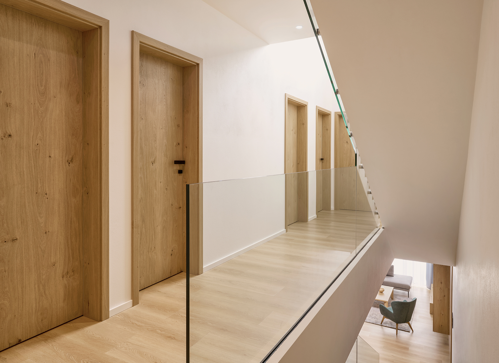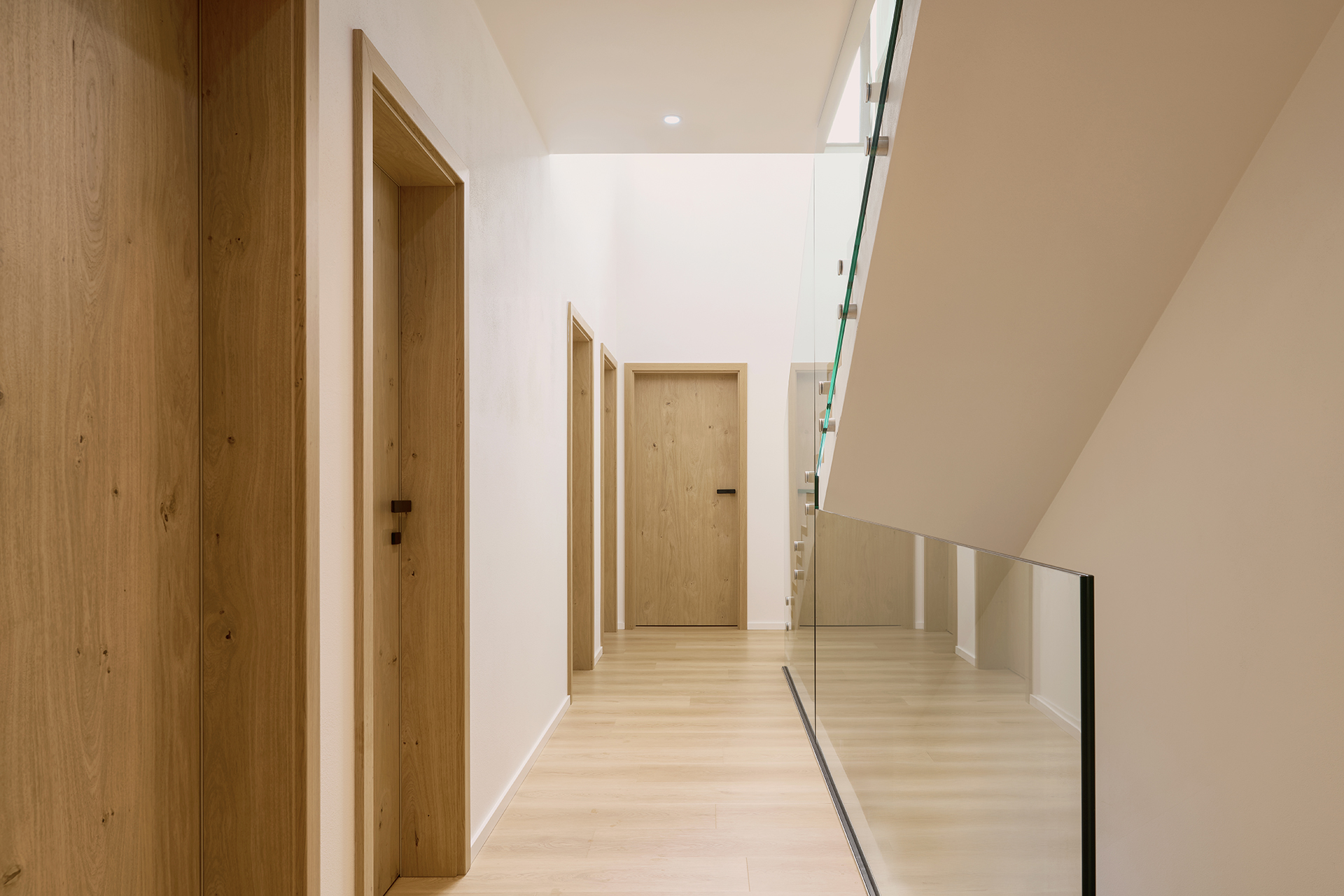 Vestavěné skříně LINE/OPTIMA přinášejí do předsíně i šatny pořádek a zároveň esteticky doplňují celkový vzhled domu. Dokonalé zakončení prostoru tvoří dveře SPACE v přírodním dekoru, které sjednocují jednotlivé místnosti a podtrhují styl celého interiéru.