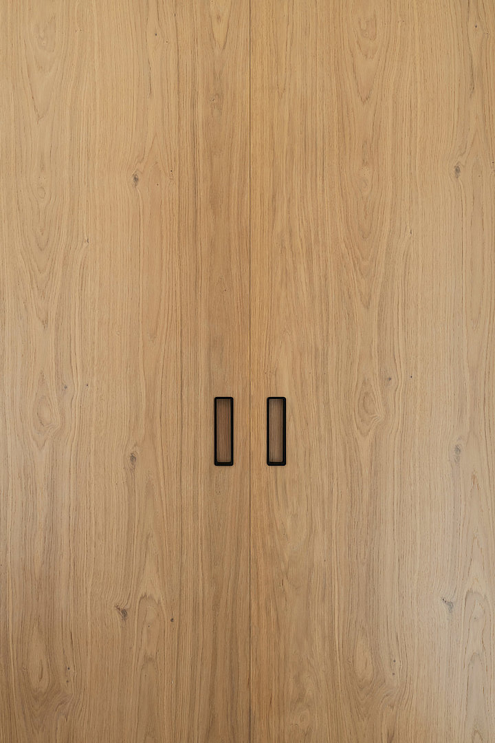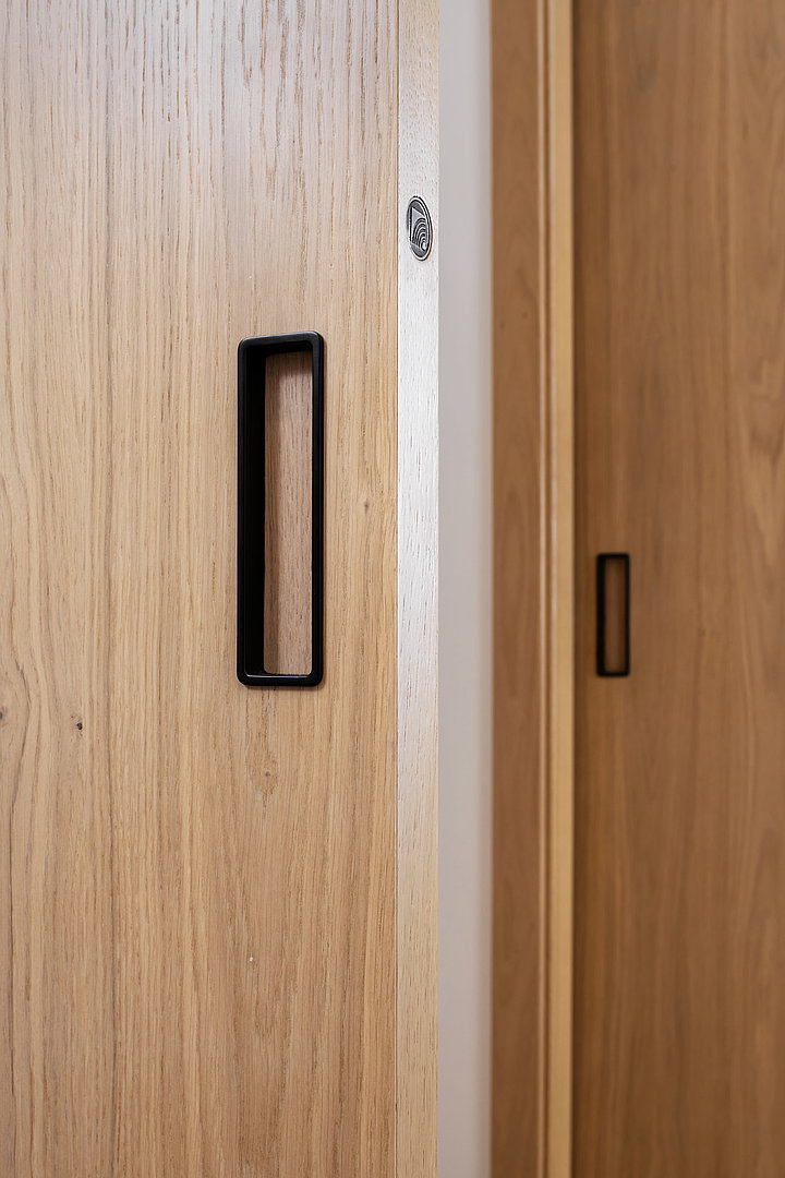 Dýhované interiérové dveře s praktickým magnetickým zámkem. Klient si vybral variantu otevíravých i posuvných dvoukřídlých dveří.