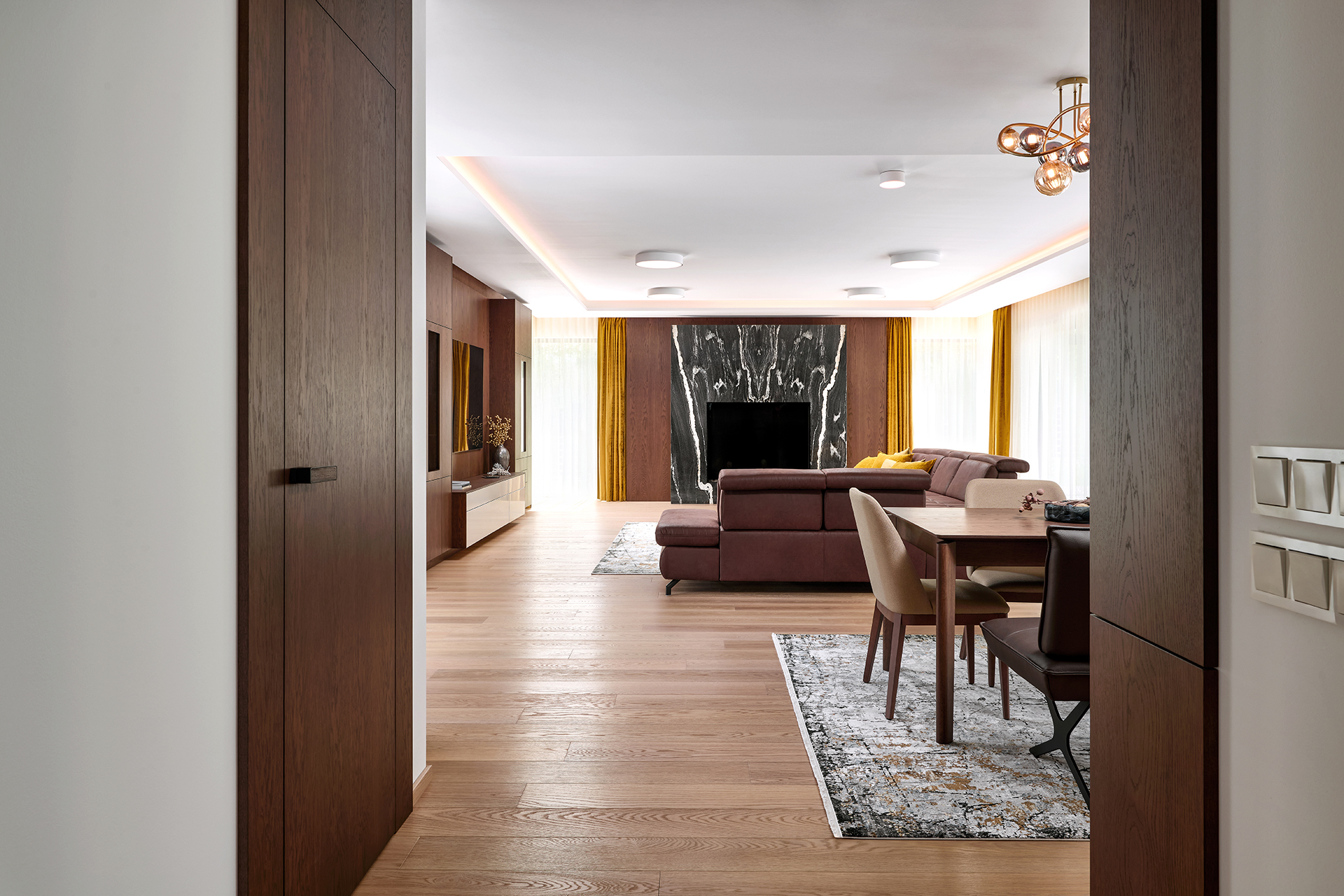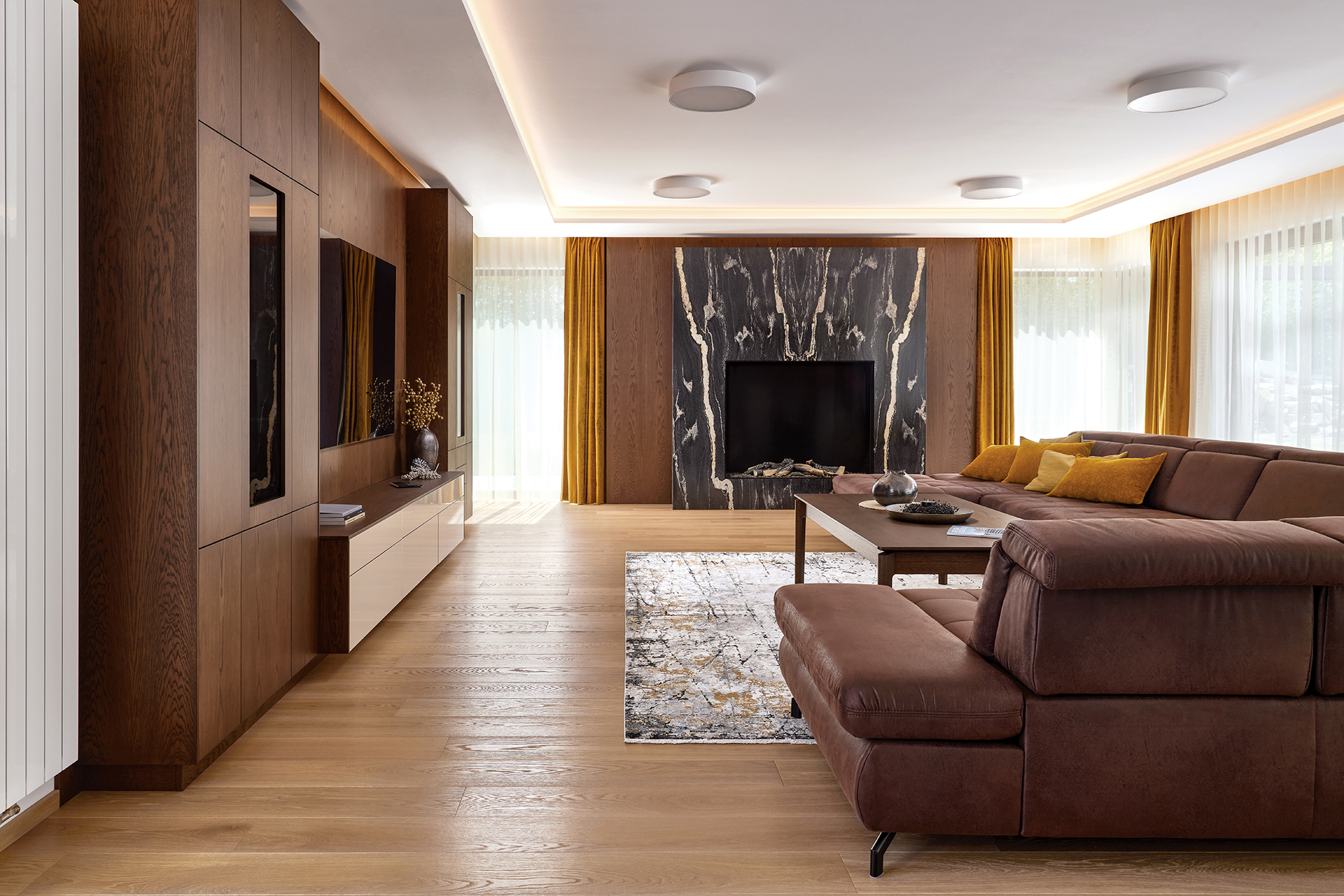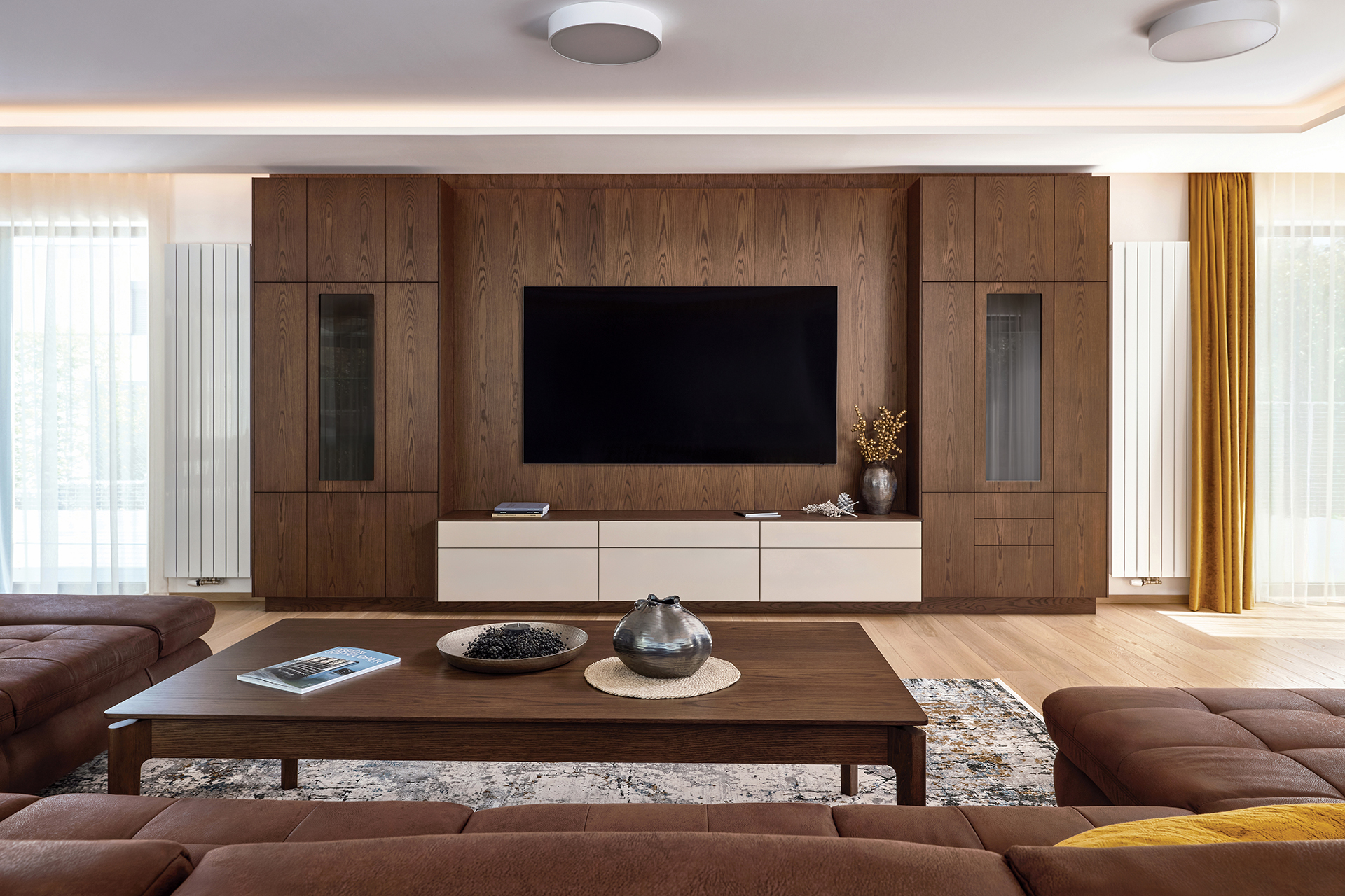 Obývací stěna propojuje z dýhy dub americký s lakem v odstínu Champagne, čímž vzniká nadčasová kombinace přírodních materiálů a jemného lesku. Skleněné vitríny, začleněné do dřevěného obložení, vnášejí do prostoru lehkost a zároveň poskytují místo pro osobní předměty, jež interiéru dodávají charakter a osobní příběh.