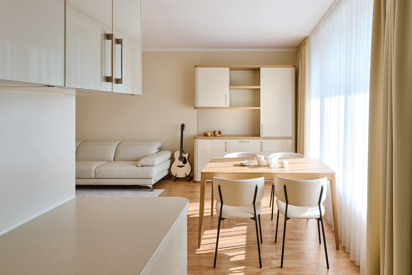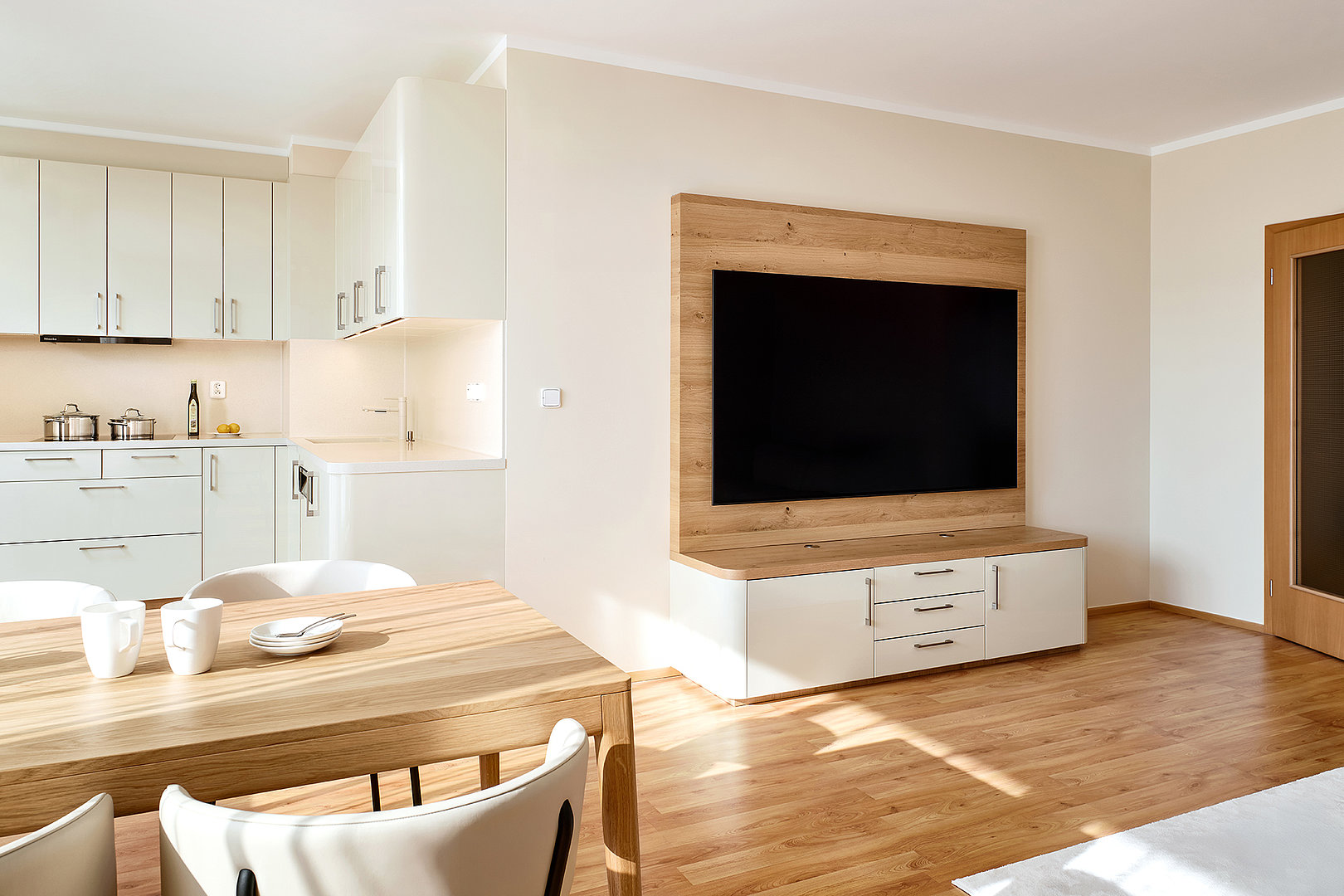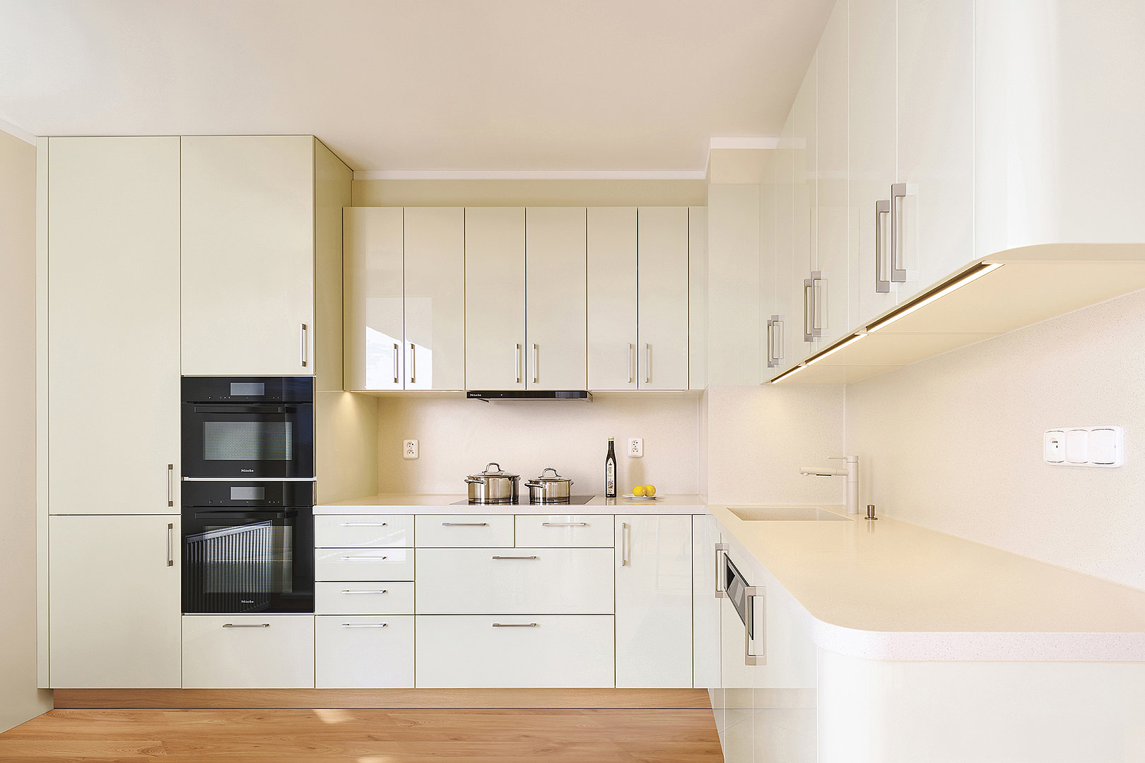 Tato realizace je ukázkou toho, jak může jednotný přístup k materiálům a detailům proměnit interiér v harmonický celek. Nadstandardní lesklý lak Light Ivory, použitý napříč celým prostorem, se stává jemným prvkem, který propojuje kuchyň, obývací pokoj, ložnici i chodbu. Spolu s charakteristickými oblinami vytváří dojem plynulosti, měkkosti a nadčasové elegance.
