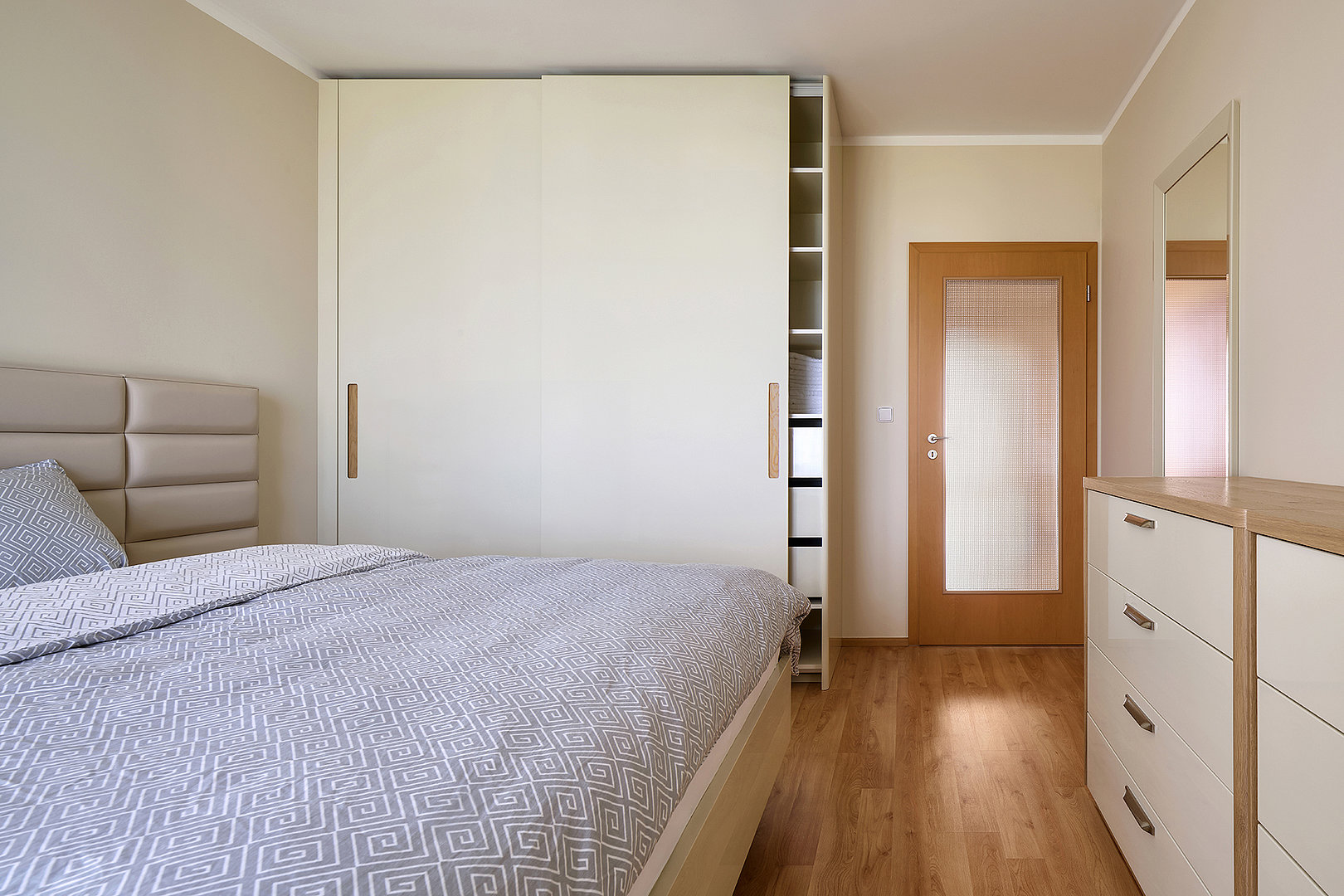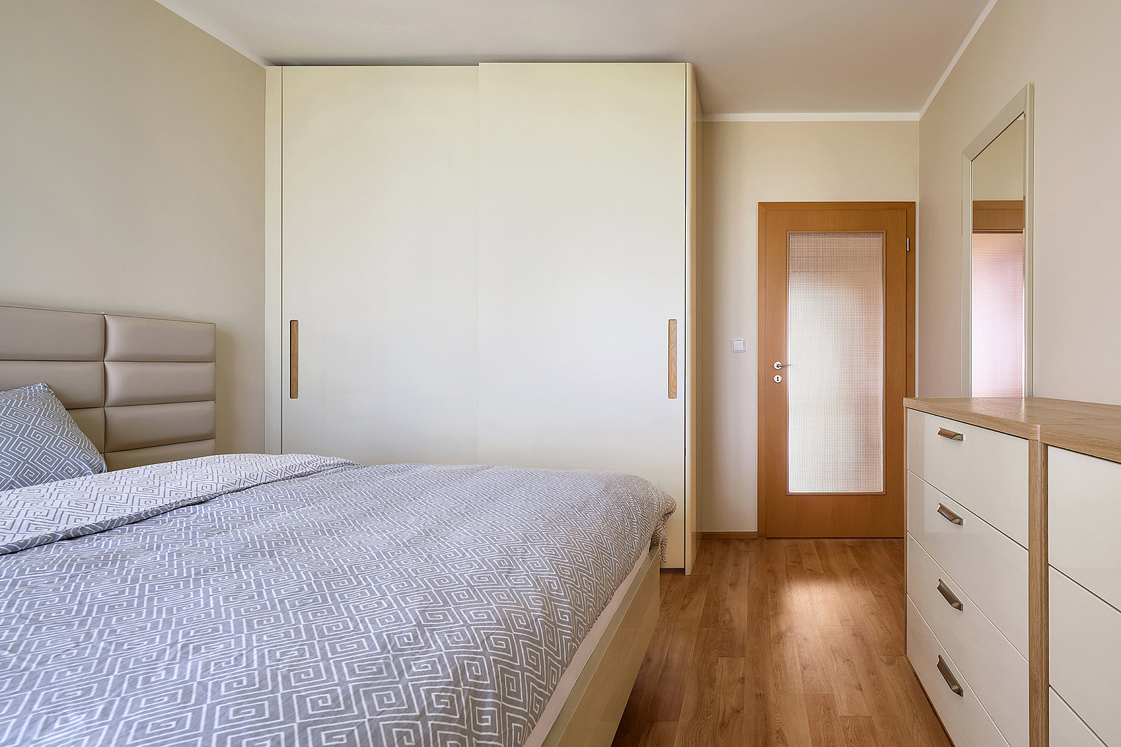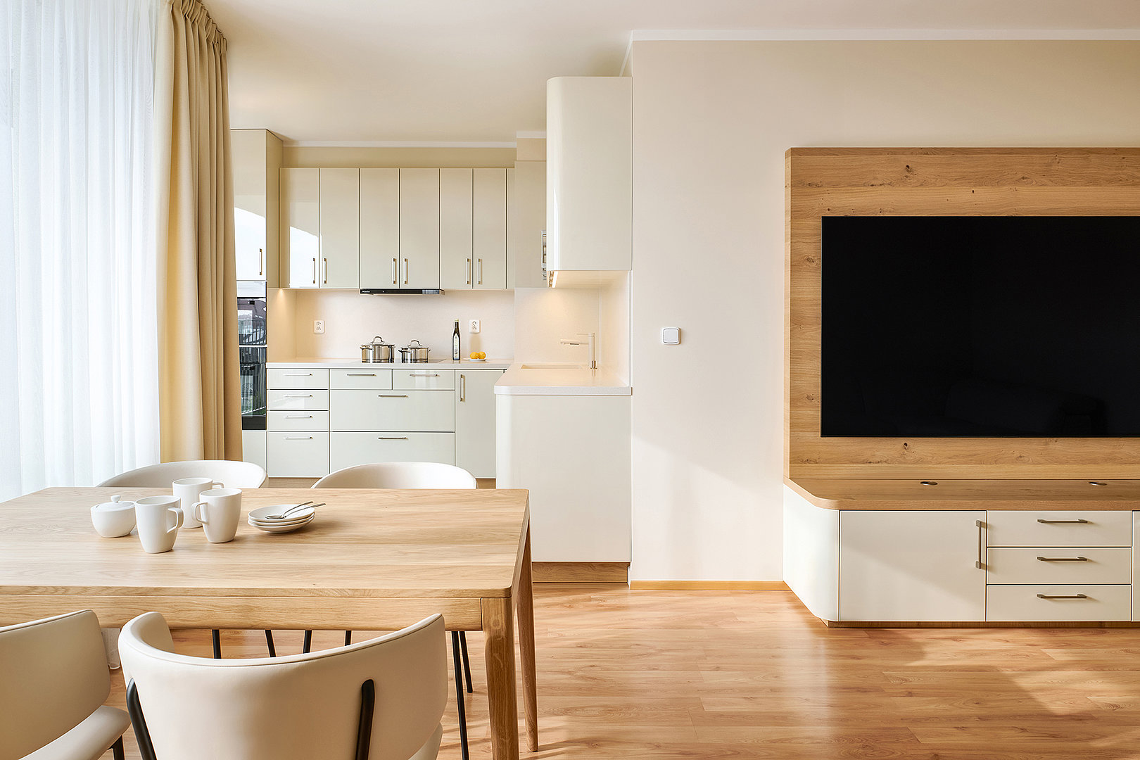 Tato realizace je ukázkou toho, jak může jednotný přístup k materiálům a detailům proměnit interiér v harmonický celek. Nadstandardní lesklý lak Light Ivory, použitý napříč celým prostorem, se stává jemným prvkem, který propojuje kuchyň, obývací pokoj, ložnici i chodbu. Spolu s charakteristickými oblinami vytváří dojem plynulosti, měkkosti a nadčasové elegance.