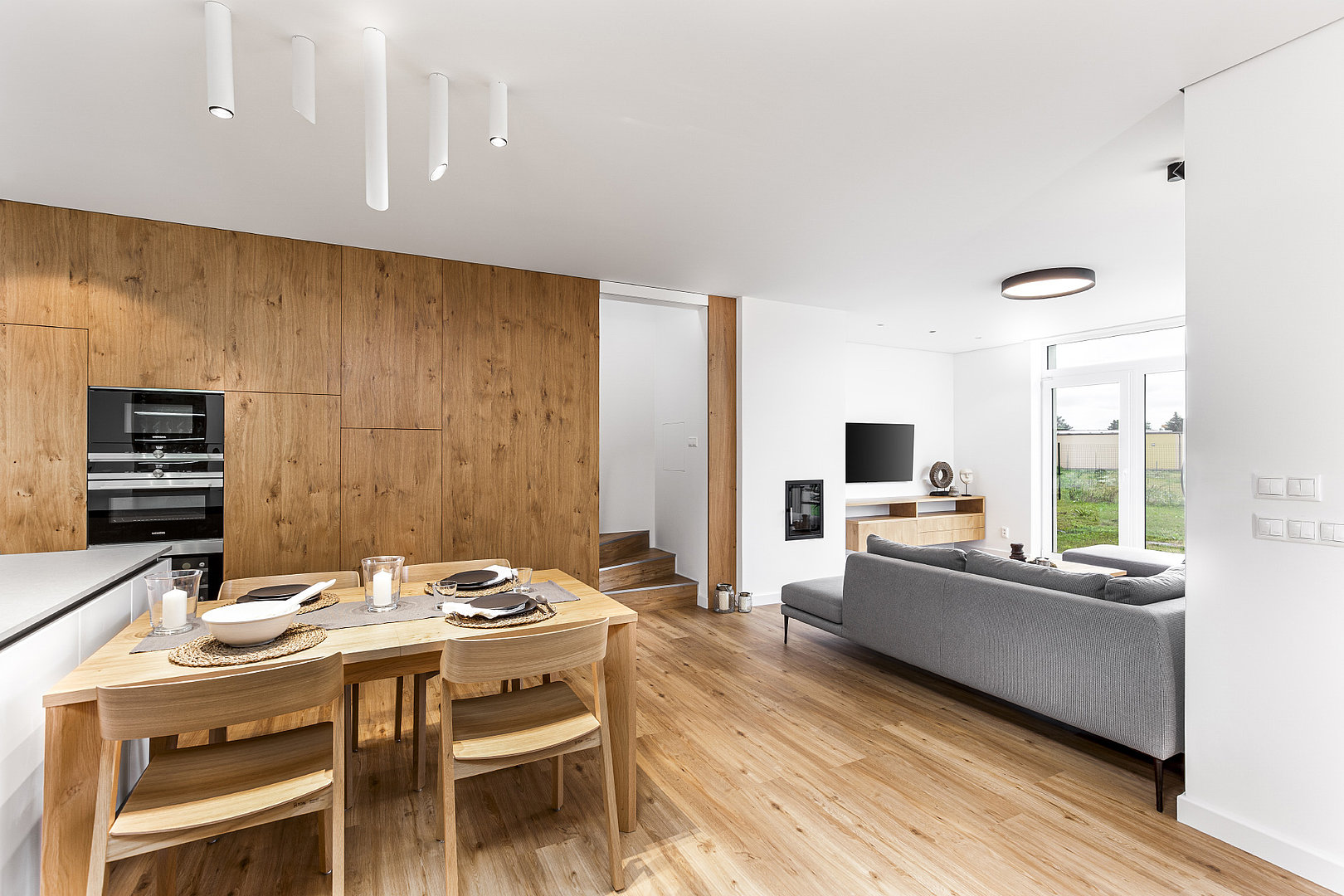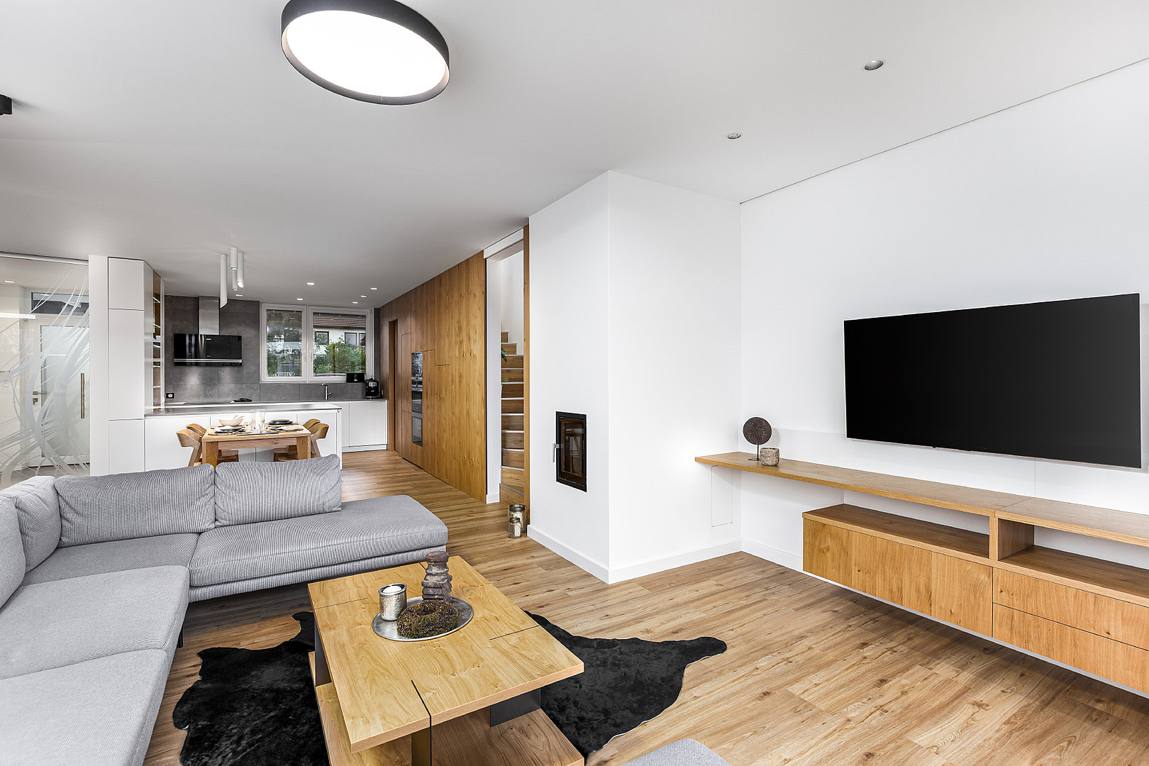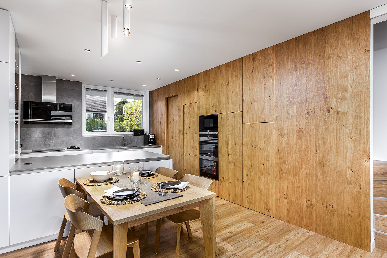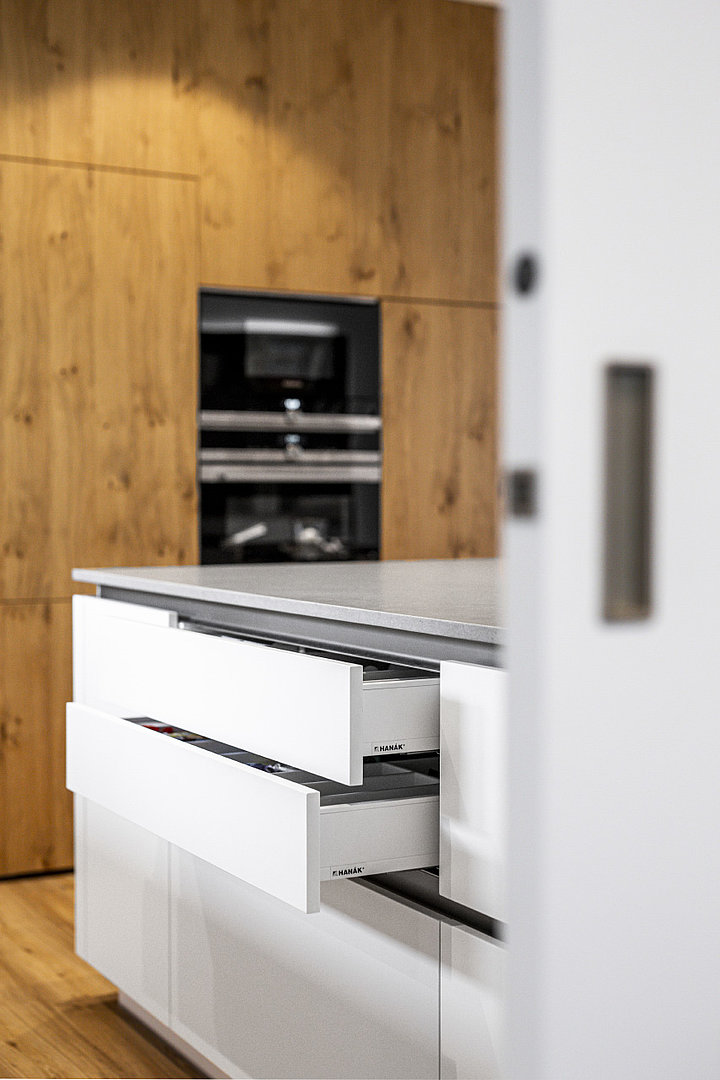 Realizace, ve které je vše důmyslně skryto a převládají čisté linie. Obklad stěny v kuchyni dává vyniknout struktuře přírodní dýhy a současně slouží pro další úložné prostory. Zvolená dýha je v oblíbené kombinaci s bílým lakem a v rámci HANÁK Interior Concept je promítnuta také do obývacího pokoje či knihovny.