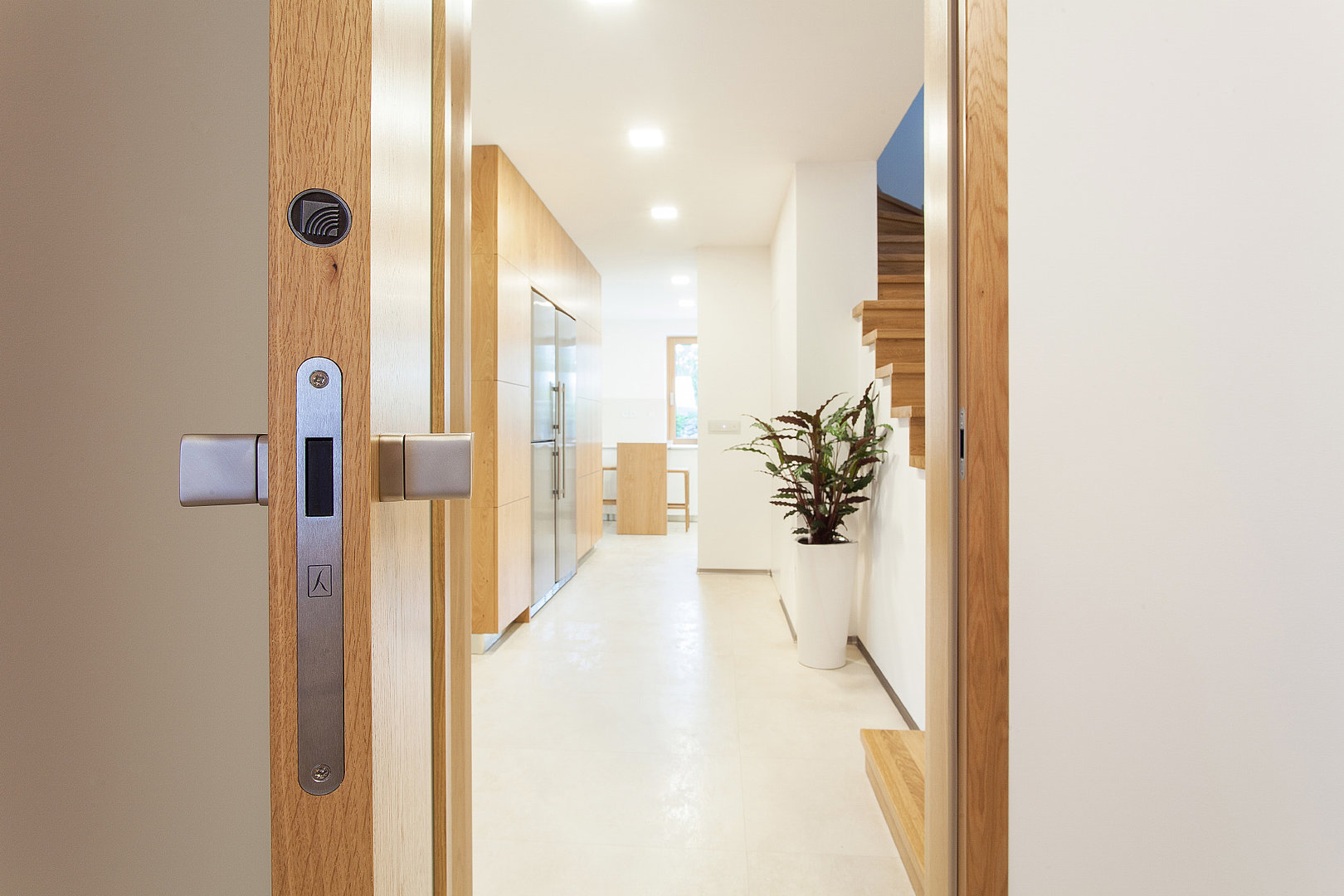 Interiér v přírodní dýze s interiérovými dveřmi a šatními skříněmi