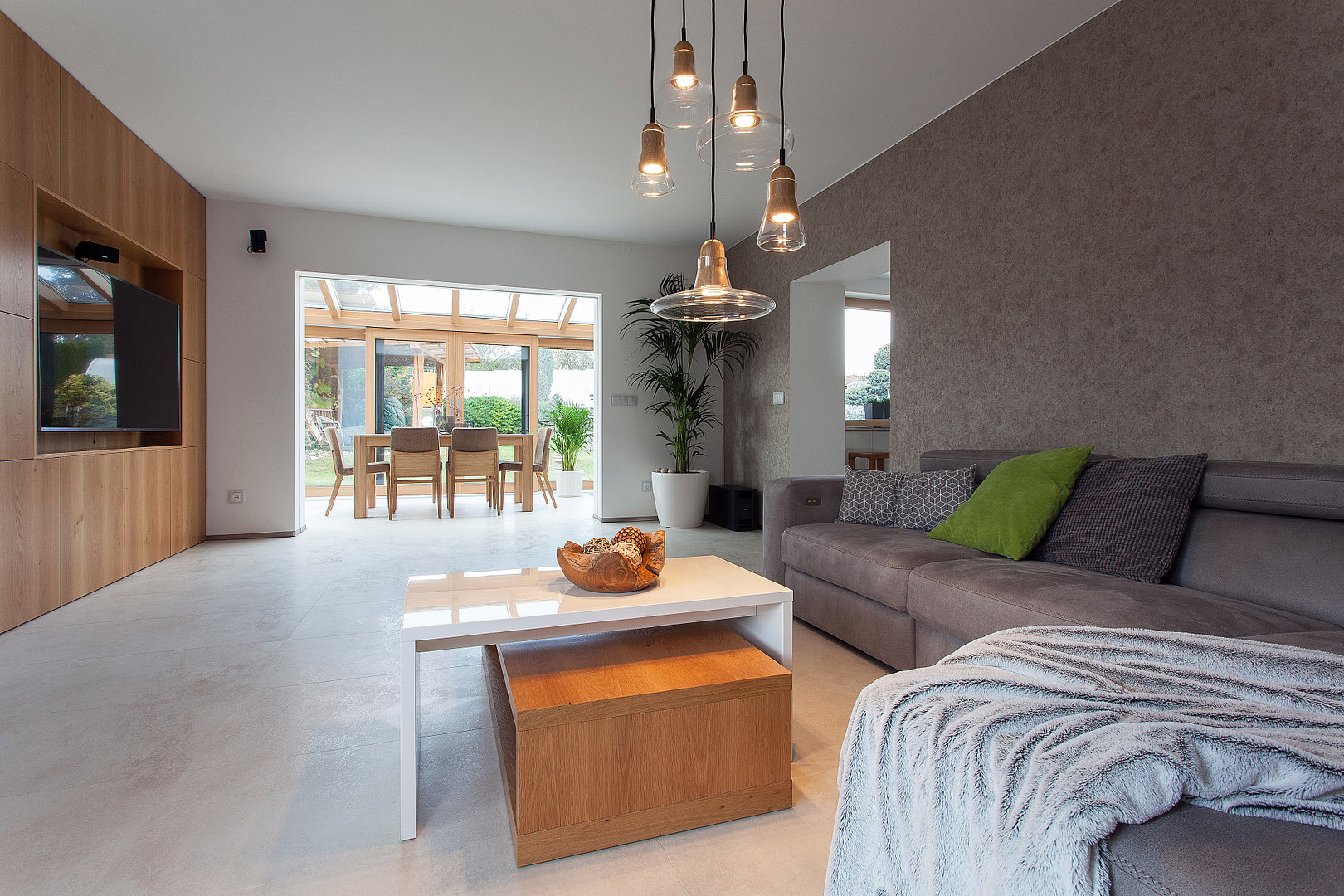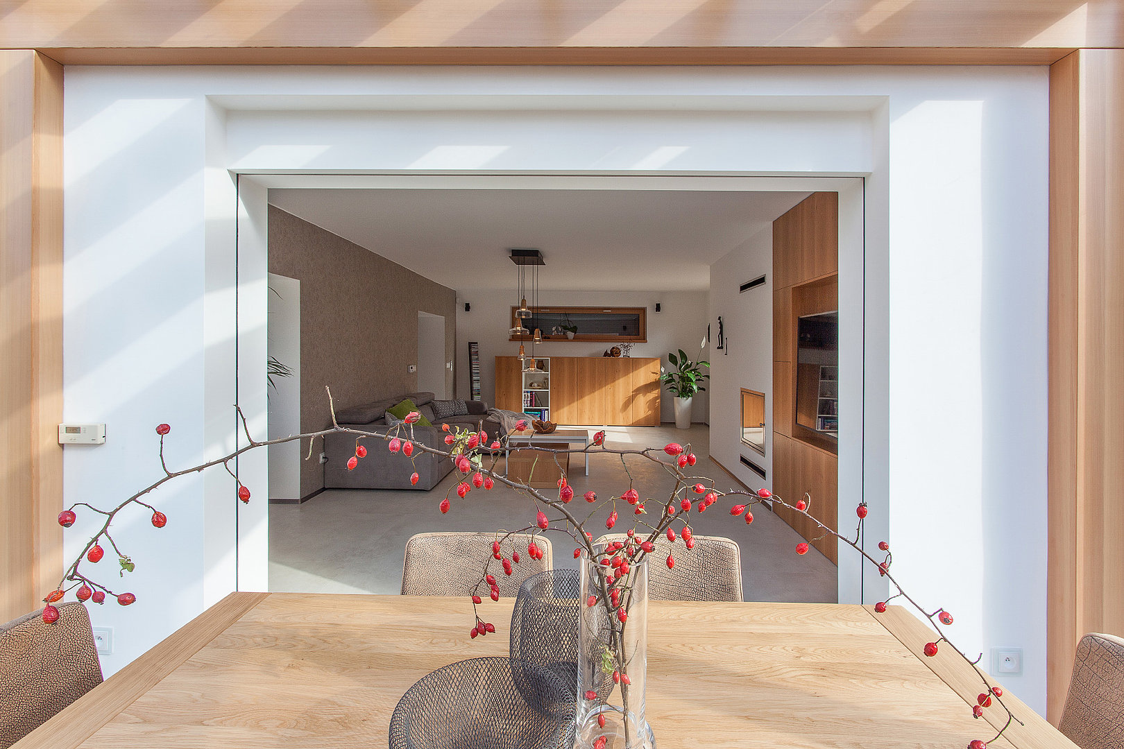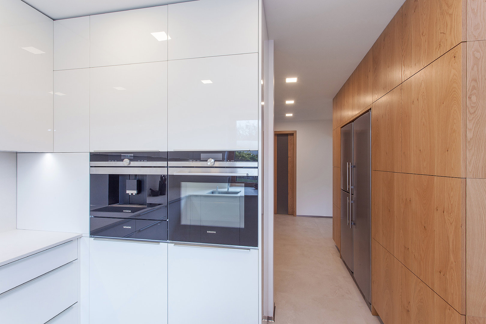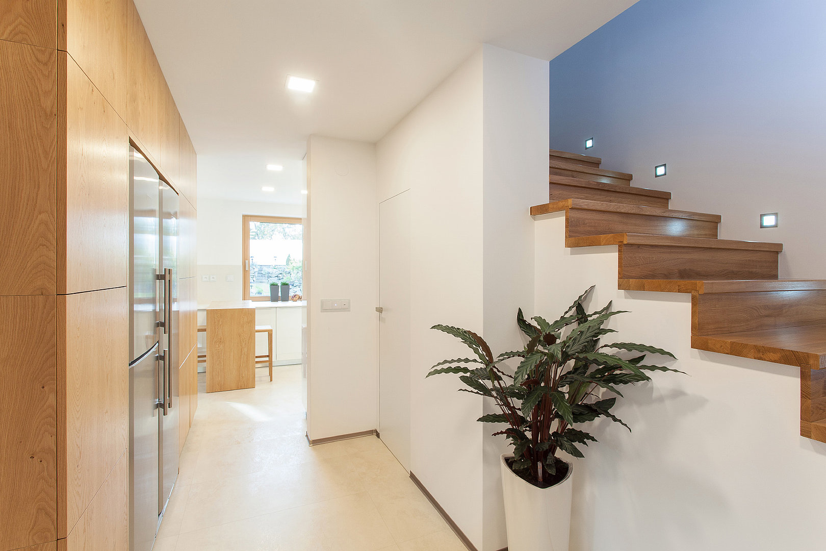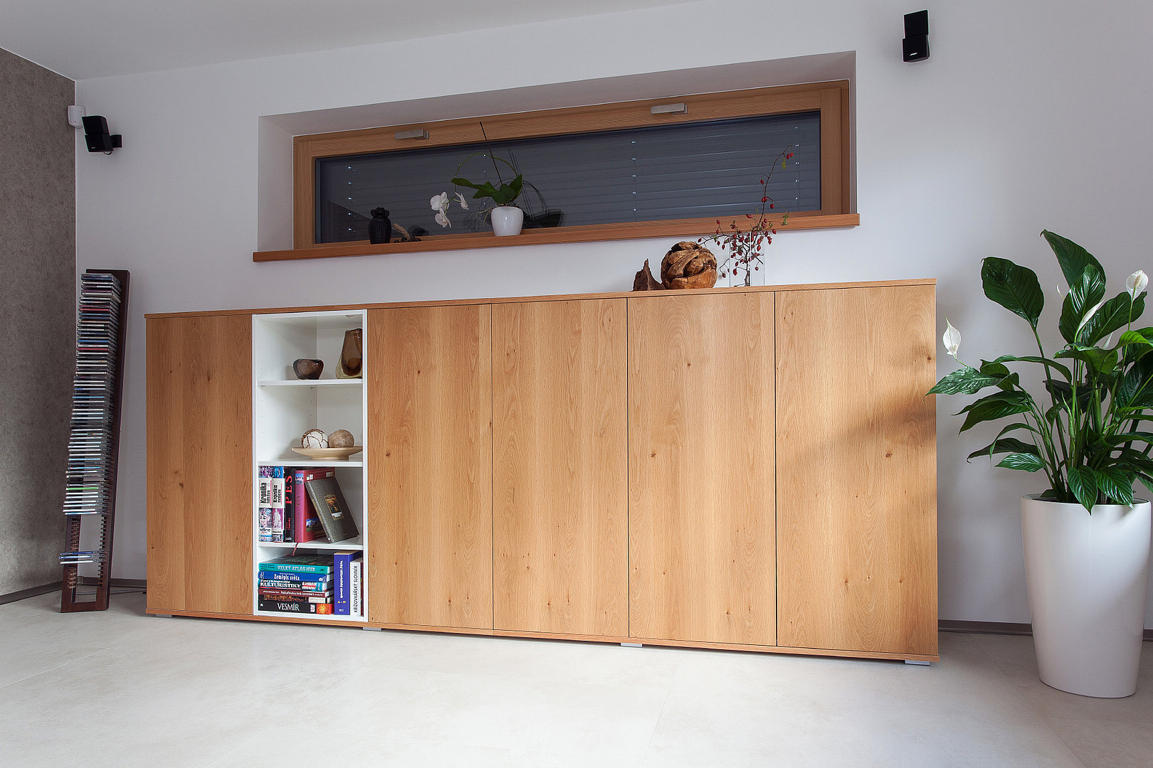 Interiéry navrhované na míru jsou úžasné v tom, že jsou zcela individuální. Tedy jedinečné a neopakovatelné. Následující dům jsme vybavili řadou nábytku v bílém laku polar doplněném dýhou dub rustikální přírodní.