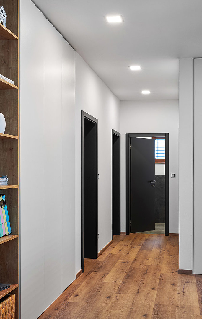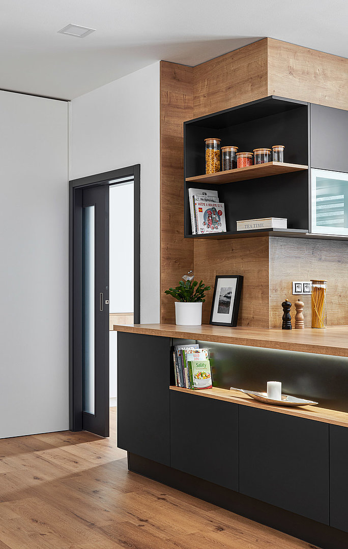 V realizaci bylo také hlavním úkolem designérů sladění kuchyně s interiérovými dveřmi, které na ni v otevřeném prostoru přímo navazují. Aby do chodby proudilo světlo, jsou na tuto pozici použity dveře BOSTON s prosklením. Ostatní dveře jsou model MILLENIUM.