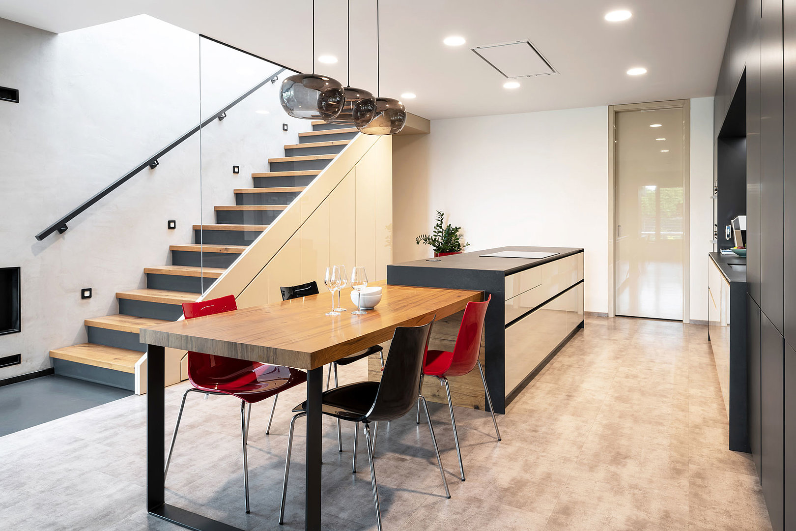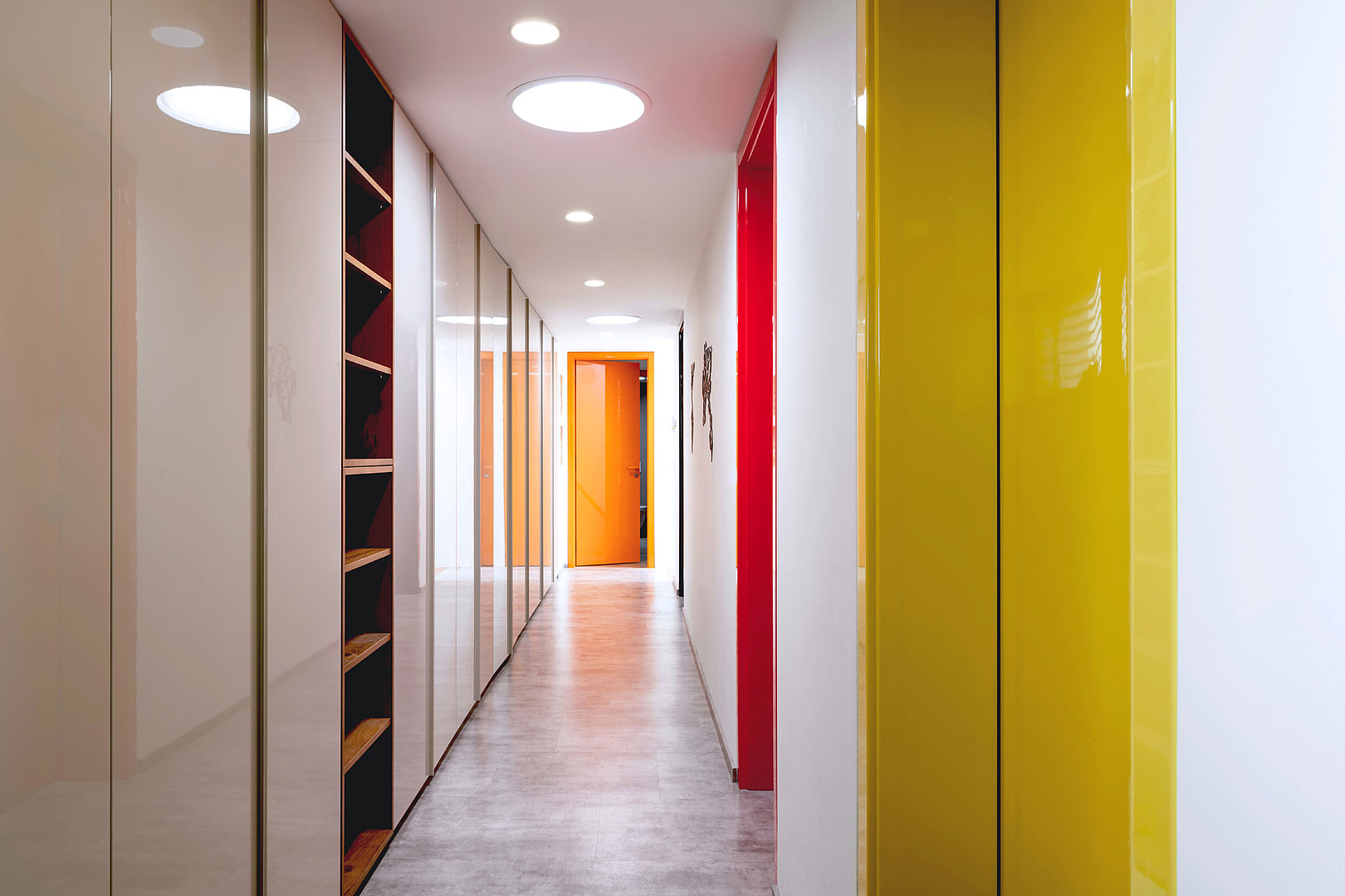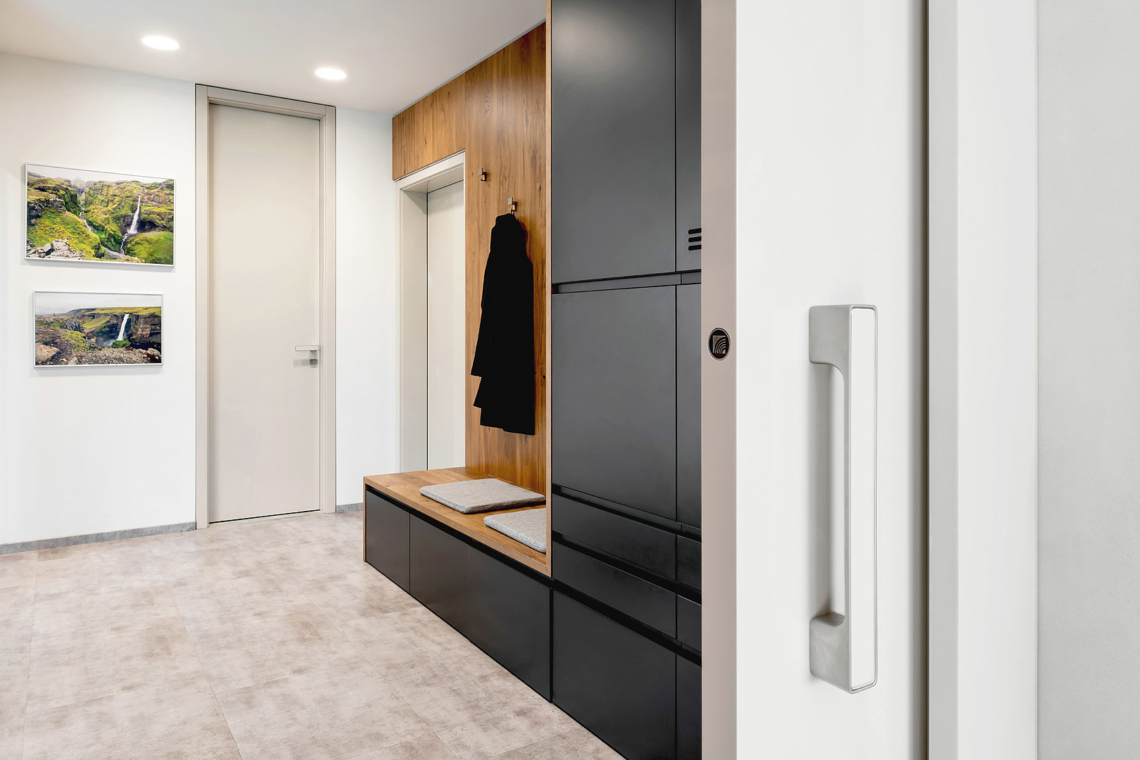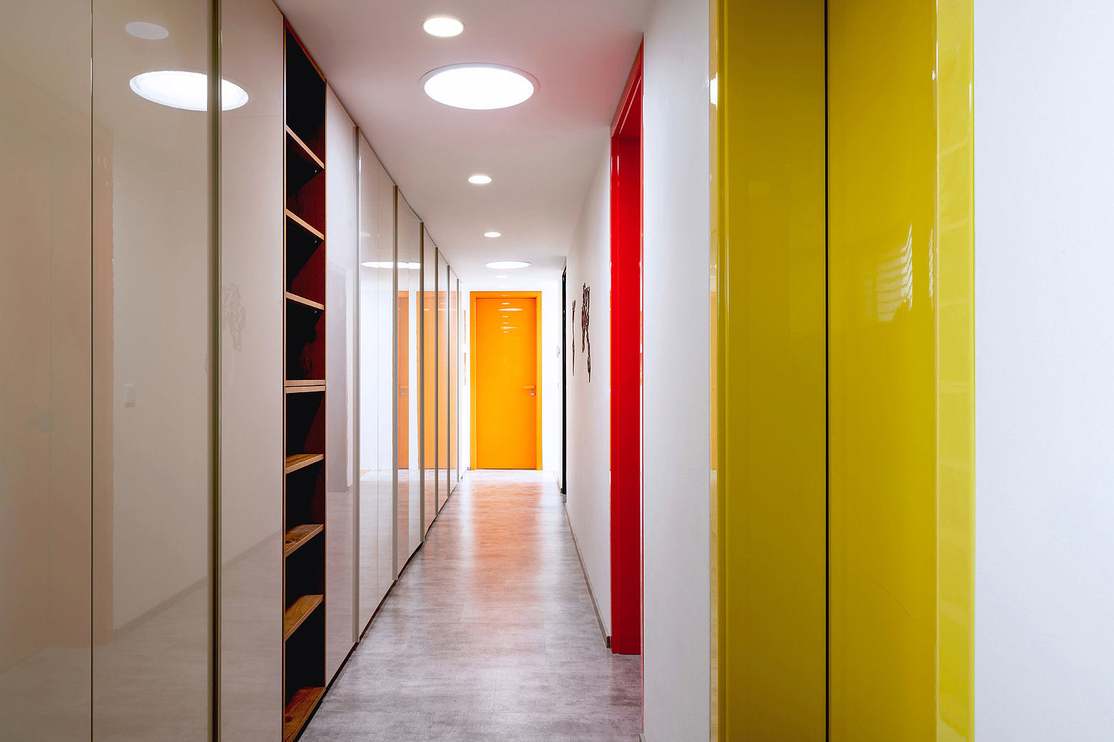 Moderní interiér s řadou interiérových dveří jak otevíravých, tak posuvných a s různou výškou. V přízemí domu jsou dveře v lakovaném provedení v odstínu champagne. V patře se nachází pestrá paleta barevných dveří ve vysokém lesku, které od sebe jednotlivé místnosti rozlišují.
