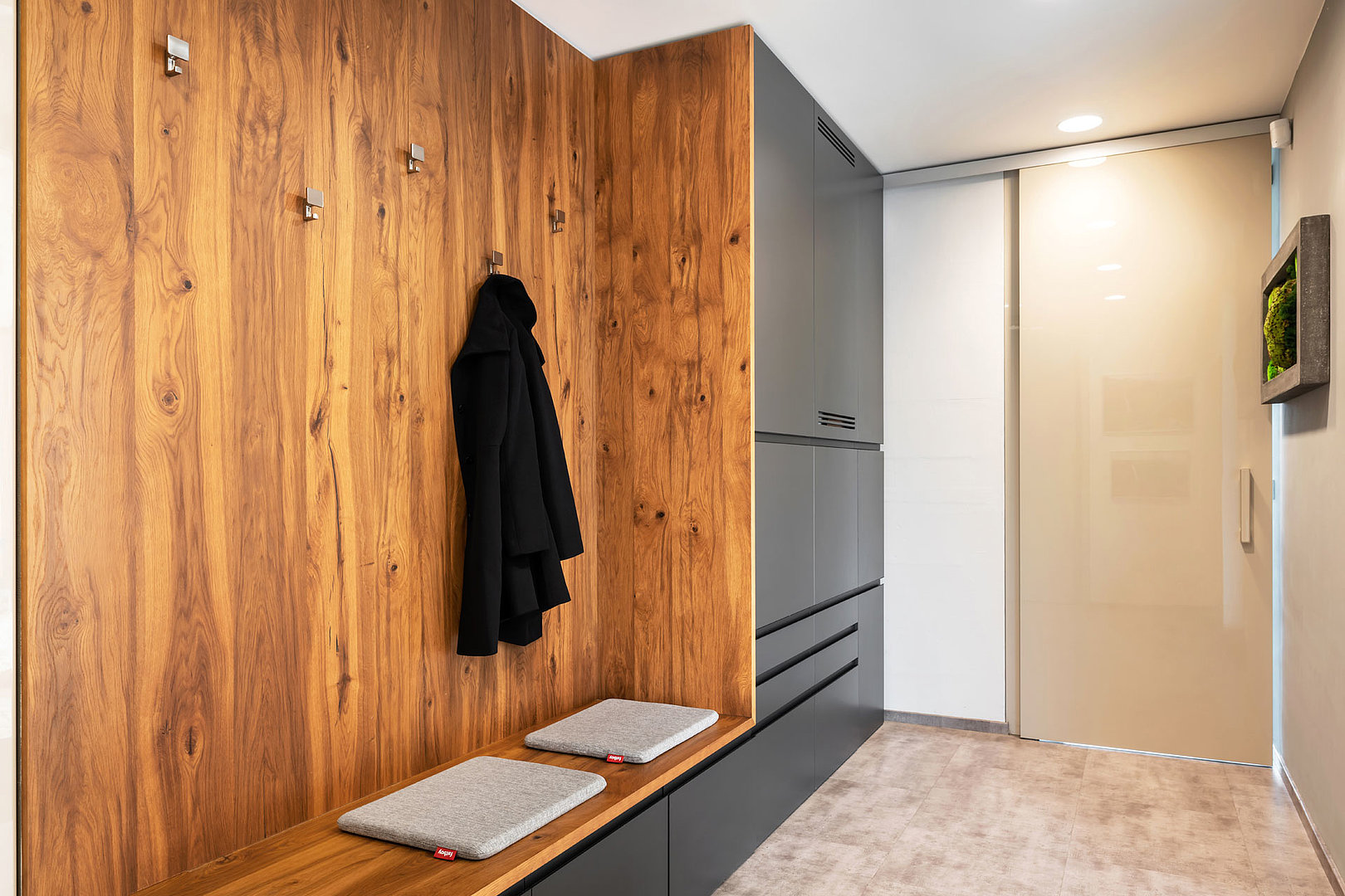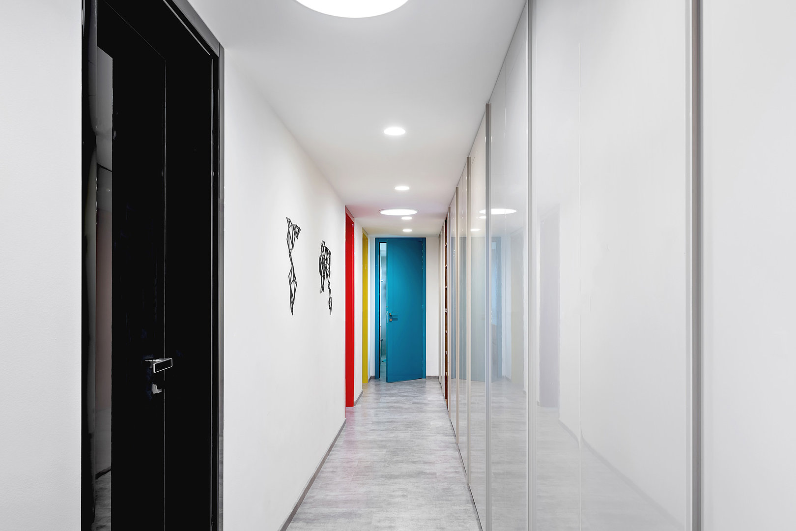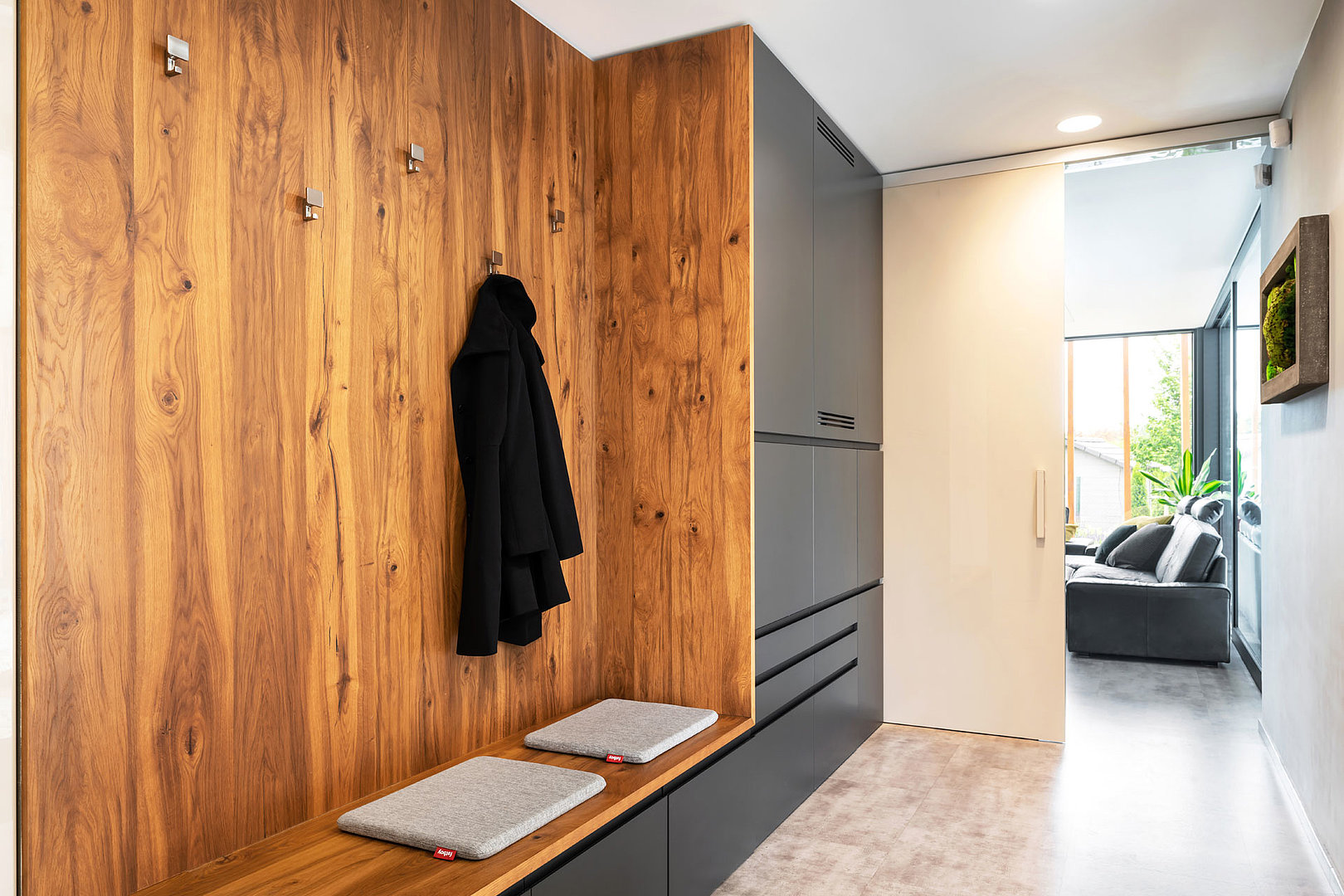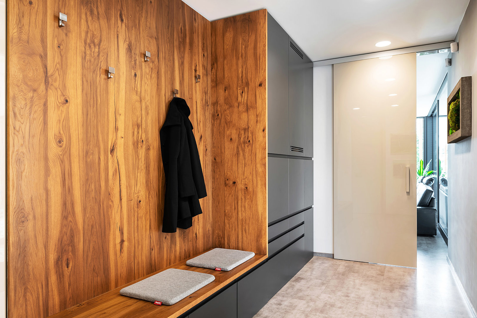 Moderní interiér s řadou interiérových dveří jak otevíravých, tak posuvných a s různou výškou. V přízemí domu jsou dveře v lakovaném provedení v odstínu champagne. V patře se nachází pestrá paleta barevných dveří ve vysokém lesku, které od sebe jednotlivé místnosti rozlišují.