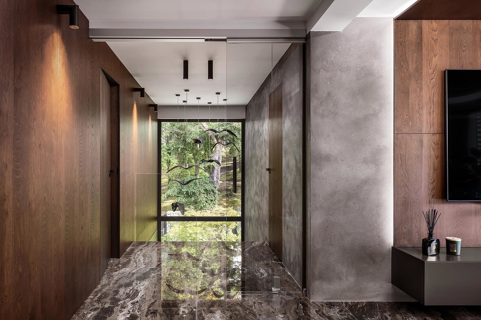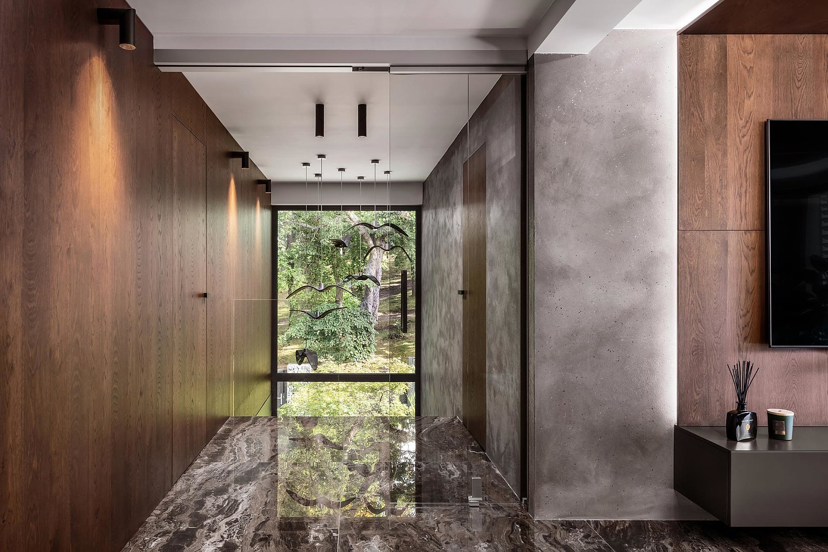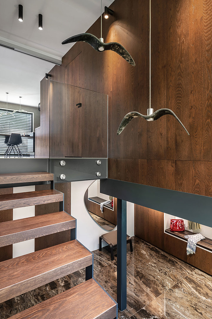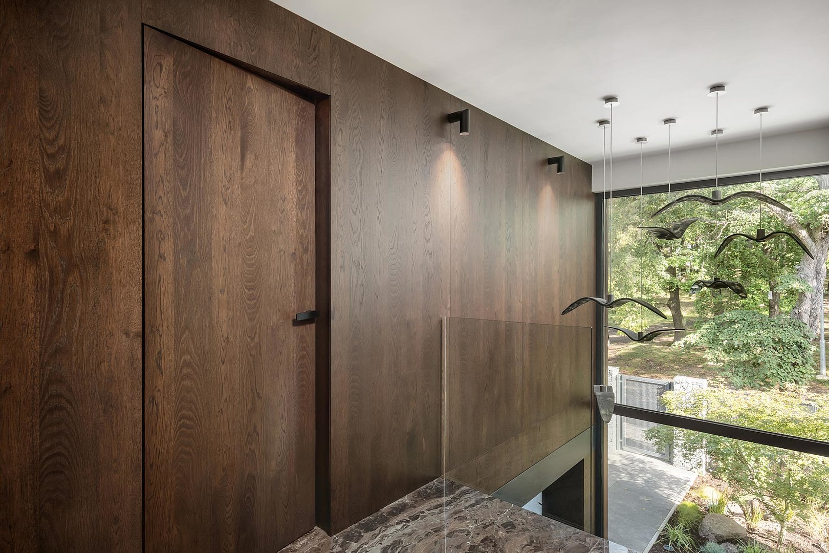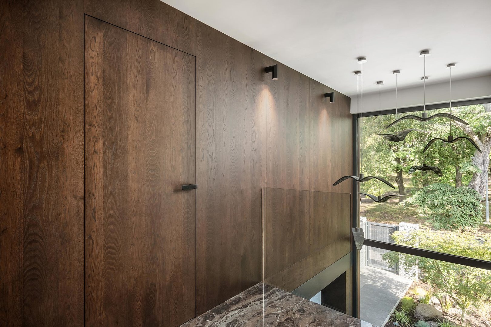 Krásné otevíravé interiérové dveře SPACE v prémiové dýze. Dýha mořená do příjemného hnědého odstínu je použita na nábytek a obklady stěn v rámci celém interiéru.