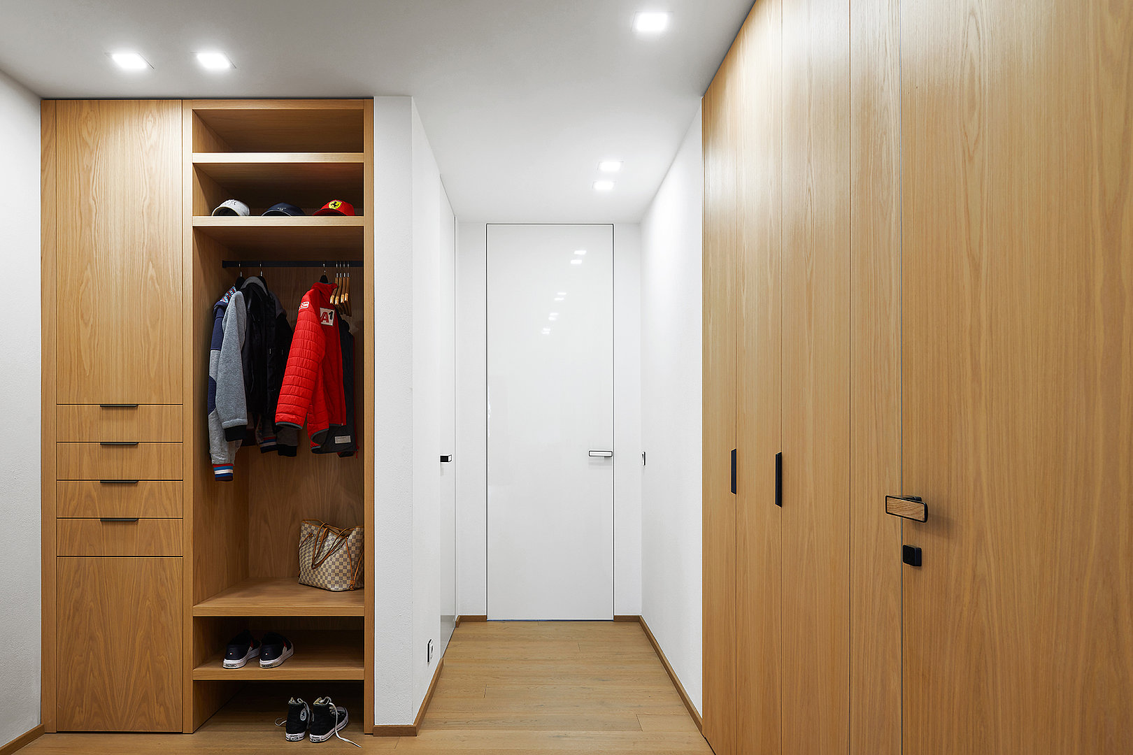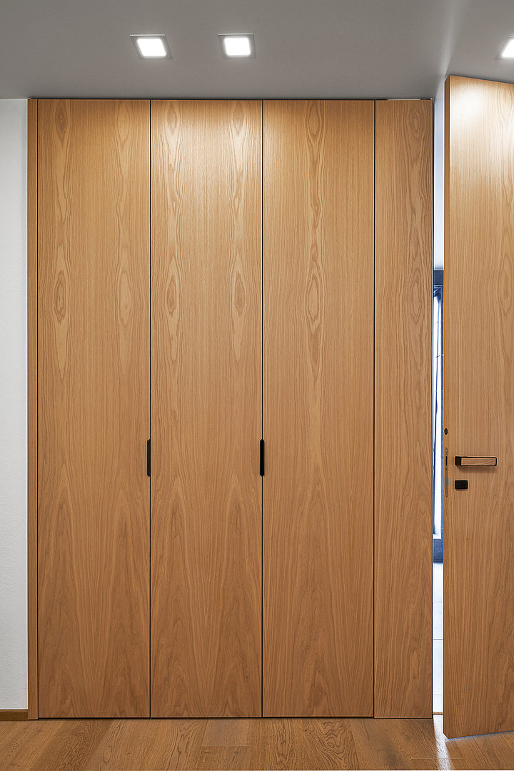 Interiérové dveře v kombinaci přírodní dýhy a bílého laku. Jedinečná záležitost propojení materiálů i na ostatní interiérový nábytek, včetně jejich návazností.