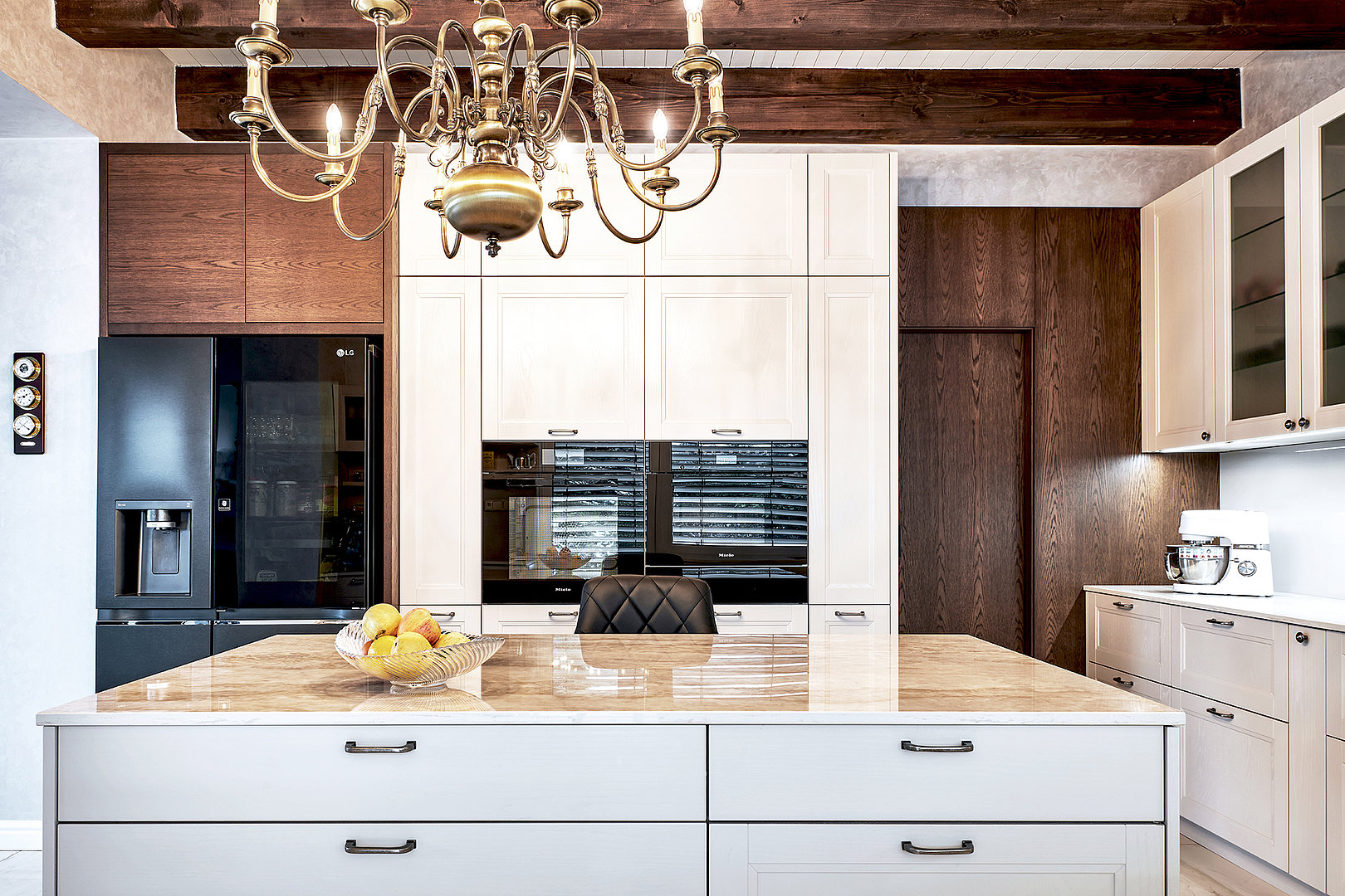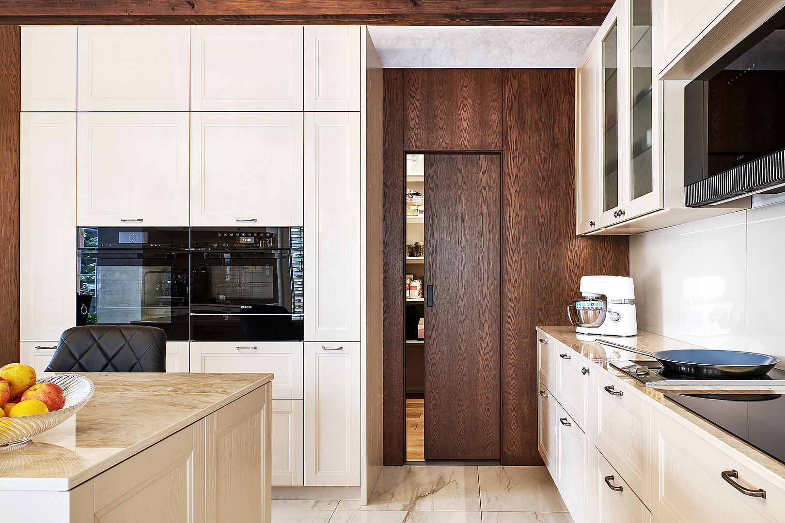 Velmi oblíbené jsou skryté místnosti na potraviny v kuchyni, které jsme tentokrát oddělili vestavěnými dveřmi SPACE v nádherné přírodní dýze.