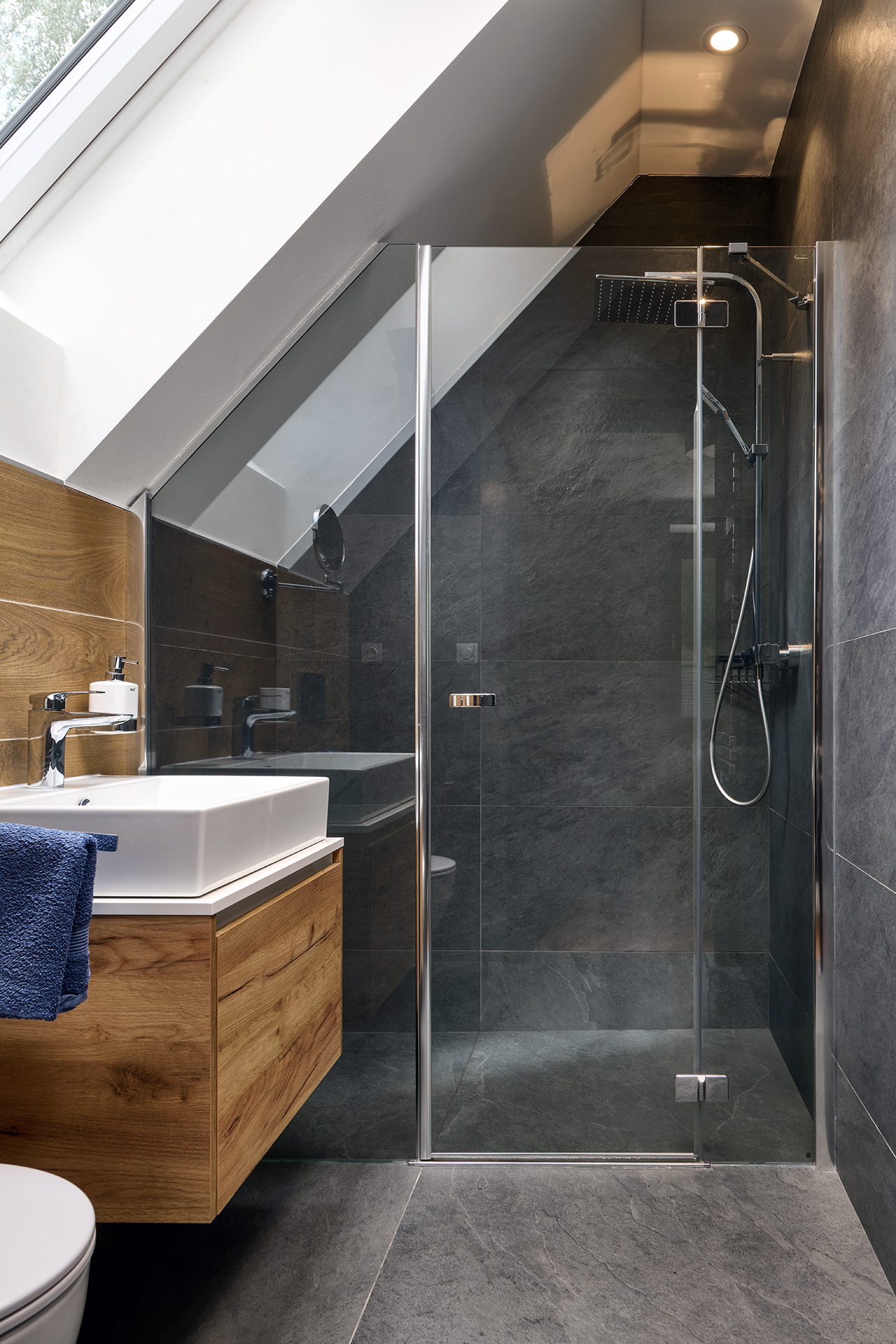 Součástí domu je také sauna, která slouží jako soukromé místo pro regeneraci těla i mysli. Přírodní materiály a teplé tóny harmonicky doplňují celkové ladění a navozují pocit hlubokého klidu po náročném dni.